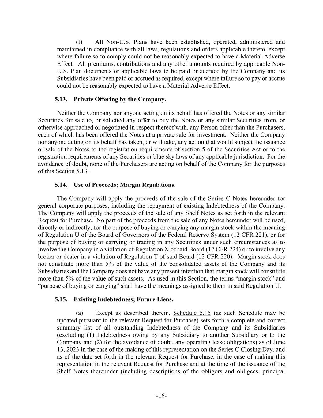 -16- (f) All Non-U.S. Plans have been established, operated, administered and maintained in compliance with all laws, regulations and orders applicable thereto, except where failure so to comply could not be reasonably expected to have a Material Adverse Effect. All premiums, contributions and any other amounts required by applicable Non- U.S. Plan documents or applicable laws to be paid or accrued by the Company and its Subsidiaries have been paid or accrued as required, except where failure so to pay or accrue could not be reasonably expected to have a Material Adverse Effect. 5.13. Private Offering by the Company. Neither the Company nor anyone acting on its behalf has offered the Notes or any similar Securities for sale to, or solicited any offer to buy the Notes or any similar Securities from, or otherwise approached or negotiated in respect thereof with, any Person other than the Purchasers, each of which has been offered the Notes at a private sale for investment. Neither the Company nor anyone acting on its behalf has taken, or will take, any action that would subject the issuance or sale of the Notes to the registration requirements of section 5 of the Securities Act or to the registration requirements of any Securities or blue sky laws of any applicable jurisdiction. For the avoidance of doubt, none of the Purchasers are acting on behalf of the Company for the purposes of this Section 5.13. 5.14. Use of Proceeds; Margin Regulations. The Company will apply the proceeds of the sale of the Series C Notes hereunder for general corporate purposes, including the repayment of existing Indebtedness of the Company. The Company will apply the proceeds of the sale of any Shelf Notes as set forth in the relevant Request for Purchase. No part of the proceeds from the sale of any Notes hereunder will be used, directly or indirectly, for the purpose of buying or carrying any margin stock within the meaning of Regulation U of the Board of Governors of the Federal Reserve System (12 CFR 221), or for the purpose of buying or carrying or trading in any Securities under such circumstances as to involve the Company in a violation of Regulation X of said Board (12 CFR 224) or to involve any broker or dealer in a violation of Regulation T of said Board (12 CFR 220). Margin stock does not constitute more than 5% of the value of the consolidated assets of the Company and its Subsidiaries and the Company does not have any present intention that margin stock will constitute more than 5% of the value of such assets. As used in this Section, the terms “margin stock” and “purpose of buying or carrying” shall have the meanings assigned to them in said Regulation U. 5.15. Existing Indebtedness; Future Liens. (a) Except as described therein, Schedule 5.15 (as such Schedule may be updated pursuant to the relevant Request for Purchase) sets forth a complete and correct summary list of all outstanding Indebtedness of the Company and its Subsidiaries (excluding (1) Indebtedness owing by any Subsidiary to another Subsidiary or to the Company and (2) for the avoidance of doubt, any operating lease obligations) as of June 13, 2023 in the case of the making of this representation on the Series C Closing Day, and as of the date set forth in the relevant Request for Purchase, in the case of making this representation in the relevant Request for Purchase and at the time of the issuance of the Shelf Notes thereunder (including descriptions of the obligors and obligees, principal