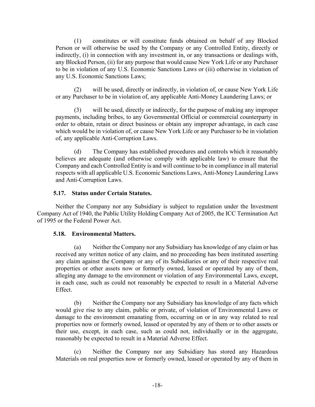 -18- (1) constitutes or will constitute funds obtained on behalf of any Blocked Person or will otherwise be used by the Company or any Controlled Entity, directly or indirectly, (i) in connection with any investment in, or any transactions or dealings with, any Blocked Person, (ii) for any purpose that would cause New York Life or any Purchaser to be in violation of any U.S. Economic Sanctions Laws or (iii) otherwise in violation of any U.S. Economic Sanctions Laws; (2) will be used, directly or indirectly, in violation of, or cause New York Life or any Purchaser to be in violation of, any applicable Anti-Money Laundering Laws; or (3) will be used, directly or indirectly, for the purpose of making any improper payments, including bribes, to any Governmental Official or commercial counterparty in order to obtain, retain or direct business or obtain any improper advantage, in each case which would be in violation of, or cause New York Life or any Purchaser to be in violation of, any applicable Anti-Corruption Laws. (d) The Company has established procedures and controls which it reasonably believes are adequate (and otherwise comply with applicable law) to ensure that the Company and each Controlled Entity is and will continue to be in compliance in all material respects with all applicable U.S. Economic Sanctions Laws, Anti-Money Laundering Laws and Anti-Corruption Laws. 5.17. Status under Certain Statutes. Neither the Company nor any Subsidiary is subject to regulation under the Investment Company Act of 1940, the Public Utility Holding Company Act of 2005, the ICC Termination Act of 1995 or the Federal Power Act. 5.18. Environmental Matters. (a) Neither the Company nor any Subsidiary has knowledge of any claim or has received any written notice of any claim, and no proceeding has been instituted asserting any claim against the Company or any of its Subsidiaries or any of their respective real properties or other assets now or formerly owned, leased or operated by any of them, alleging any damage to the environment or violation of any Environmental Laws, except, in each case, such as could not reasonably be expected to result in a Material Adverse Effect. (b) Neither the Company nor any Subsidiary has knowledge of any facts which would give rise to any claim, public or private, of violation of Environmental Laws or damage to the environment emanating from, occurring on or in any way related to real properties now or formerly owned, leased or operated by any of them or to other assets or their use, except, in each case, such as could not, individually or in the aggregate, reasonably be expected to result in a Material Adverse Effect. (c) Neither the Company nor any Subsidiary has stored any Hazardous Materials on real properties now or formerly owned, leased or operated by any of them in