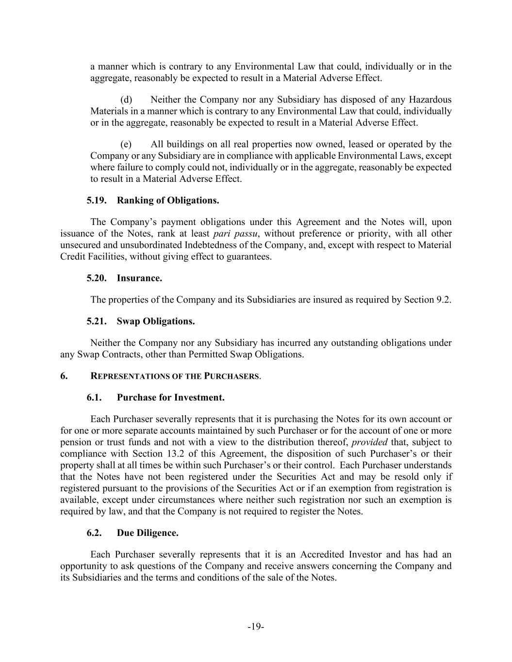 -19- a manner which is contrary to any Environmental Law that could, individually or in the aggregate, reasonably be expected to result in a Material Adverse Effect. (d) Neither the Company nor any Subsidiary has disposed of any Hazardous Materials in a manner which is contrary to any Environmental Law that could, individually or in the aggregate, reasonably be expected to result in a Material Adverse Effect. (e) All buildings on all real properties now owned, leased or operated by the Company or any Subsidiary are in compliance with applicable Environmental Laws, except where failure to comply could not, individually or in the aggregate, reasonably be expected to result in a Material Adverse Effect. 5.19. Ranking of Obligations. The Company’s payment obligations under this Agreement and the Notes will, upon issuance of the Notes, rank at least pari passu, without preference or priority, with all other unsecured and unsubordinated Indebtedness of the Company, and, except with respect to Material Credit Facilities, without giving effect to guarantees. 5.20. Insurance. The properties of the Company and its Subsidiaries are insured as required by Section 9.2. 5.21. Swap Obligations. Neither the Company nor any Subsidiary has incurred any outstanding obligations under any Swap Contracts, other than Permitted Swap Obligations. 6. REPRESENTATIONS OF THE PURCHASERS. 6.1. Purchase for Investment. Each Purchaser severally represents that it is purchasing the Notes for its own account or for one or more separate accounts maintained by such Purchaser or for the account of one or more pension or trust funds and not with a view to the distribution thereof, provided that, subject to compliance with Section 13.2 of this Agreement, the disposition of such Purchaser’s or their property shall at all times be within such Purchaser’s or their control. Each Purchaser understands that the Notes have not been registered under the Securities Act and may be resold only if registered pursuant to the provisions of the Securities Act or if an exemption from registration is available, except under circumstances where neither such registration nor such an exemption is required by law, and that the Company is not required to register the Notes. 6.2. Due Diligence. Each Purchaser severally represents that it is an Accredited Investor and has had an opportunity to ask questions of the Company and receive answers concerning the Company and its Subsidiaries and the terms and conditions of the sale of the Notes.
