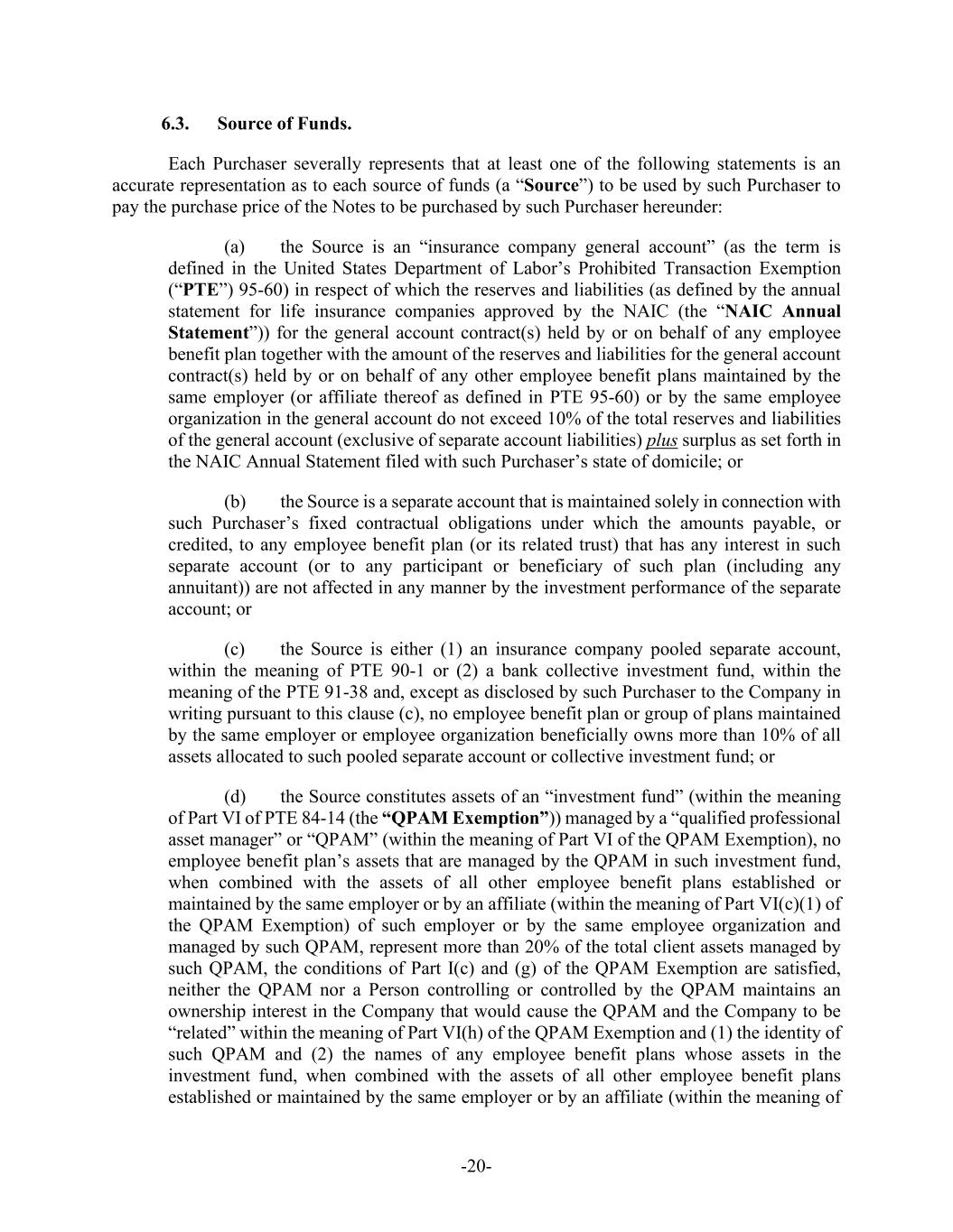 -20- 6.3. Source of Funds. Each Purchaser severally represents that at least one of the following statements is an accurate representation as to each source of funds (a “Source”) to be used by such Purchaser to pay the purchase price of the Notes to be purchased by such Purchaser hereunder: (a) the Source is an “insurance company general account” (as the term is defined in the United States Department of Labor’s Prohibited Transaction Exemption (“PTE”) 95-60) in respect of which the reserves and liabilities (as defined by the annual statement for life insurance companies approved by the NAIC (the “NAIC Annual Statement”)) for the general account contract(s) held by or on behalf of any employee benefit plan together with the amount of the reserves and liabilities for the general account contract(s) held by or on behalf of any other employee benefit plans maintained by the same employer (or affiliate thereof as defined in PTE 95-60) or by the same employee organization in the general account do not exceed 10% of the total reserves and liabilities of the general account (exclusive of separate account liabilities) plus surplus as set forth in the NAIC Annual Statement filed with such Purchaser’s state of domicile; or (b) the Source is a separate account that is maintained solely in connection with such Purchaser’s fixed contractual obligations under which the amounts payable, or credited, to any employee benefit plan (or its related trust) that has any interest in such separate account (or to any participant or beneficiary of such plan (including any annuitant)) are not affected in any manner by the investment performance of the separate account; or (c) the Source is either (1) an insurance company pooled separate account, within the meaning of PTE 90-1 or (2) a bank collective investment fund, within the meaning of the PTE 91-38 and, except as disclosed by such Purchaser to the Company in writing pursuant to this clause (c), no employee benefit plan or group of plans maintained by the same employer or employee organization beneficially owns more than 10% of all assets allocated to such pooled separate account or collective investment fund; or (d) the Source constitutes assets of an “investment fund” (within the meaning of Part VI of PTE 84-14 (the “QPAM Exemption”)) managed by a “qualified professional asset manager” or “QPAM” (within the meaning of Part VI of the QPAM Exemption), no employee benefit plan’s assets that are managed by the QPAM in such investment fund, when combined with the assets of all other employee benefit plans established or maintained by the same employer or by an affiliate (within the meaning of Part VI(c)(1) of the QPAM Exemption) of such employer or by the same employee organization and managed by such QPAM, represent more than 20% of the total client assets managed by such QPAM, the conditions of Part I(c) and (g) of the QPAM Exemption are satisfied, neither the QPAM nor a Person controlling or controlled by the QPAM maintains an ownership interest in the Company that would cause the QPAM and the Company to be “related” within the meaning of Part VI(h) of the QPAM Exemption and (1) the identity of such QPAM and (2) the names of any employee benefit plans whose assets in the investment fund, when combined with the assets of all other employee benefit plans established or maintained by the same employer or by an affiliate (within the meaning of