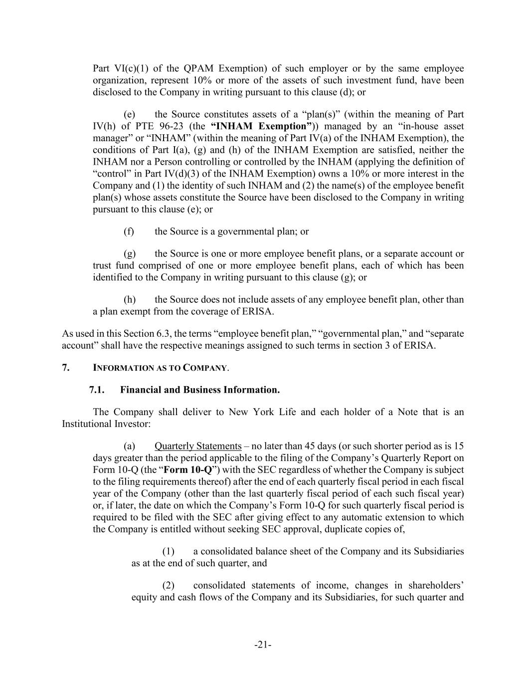 -21- Part VI(c)(1) of the QPAM Exemption) of such employer or by the same employee organization, represent 10% or more of the assets of such investment fund, have been disclosed to the Company in writing pursuant to this clause (d); or (e) the Source constitutes assets of a “plan(s)” (within the meaning of Part IV(h) of PTE 96-23 (the “INHAM Exemption”)) managed by an “in-house asset manager” or “INHAM” (within the meaning of Part IV(a) of the INHAM Exemption), the conditions of Part I(a), (g) and (h) of the INHAM Exemption are satisfied, neither the INHAM nor a Person controlling or controlled by the INHAM (applying the definition of “control” in Part IV(d)(3) of the INHAM Exemption) owns a 10% or more interest in the Company and (1) the identity of such INHAM and (2) the name(s) of the employee benefit plan(s) whose assets constitute the Source have been disclosed to the Company in writing pursuant to this clause (e); or (f) the Source is a governmental plan; or (g) the Source is one or more employee benefit plans, or a separate account or trust fund comprised of one or more employee benefit plans, each of which has been identified to the Company in writing pursuant to this clause (g); or (h) the Source does not include assets of any employee benefit plan, other than a plan exempt from the coverage of ERISA. As used in this Section 6.3, the terms “employee benefit plan,” “governmental plan,” and “separate account” shall have the respective meanings assigned to such terms in section 3 of ERISA. 7. INFORMATION AS TO COMPANY. 7.1. Financial and Business Information. The Company shall deliver to New York Life and each holder of a Note that is an Institutional Investor: (a) Quarterly Statements – no later than 45 days (or such shorter period as is 15 days greater than the period applicable to the filing of the Company’s Quarterly Report on Form 10-Q (the “Form 10-Q”) with the SEC regardless of whether the Company is subject to the filing requirements thereof) after the end of each quarterly fiscal period in each fiscal year of the Company (other than the last quarterly fiscal period of each such fiscal year) or, if later, the date on which the Company’s Form 10-Q for such quarterly fiscal period is required to be filed with the SEC after giving effect to any automatic extension to which the Company is entitled without seeking SEC approval, duplicate copies of, (1) a consolidated balance sheet of the Company and its Subsidiaries as at the end of such quarter, and (2) consolidated statements of income, changes in shareholders’ equity and cash flows of the Company and its Subsidiaries, for such quarter and