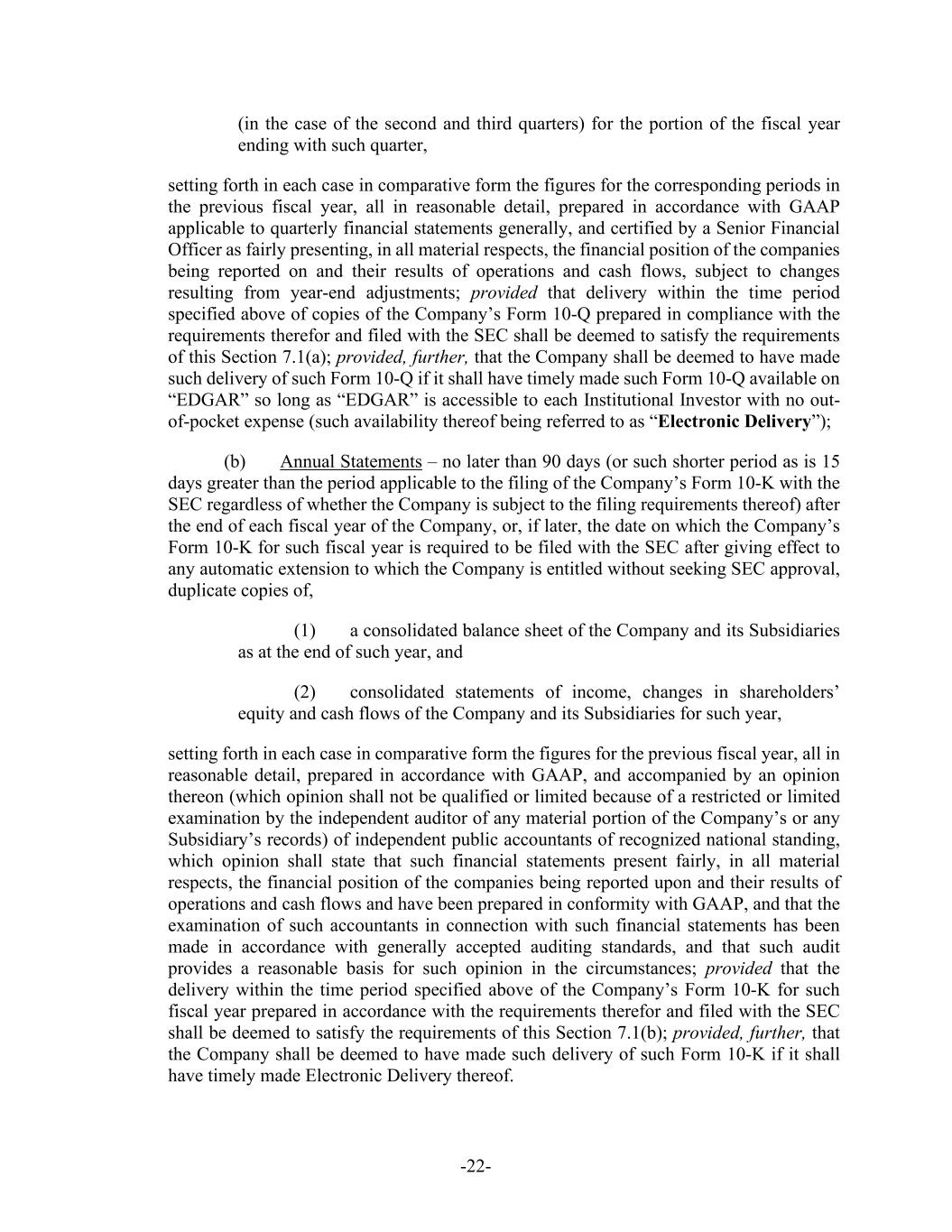-22- (in the case of the second and third quarters) for the portion of the fiscal year ending with such quarter, setting forth in each case in comparative form the figures for the corresponding periods in the previous fiscal year, all in reasonable detail, prepared in accordance with GAAP applicable to quarterly financial statements generally, and certified by a Senior Financial Officer as fairly presenting, in all material respects, the financial position of the companies being reported on and their results of operations and cash flows, subject to changes resulting from year-end adjustments; provided that delivery within the time period specified above of copies of the Company’s Form 10-Q prepared in compliance with the requirements therefor and filed with the SEC shall be deemed to satisfy the requirements of this Section 7.1(a); provided, further, that the Company shall be deemed to have made such delivery of such Form 10-Q if it shall have timely made such Form 10-Q available on “EDGAR” so long as “EDGAR” is accessible to each Institutional Investor with no out- of-pocket expense (such availability thereof being referred to as “Electronic Delivery”); (b) Annual Statements – no later than 90 days (or such shorter period as is 15 days greater than the period applicable to the filing of the Company’s Form 10-K with the SEC regardless of whether the Company is subject to the filing requirements thereof) after the end of each fiscal year of the Company, or, if later, the date on which the Company’s Form 10-K for such fiscal year is required to be filed with the SEC after giving effect to any automatic extension to which the Company is entitled without seeking SEC approval, duplicate copies of, (1) a consolidated balance sheet of the Company and its Subsidiaries as at the end of such year, and (2) consolidated statements of income, changes in shareholders’ equity and cash flows of the Company and its Subsidiaries for such year, setting forth in each case in comparative form the figures for the previous fiscal year, all in reasonable detail, prepared in accordance with GAAP, and accompanied by an opinion thereon (which opinion shall not be qualified or limited because of a restricted or limited examination by the independent auditor of any material portion of the Company’s or any Subsidiary’s records) of independent public accountants of recognized national standing, which opinion shall state that such financial statements present fairly, in all material respects, the financial position of the companies being reported upon and their results of operations and cash flows and have been prepared in conformity with GAAP, and that the examination of such accountants in connection with such financial statements has been made in accordance with generally accepted auditing standards, and that such audit provides a reasonable basis for such opinion in the circumstances; provided that the delivery within the time period specified above of the Company’s Form 10-K for such fiscal year prepared in accordance with the requirements therefor and filed with the SEC shall be deemed to satisfy the requirements of this Section 7.1(b); provided, further, that the Company shall be deemed to have made such delivery of such Form 10-K if it shall have timely made Electronic Delivery thereof.