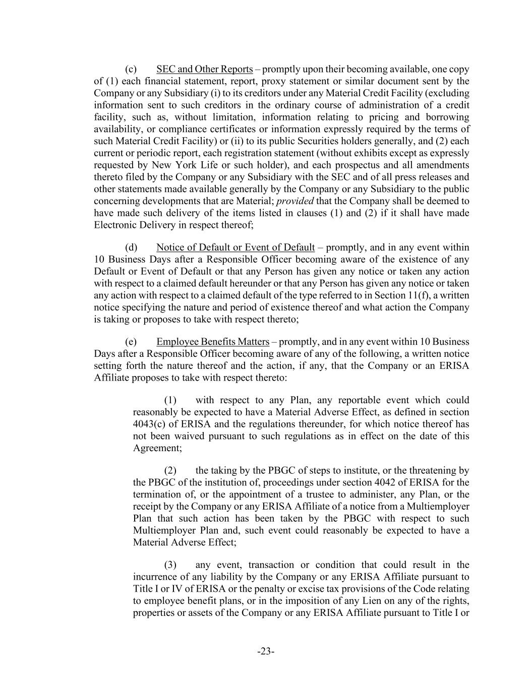 -23- (c) SEC and Other Reports – promptly upon their becoming available, one copy of (1) each financial statement, report, proxy statement or similar document sent by the Company or any Subsidiary (i) to its creditors under any Material Credit Facility (excluding information sent to such creditors in the ordinary course of administration of a credit facility, such as, without limitation, information relating to pricing and borrowing availability, or compliance certificates or information expressly required by the terms of such Material Credit Facility) or (ii) to its public Securities holders generally, and (2) each current or periodic report, each registration statement (without exhibits except as expressly requested by New York Life or such holder), and each prospectus and all amendments thereto filed by the Company or any Subsidiary with the SEC and of all press releases and other statements made available generally by the Company or any Subsidiary to the public concerning developments that are Material; provided that the Company shall be deemed to have made such delivery of the items listed in clauses (1) and (2) if it shall have made Electronic Delivery in respect thereof; (d) Notice of Default or Event of Default – promptly, and in any event within 10 Business Days after a Responsible Officer becoming aware of the existence of any Default or Event of Default or that any Person has given any notice or taken any action with respect to a claimed default hereunder or that any Person has given any notice or taken any action with respect to a claimed default of the type referred to in Section 11(f), a written notice specifying the nature and period of existence thereof and what action the Company is taking or proposes to take with respect thereto; (e) Employee Benefits Matters – promptly, and in any event within 10 Business Days after a Responsible Officer becoming aware of any of the following, a written notice setting forth the nature thereof and the action, if any, that the Company or an ERISA Affiliate proposes to take with respect thereto: (1) with respect to any Plan, any reportable event which could reasonably be expected to have a Material Adverse Effect, as defined in section 4043(c) of ERISA and the regulations thereunder, for which notice thereof has not been waived pursuant to such regulations as in effect on the date of this Agreement; (2) the taking by the PBGC of steps to institute, or the threatening by the PBGC of the institution of, proceedings under section 4042 of ERISA for the termination of, or the appointment of a trustee to administer, any Plan, or the receipt by the Company or any ERISA Affiliate of a notice from a Multiemployer Plan that such action has been taken by the PBGC with respect to such Multiemployer Plan and, such event could reasonably be expected to have a Material Adverse Effect; (3) any event, transaction or condition that could result in the incurrence of any liability by the Company or any ERISA Affiliate pursuant to Title I or IV of ERISA or the penalty or excise tax provisions of the Code relating to employee benefit plans, or in the imposition of any Lien on any of the rights, properties or assets of the Company or any ERISA Affiliate pursuant to Title I or