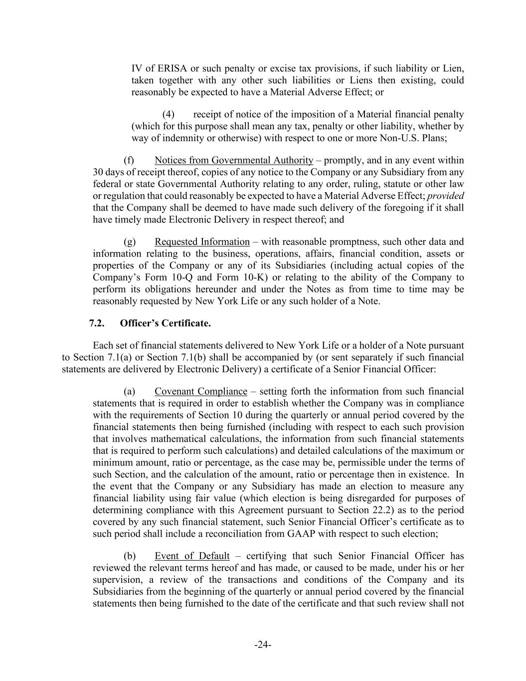-24- IV of ERISA or such penalty or excise tax provisions, if such liability or Lien, taken together with any other such liabilities or Liens then existing, could reasonably be expected to have a Material Adverse Effect; or (4) receipt of notice of the imposition of a Material financial penalty (which for this purpose shall mean any tax, penalty or other liability, whether by way of indemnity or otherwise) with respect to one or more Non-U.S. Plans; (f) Notices from Governmental Authority – promptly, and in any event within 30 days of receipt thereof, copies of any notice to the Company or any Subsidiary from any federal or state Governmental Authority relating to any order, ruling, statute or other law or regulation that could reasonably be expected to have a Material Adverse Effect; provided that the Company shall be deemed to have made such delivery of the foregoing if it shall have timely made Electronic Delivery in respect thereof; and (g) Requested Information – with reasonable promptness, such other data and information relating to the business, operations, affairs, financial condition, assets or properties of the Company or any of its Subsidiaries (including actual copies of the Company’s Form 10-Q and Form 10-K) or relating to the ability of the Company to perform its obligations hereunder and under the Notes as from time to time may be reasonably requested by New York Life or any such holder of a Note. 7.2. Officer’s Certificate. Each set of financial statements delivered to New York Life or a holder of a Note pursuant to Section 7.1(a) or Section 7.1(b) shall be accompanied by (or sent separately if such financial statements are delivered by Electronic Delivery) a certificate of a Senior Financial Officer: (a) Covenant Compliance – setting forth the information from such financial statements that is required in order to establish whether the Company was in compliance with the requirements of Section 10 during the quarterly or annual period covered by the financial statements then being furnished (including with respect to each such provision that involves mathematical calculations, the information from such financial statements that is required to perform such calculations) and detailed calculations of the maximum or minimum amount, ratio or percentage, as the case may be, permissible under the terms of such Section, and the calculation of the amount, ratio or percentage then in existence. In the event that the Company or any Subsidiary has made an election to measure any financial liability using fair value (which election is being disregarded for purposes of determining compliance with this Agreement pursuant to Section 22.2) as to the period covered by any such financial statement, such Senior Financial Officer’s certificate as to such period shall include a reconciliation from GAAP with respect to such election; (b) Event of Default – certifying that such Senior Financial Officer has reviewed the relevant terms hereof and has made, or caused to be made, under his or her supervision, a review of the transactions and conditions of the Company and its Subsidiaries from the beginning of the quarterly or annual period covered by the financial statements then being furnished to the date of the certificate and that such review shall not
