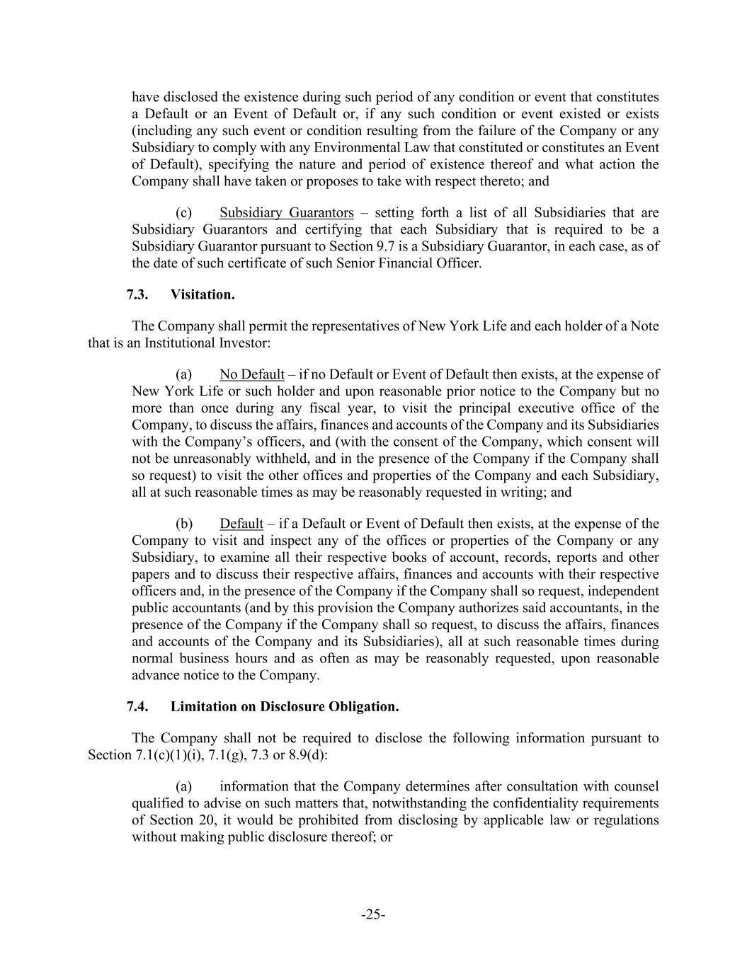 -25- have disclosed the existence during such period of any condition or event that constitutes a Default or an Event of Default or, if any such condition or event existed or exists (including any such event or condition resulting from the failure of the Company or any Subsidiary to comply with any Environmental Law that constituted or constitutes an Event of Default), specifying the nature and period of existence thereof and what action the Company shall have taken or proposes to take with respect thereto; and (c) Subsidiary Guarantors – setting forth a list of all Subsidiaries that are Subsidiary Guarantors and certifying that each Subsidiary that is required to be a Subsidiary Guarantor pursuant to Section 9.7 is a Subsidiary Guarantor, in each case, as of the date of such certificate of such Senior Financial Officer. 7.3. Visitation. The Company shall permit the representatives of New York Life and each holder of a Note that is an Institutional Investor: (a) No Default – if no Default or Event of Default then exists, at the expense of New York Life or such holder and upon reasonable prior notice to the Company but no more than once during any fiscal year, to visit the principal executive office of the Company, to discuss the affairs, finances and accounts of the Company and its Subsidiaries with the Company’s officers, and (with the consent of the Company, which consent will not be unreasonably withheld, and in the presence of the Company if the Company shall so request) to visit the other offices and properties of the Company and each Subsidiary, all at such reasonable times as may be reasonably requested in writing; and (b) Default – if a Default or Event of Default then exists, at the expense of the Company to visit and inspect any of the offices or properties of the Company or any Subsidiary, to examine all their respective books of account, records, reports and other papers and to discuss their respective affairs, finances and accounts with their respective officers and, in the presence of the Company if the Company shall so request, independent public accountants (and by this provision the Company authorizes said accountants, in the presence of the Company if the Company shall so request, to discuss the affairs, finances and accounts of the Company and its Subsidiaries), all at such reasonable times during normal business hours and as often as may be reasonably requested, upon reasonable advance notice to the Company. 7.4. Limitation on Disclosure Obligation. The Company shall not be required to disclose the following information pursuant to Section 7.1(c)(1)(i), 7.1(g), 7.3 or 8.9(d): (a) information that the Company determines after consultation with counsel qualified to advise on such matters that, notwithstanding the confidentiality requirements of Section 20, it would be prohibited from disclosing by applicable law or regulations without making public disclosure thereof; or