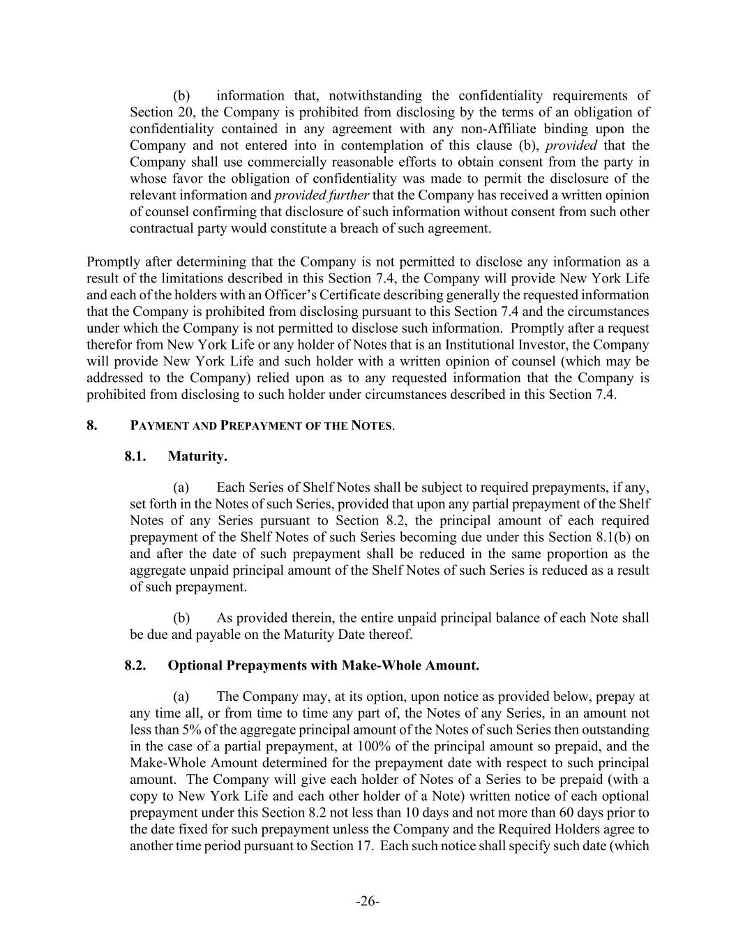 -26- (b) information that, notwithstanding the confidentiality requirements of Section 20, the Company is prohibited from disclosing by the terms of an obligation of confidentiality contained in any agreement with any non-Affiliate binding upon the Company and not entered into in contemplation of this clause (b), provided that the Company shall use commercially reasonable efforts to obtain consent from the party in whose favor the obligation of confidentiality was made to permit the disclosure of the relevant information and provided further that the Company has received a written opinion of counsel confirming that disclosure of such information without consent from such other contractual party would constitute a breach of such agreement. Promptly after determining that the Company is not permitted to disclose any information as a result of the limitations described in this Section 7.4, the Company will provide New York Life and each of the holders with an Officer’s Certificate describing generally the requested information that the Company is prohibited from disclosing pursuant to this Section 7.4 and the circumstances under which the Company is not permitted to disclose such information. Promptly after a request therefor from New York Life or any holder of Notes that is an Institutional Investor, the Company will provide New York Life and such holder with a written opinion of counsel (which may be addressed to the Company) relied upon as to any requested information that the Company is prohibited from disclosing to such holder under circumstances described in this Section 7.4. 8. PAYMENT AND PREPAYMENT OF THE NOTES. 8.1. Maturity. (a) Each Series of Shelf Notes shall be subject to required prepayments, if any, set forth in the Notes of such Series, provided that upon any partial prepayment of the Shelf Notes of any Series pursuant to Section 8.2, the principal amount of each required prepayment of the Shelf Notes of such Series becoming due under this Section 8.1(b) on and after the date of such prepayment shall be reduced in the same proportion as the aggregate unpaid principal amount of the Shelf Notes of such Series is reduced as a result of such prepayment. (b) As provided therein, the entire unpaid principal balance of each Note shall be due and payable on the Maturity Date thereof. 8.2. Optional Prepayments with Make-Whole Amount. (a) The Company may, at its option, upon notice as provided below, prepay at any time all, or from time to time any part of, the Notes of any Series, in an amount not less than 5% of the aggregate principal amount of the Notes of such Series then outstanding in the case of a partial prepayment, at 100% of the principal amount so prepaid, and the Make-Whole Amount determined for the prepayment date with respect to such principal amount. The Company will give each holder of Notes of a Series to be prepaid (with a copy to New York Life and each other holder of a Note) written notice of each optional prepayment under this Section 8.2 not less than 10 days and not more than 60 days prior to the date fixed for such prepayment unless the Company and the Required Holders agree to another time period pursuant to Section 17. Each such notice shall specify such date (which