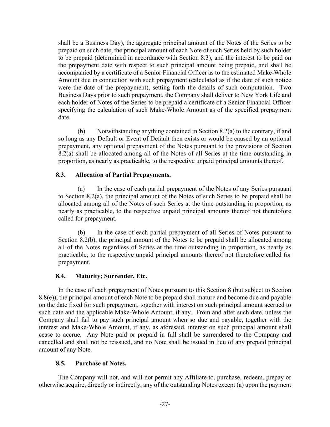 -27- shall be a Business Day), the aggregate principal amount of the Notes of the Series to be prepaid on such date, the principal amount of each Note of such Series held by such holder to be prepaid (determined in accordance with Section 8.3), and the interest to be paid on the prepayment date with respect to such principal amount being prepaid, and shall be accompanied by a certificate of a Senior Financial Officer as to the estimated Make-Whole Amount due in connection with such prepayment (calculated as if the date of such notice were the date of the prepayment), setting forth the details of such computation. Two Business Days prior to such prepayment, the Company shall deliver to New York Life and each holder of Notes of the Series to be prepaid a certificate of a Senior Financial Officer specifying the calculation of such Make-Whole Amount as of the specified prepayment date. (b) Notwithstanding anything contained in Section 8.2(a) to the contrary, if and so long as any Default or Event of Default then exists or would be caused by an optional prepayment, any optional prepayment of the Notes pursuant to the provisions of Section 8.2(a) shall be allocated among all of the Notes of all Series at the time outstanding in proportion, as nearly as practicable, to the respective unpaid principal amounts thereof. 8.3. Allocation of Partial Prepayments. (a) In the case of each partial prepayment of the Notes of any Series pursuant to Section 8.2(a), the principal amount of the Notes of such Series to be prepaid shall be allocated among all of the Notes of such Series at the time outstanding in proportion, as nearly as practicable, to the respective unpaid principal amounts thereof not theretofore called for prepayment. (b) In the case of each partial prepayment of all Series of Notes pursuant to Section 8.2(b), the principal amount of the Notes to be prepaid shall be allocated among all of the Notes regardless of Series at the time outstanding in proportion, as nearly as practicable, to the respective unpaid principal amounts thereof not theretofore called for prepayment. 8.4. Maturity; Surrender, Etc. In the case of each prepayment of Notes pursuant to this Section 8 (but subject to Section 8.8(e)), the principal amount of each Note to be prepaid shall mature and become due and payable on the date fixed for such prepayment, together with interest on such principal amount accrued to such date and the applicable Make-Whole Amount, if any. From and after such date, unless the Company shall fail to pay such principal amount when so due and payable, together with the interest and Make-Whole Amount, if any, as aforesaid, interest on such principal amount shall cease to accrue. Any Note paid or prepaid in full shall be surrendered to the Company and cancelled and shall not be reissued, and no Note shall be issued in lieu of any prepaid principal amount of any Note. 8.5. Purchase of Notes. The Company will not, and will not permit any Affiliate to, purchase, redeem, prepay or otherwise acquire, directly or indirectly, any of the outstanding Notes except (a) upon the payment