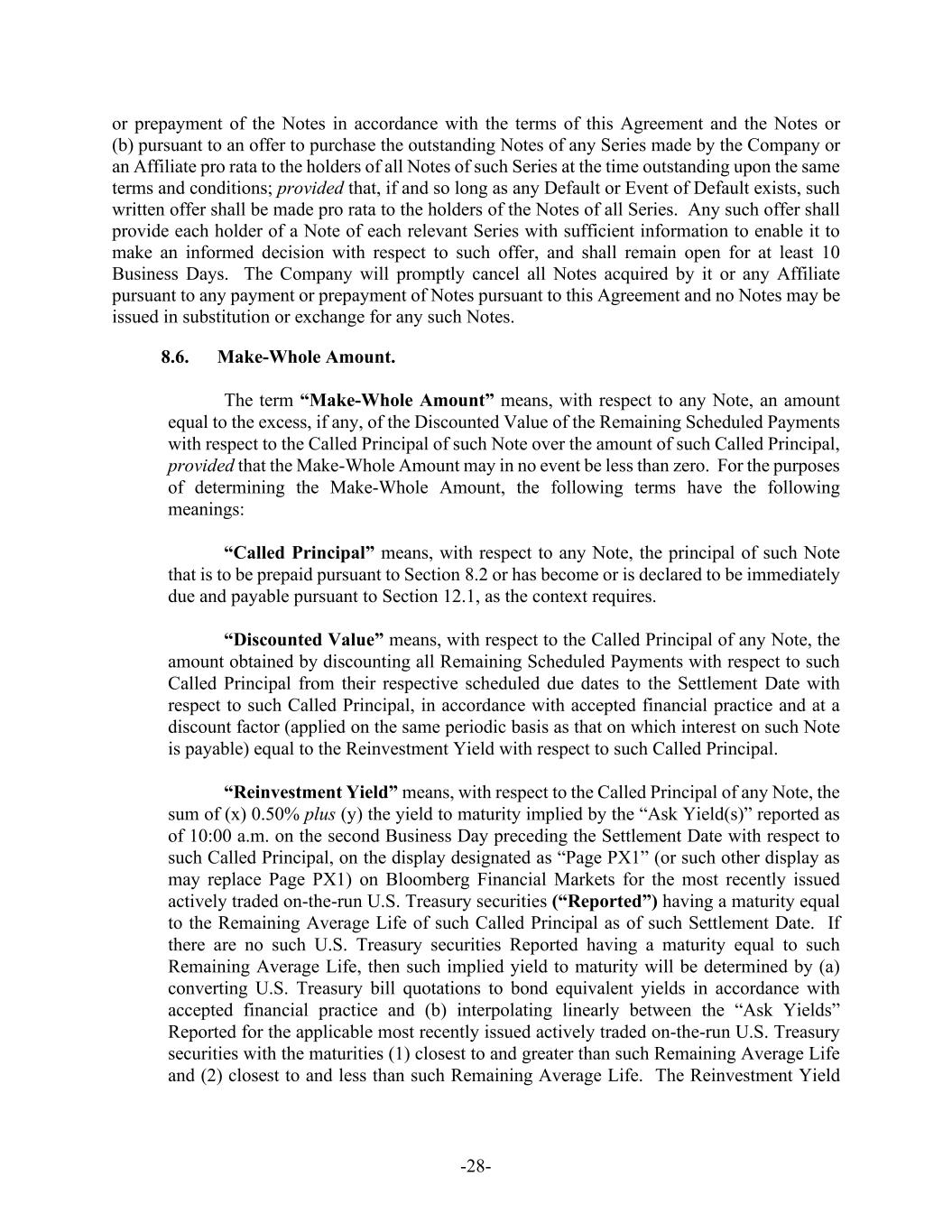 -28- or prepayment of the Notes in accordance with the terms of this Agreement and the Notes or (b) pursuant to an offer to purchase the outstanding Notes of any Series made by the Company or an Affiliate pro rata to the holders of all Notes of such Series at the time outstanding upon the same terms and conditions; provided that, if and so long as any Default or Event of Default exists, such written offer shall be made pro rata to the holders of the Notes of all Series. Any such offer shall provide each holder of a Note of each relevant Series with sufficient information to enable it to make an informed decision with respect to such offer, and shall remain open for at least 10 Business Days. The Company will promptly cancel all Notes acquired by it or any Affiliate pursuant to any payment or prepayment of Notes pursuant to this Agreement and no Notes may be issued in substitution or exchange for any such Notes. 8.6. Make-Whole Amount. The term “Make-Whole Amount” means, with respect to any Note, an amount equal to the excess, if any, of the Discounted Value of the Remaining Scheduled Payments with respect to the Called Principal of such Note over the amount of such Called Principal, provided that the Make-Whole Amount may in no event be less than zero. For the purposes of determining the Make-Whole Amount, the following terms have the following meanings: “Called Principal” means, with respect to any Note, the principal of such Note that is to be prepaid pursuant to Section 8.2 or has become or is declared to be immediately due and payable pursuant to Section 12.1, as the context requires. “Discounted Value” means, with respect to the Called Principal of any Note, the amount obtained by discounting all Remaining Scheduled Payments with respect to such Called Principal from their respective scheduled due dates to the Settlement Date with respect to such Called Principal, in accordance with accepted financial practice and at a discount factor (applied on the same periodic basis as that on which interest on such Note is payable) equal to the Reinvestment Yield with respect to such Called Principal. “Reinvestment Yield” means, with respect to the Called Principal of any Note, the sum of (x) 0.50% plus (y) the yield to maturity implied by the “Ask Yield(s)” reported as of 10:00 a.m. on the second Business Day preceding the Settlement Date with respect to such Called Principal, on the display designated as “Page PX1” (or such other display as may replace Page PX1) on Bloomberg Financial Markets for the most recently issued actively traded on-the-run U.S. Treasury securities (“Reported”) having a maturity equal to the Remaining Average Life of such Called Principal as of such Settlement Date. If there are no such U.S. Treasury securities Reported having a maturity equal to such Remaining Average Life, then such implied yield to maturity will be determined by (a) converting U.S. Treasury bill quotations to bond equivalent yields in accordance with accepted financial practice and (b) interpolating linearly between the “Ask Yields” Reported for the applicable most recently issued actively traded on-the-run U.S. Treasury securities with the maturities (1) closest to and greater than such Remaining Average Life and (2) closest to and less than such Remaining Average Life. The Reinvestment Yield
