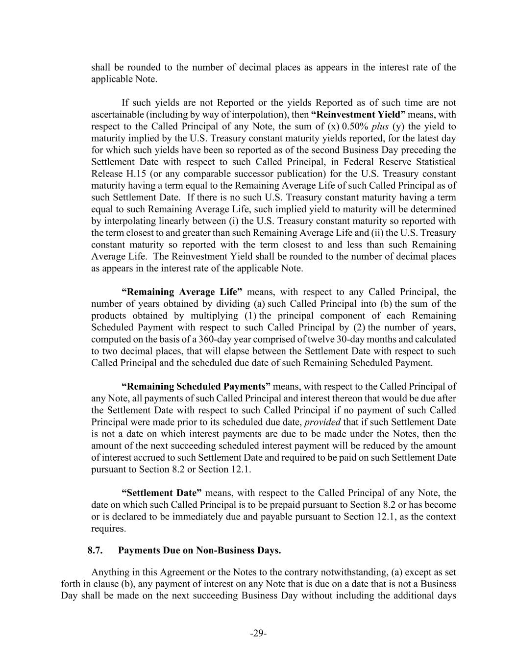 -29- shall be rounded to the number of decimal places as appears in the interest rate of the applicable Note. If such yields are not Reported or the yields Reported as of such time are not ascertainable (including by way of interpolation), then “Reinvestment Yield” means, with respect to the Called Principal of any Note, the sum of (x) 0.50% plus (y) the yield to maturity implied by the U.S. Treasury constant maturity yields reported, for the latest day for which such yields have been so reported as of the second Business Day preceding the Settlement Date with respect to such Called Principal, in Federal Reserve Statistical Release H.15 (or any comparable successor publication) for the U.S. Treasury constant maturity having a term equal to the Remaining Average Life of such Called Principal as of such Settlement Date. If there is no such U.S. Treasury constant maturity having a term equal to such Remaining Average Life, such implied yield to maturity will be determined by interpolating linearly between (i) the U.S. Treasury constant maturity so reported with the term closest to and greater than such Remaining Average Life and (ii) the U.S. Treasury constant maturity so reported with the term closest to and less than such Remaining Average Life. The Reinvestment Yield shall be rounded to the number of decimal places as appears in the interest rate of the applicable Note. “Remaining Average Life” means, with respect to any Called Principal, the number of years obtained by dividing (a) such Called Principal into (b) the sum of the products obtained by multiplying (1) the principal component of each Remaining Scheduled Payment with respect to such Called Principal by (2) the number of years, computed on the basis of a 360-day year comprised of twelve 30-day months and calculated to two decimal places, that will elapse between the Settlement Date with respect to such Called Principal and the scheduled due date of such Remaining Scheduled Payment. “Remaining Scheduled Payments” means, with respect to the Called Principal of any Note, all payments of such Called Principal and interest thereon that would be due after the Settlement Date with respect to such Called Principal if no payment of such Called Principal were made prior to its scheduled due date, provided that if such Settlement Date is not a date on which interest payments are due to be made under the Notes, then the amount of the next succeeding scheduled interest payment will be reduced by the amount of interest accrued to such Settlement Date and required to be paid on such Settlement Date pursuant to Section 8.2 or Section 12.1. “Settlement Date” means, with respect to the Called Principal of any Note, the date on which such Called Principal is to be prepaid pursuant to Section 8.2 or has become or is declared to be immediately due and payable pursuant to Section 12.1, as the context requires. 8.7. Payments Due on Non-Business Days. Anything in this Agreement or the Notes to the contrary notwithstanding, (a) except as set forth in clause (b), any payment of interest on any Note that is due on a date that is not a Business Day shall be made on the next succeeding Business Day without including the additional days