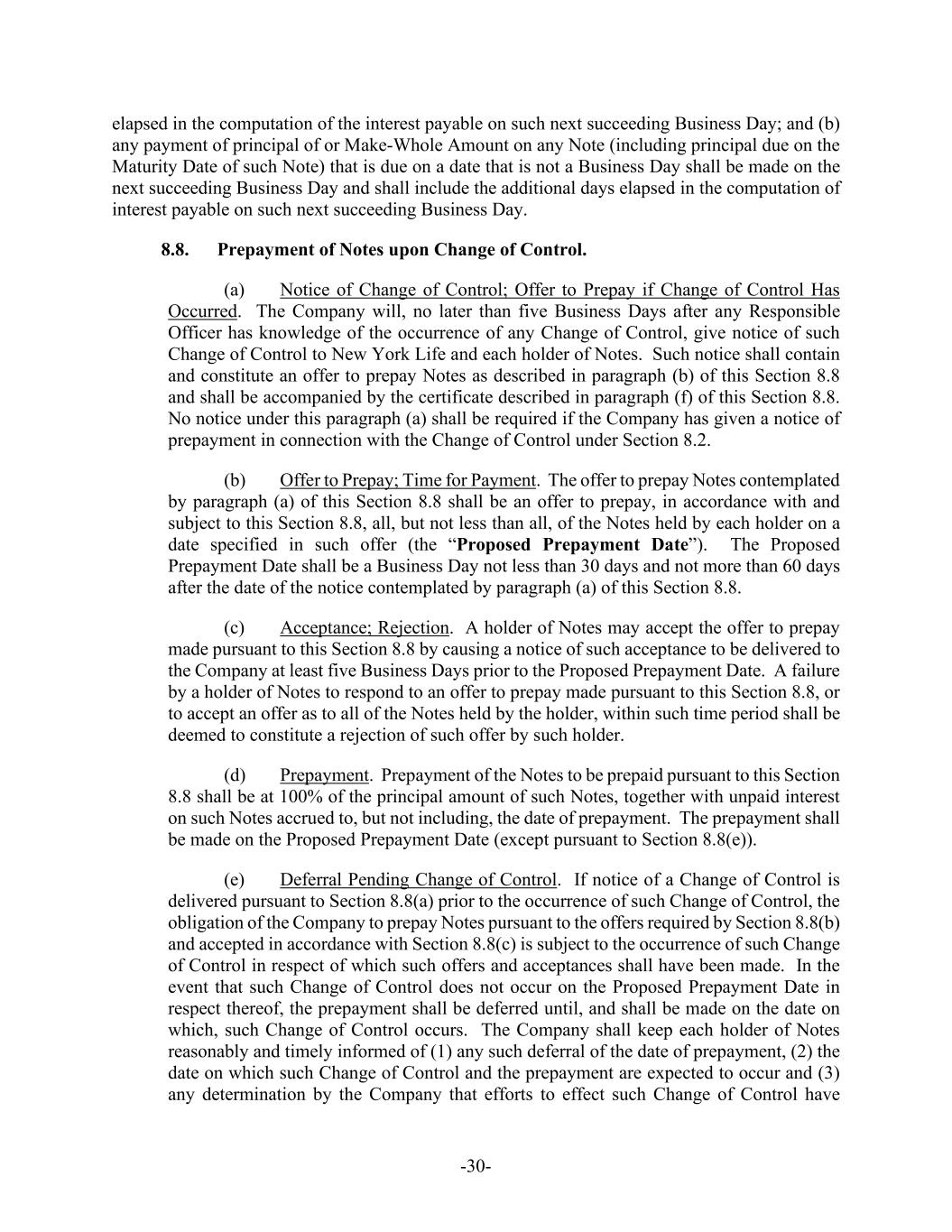 -30- elapsed in the computation of the interest payable on such next succeeding Business Day; and (b) any payment of principal of or Make-Whole Amount on any Note (including principal due on the Maturity Date of such Note) that is due on a date that is not a Business Day shall be made on the next succeeding Business Day and shall include the additional days elapsed in the computation of interest payable on such next succeeding Business Day. 8.8. Prepayment of Notes upon Change of Control. (a) Notice of Change of Control; Offer to Prepay if Change of Control Has Occurred. The Company will, no later than five Business Days after any Responsible Officer has knowledge of the occurrence of any Change of Control, give notice of such Change of Control to New York Life and each holder of Notes. Such notice shall contain and constitute an offer to prepay Notes as described in paragraph (b) of this Section 8.8 and shall be accompanied by the certificate described in paragraph (f) of this Section 8.8. No notice under this paragraph (a) shall be required if the Company has given a notice of prepayment in connection with the Change of Control under Section 8.2. (b) Offer to Prepay; Time for Payment. The offer to prepay Notes contemplated by paragraph (a) of this Section 8.8 shall be an offer to prepay, in accordance with and subject to this Section 8.8, all, but not less than all, of the Notes held by each holder on a date specified in such offer (the “Proposed Prepayment Date”). The Proposed Prepayment Date shall be a Business Day not less than 30 days and not more than 60 days after the date of the notice contemplated by paragraph (a) of this Section 8.8. (c) Acceptance; Rejection. A holder of Notes may accept the offer to prepay made pursuant to this Section 8.8 by causing a notice of such acceptance to be delivered to the Company at least five Business Days prior to the Proposed Prepayment Date. A failure by a holder of Notes to respond to an offer to prepay made pursuant to this Section 8.8, or to accept an offer as to all of the Notes held by the holder, within such time period shall be deemed to constitute a rejection of such offer by such holder. (d) Prepayment. Prepayment of the Notes to be prepaid pursuant to this Section 8.8 shall be at 100% of the principal amount of such Notes, together with unpaid interest on such Notes accrued to, but not including, the date of prepayment. The prepayment shall be made on the Proposed Prepayment Date (except pursuant to Section 8.8(e)). (e) Deferral Pending Change of Control. If notice of a Change of Control is delivered pursuant to Section 8.8(a) prior to the occurrence of such Change of Control, the obligation of the Company to prepay Notes pursuant to the offers required by Section 8.8(b) and accepted in accordance with Section 8.8(c) is subject to the occurrence of such Change of Control in respect of which such offers and acceptances shall have been made. In the event that such Change of Control does not occur on the Proposed Prepayment Date in respect thereof, the prepayment shall be deferred until, and shall be made on the date on which, such Change of Control occurs. The Company shall keep each holder of Notes reasonably and timely informed of (1) any such deferral of the date of prepayment, (2) the date on which such Change of Control and the prepayment are expected to occur and (3) any determination by the Company that efforts to effect such Change of Control have