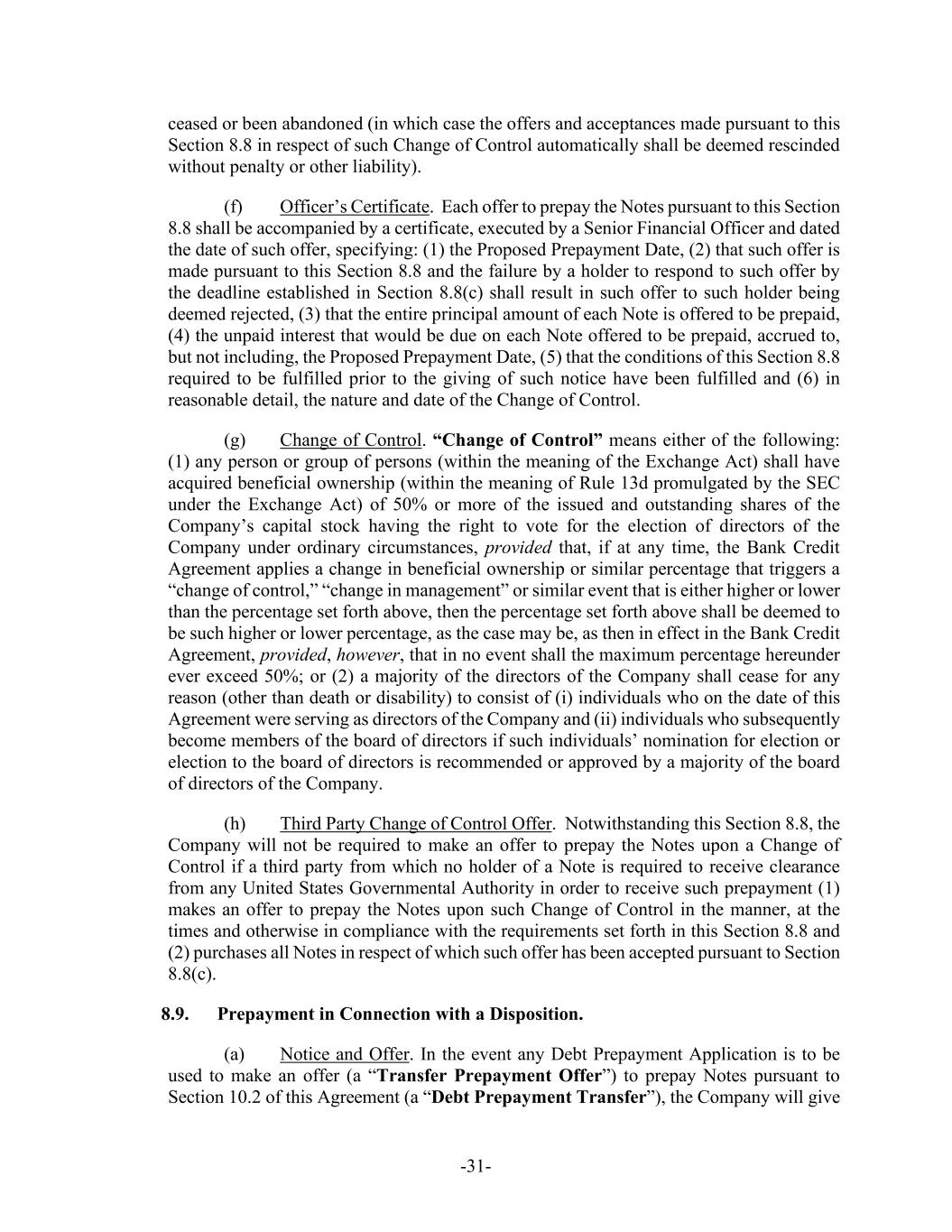 -31- ceased or been abandoned (in which case the offers and acceptances made pursuant to this Section 8.8 in respect of such Change of Control automatically shall be deemed rescinded without penalty or other liability). (f) Officer’s Certificate. Each offer to prepay the Notes pursuant to this Section 8.8 shall be accompanied by a certificate, executed by a Senior Financial Officer and dated the date of such offer, specifying: (1) the Proposed Prepayment Date, (2) that such offer is made pursuant to this Section 8.8 and the failure by a holder to respond to such offer by the deadline established in Section 8.8(c) shall result in such offer to such holder being deemed rejected, (3) that the entire principal amount of each Note is offered to be prepaid, (4) the unpaid interest that would be due on each Note offered to be prepaid, accrued to, but not including, the Proposed Prepayment Date, (5) that the conditions of this Section 8.8 required to be fulfilled prior to the giving of such notice have been fulfilled and (6) in reasonable detail, the nature and date of the Change of Control. (g) Change of Control. “Change of Control” means either of the following: (1) any person or group of persons (within the meaning of the Exchange Act) shall have acquired beneficial ownership (within the meaning of Rule 13d promulgated by the SEC under the Exchange Act) of 50% or more of the issued and outstanding shares of the Company’s capital stock having the right to vote for the election of directors of the Company under ordinary circumstances, provided that, if at any time, the Bank Credit Agreement applies a change in beneficial ownership or similar percentage that triggers a “change of control,” “change in management” or similar event that is either higher or lower than the percentage set forth above, then the percentage set forth above shall be deemed to be such higher or lower percentage, as the case may be, as then in effect in the Bank Credit Agreement, provided, however, that in no event shall the maximum percentage hereunder ever exceed 50%; or (2) a majority of the directors of the Company shall cease for any reason (other than death or disability) to consist of (i) individuals who on the date of this Agreement were serving as directors of the Company and (ii) individuals who subsequently become members of the board of directors if such individuals’ nomination for election or election to the board of directors is recommended or approved by a majority of the board of directors of the Company. (h) Third Party Change of Control Offer. Notwithstanding this Section 8.8, the Company will not be required to make an offer to prepay the Notes upon a Change of Control if a third party from which no holder of a Note is required to receive clearance from any United States Governmental Authority in order to receive such prepayment (1) makes an offer to prepay the Notes upon such Change of Control in the manner, at the times and otherwise in compliance with the requirements set forth in this Section 8.8 and (2) purchases all Notes in respect of which such offer has been accepted pursuant to Section 8.8(c). 8.9. Prepayment in Connection with a Disposition. (a) Notice and Offer. In the event any Debt Prepayment Application is to be used to make an offer (a “Transfer Prepayment Offer”) to prepay Notes pursuant to Section 10.2 of this Agreement (a “Debt Prepayment Transfer”), the Company will give
