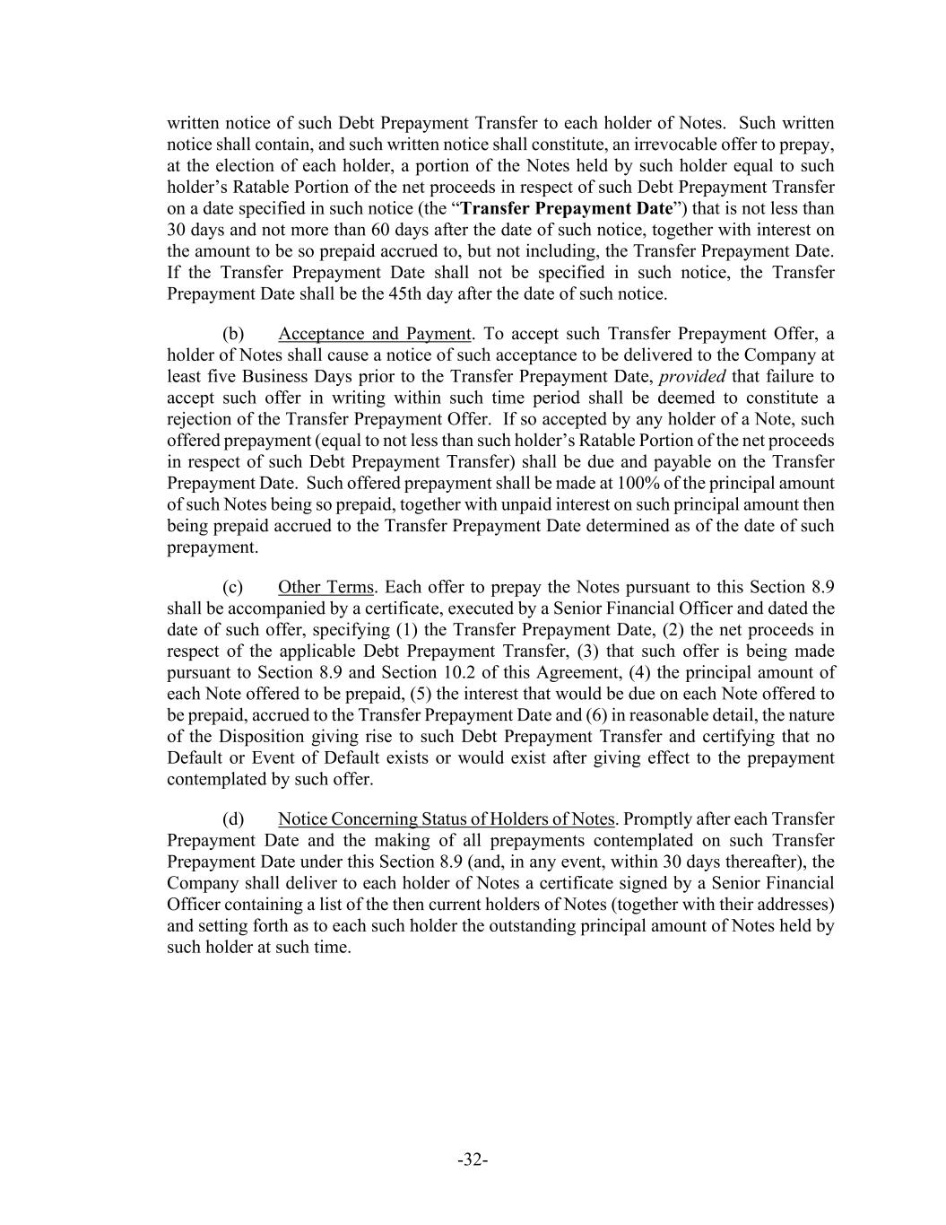 -32- written notice of such Debt Prepayment Transfer to each holder of Notes. Such written notice shall contain, and such written notice shall constitute, an irrevocable offer to prepay, at the election of each holder, a portion of the Notes held by such holder equal to such holder’s Ratable Portion of the net proceeds in respect of such Debt Prepayment Transfer on a date specified in such notice (the “Transfer Prepayment Date”) that is not less than 30 days and not more than 60 days after the date of such notice, together with interest on the amount to be so prepaid accrued to, but not including, the Transfer Prepayment Date. If the Transfer Prepayment Date shall not be specified in such notice, the Transfer Prepayment Date shall be the 45th day after the date of such notice. (b) Acceptance and Payment. To accept such Transfer Prepayment Offer, a holder of Notes shall cause a notice of such acceptance to be delivered to the Company at least five Business Days prior to the Transfer Prepayment Date, provided that failure to accept such offer in writing within such time period shall be deemed to constitute a rejection of the Transfer Prepayment Offer. If so accepted by any holder of a Note, such offered prepayment (equal to not less than such holder’s Ratable Portion of the net proceeds in respect of such Debt Prepayment Transfer) shall be due and payable on the Transfer Prepayment Date. Such offered prepayment shall be made at 100% of the principal amount of such Notes being so prepaid, together with unpaid interest on such principal amount then being prepaid accrued to the Transfer Prepayment Date determined as of the date of such prepayment. (c) Other Terms. Each offer to prepay the Notes pursuant to this Section 8.9 shall be accompanied by a certificate, executed by a Senior Financial Officer and dated the date of such offer, specifying (1) the Transfer Prepayment Date, (2) the net proceeds in respect of the applicable Debt Prepayment Transfer, (3) that such offer is being made pursuant to Section 8.9 and Section 10.2 of this Agreement, (4) the principal amount of each Note offered to be prepaid, (5) the interest that would be due on each Note offered to be prepaid, accrued to the Transfer Prepayment Date and (6) in reasonable detail, the nature of the Disposition giving rise to such Debt Prepayment Transfer and certifying that no Default or Event of Default exists or would exist after giving effect to the prepayment contemplated by such offer. (d) Notice Concerning Status of Holders of Notes. Promptly after each Transfer Prepayment Date and the making of all prepayments contemplated on such Transfer Prepayment Date under this Section 8.9 (and, in any event, within 30 days thereafter), the Company shall deliver to each holder of Notes a certificate signed by a Senior Financial Officer containing a list of the then current holders of Notes (together with their addresses) and setting forth as to each such holder the outstanding principal amount of Notes held by such holder at such time.