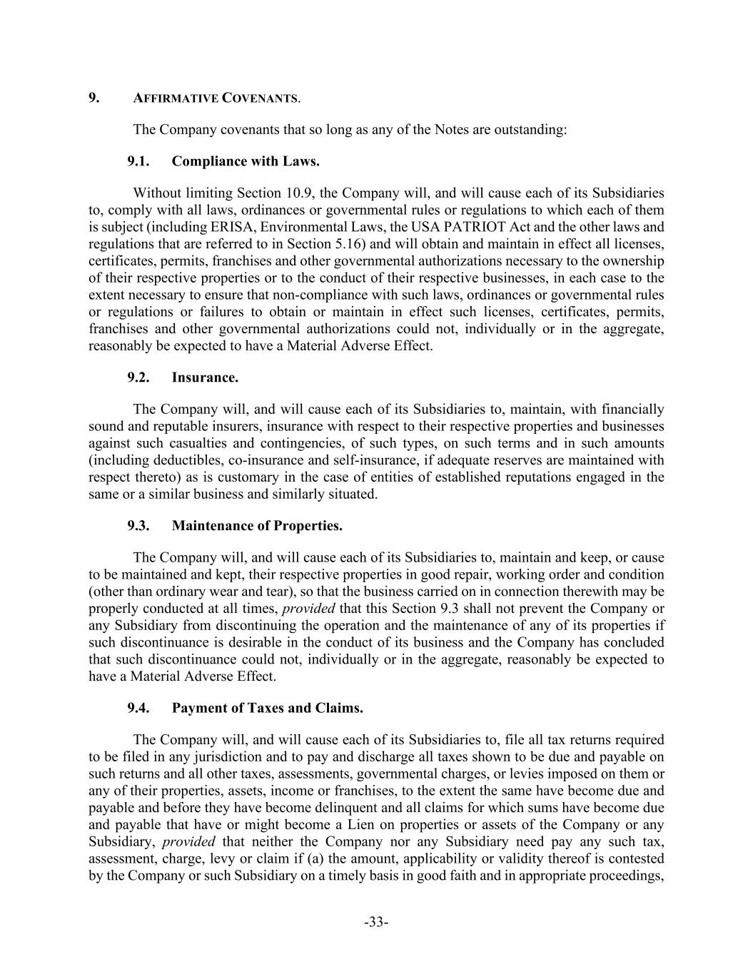 -33- 9. AFFIRMATIVE COVENANTS. The Company covenants that so long as any of the Notes are outstanding: 9.1. Compliance with Laws. Without limiting Section 10.9, the Company will, and will cause each of its Subsidiaries to, comply with all laws, ordinances or governmental rules or regulations to which each of them is subject (including ERISA, Environmental Laws, the USA PATRIOT Act and the other laws and regulations that are referred to in Section 5.16) and will obtain and maintain in effect all licenses, certificates, permits, franchises and other governmental authorizations necessary to the ownership of their respective properties or to the conduct of their respective businesses, in each case to the extent necessary to ensure that non-compliance with such laws, ordinances or governmental rules or regulations or failures to obtain or maintain in effect such licenses, certificates, permits, franchises and other governmental authorizations could not, individually or in the aggregate, reasonably be expected to have a Material Adverse Effect. 9.2. Insurance. The Company will, and will cause each of its Subsidiaries to, maintain, with financially sound and reputable insurers, insurance with respect to their respective properties and businesses against such casualties and contingencies, of such types, on such terms and in such amounts (including deductibles, co-insurance and self-insurance, if adequate reserves are maintained with respect thereto) as is customary in the case of entities of established reputations engaged in the same or a similar business and similarly situated. 9.3. Maintenance of Properties. The Company will, and will cause each of its Subsidiaries to, maintain and keep, or cause to be maintained and kept, their respective properties in good repair, working order and condition (other than ordinary wear and tear), so that the business carried on in connection therewith may be properly conducted at all times, provided that this Section 9.3 shall not prevent the Company or any Subsidiary from discontinuing the operation and the maintenance of any of its properties if such discontinuance is desirable in the conduct of its business and the Company has concluded that such discontinuance could not, individually or in the aggregate, reasonably be expected to have a Material Adverse Effect. 9.4. Payment of Taxes and Claims. The Company will, and will cause each of its Subsidiaries to, file all tax returns required to be filed in any jurisdiction and to pay and discharge all taxes shown to be due and payable on such returns and all other taxes, assessments, governmental charges, or levies imposed on them or any of their properties, assets, income or franchises, to the extent the same have become due and payable and before they have become delinquent and all claims for which sums have become due and payable that have or might become a Lien on properties or assets of the Company or any Subsidiary, provided that neither the Company nor any Subsidiary need pay any such tax, assessment, charge, levy or claim if (a) the amount, applicability or validity thereof is contested by the Company or such Subsidiary on a timely basis in good faith and in appropriate proceedings,