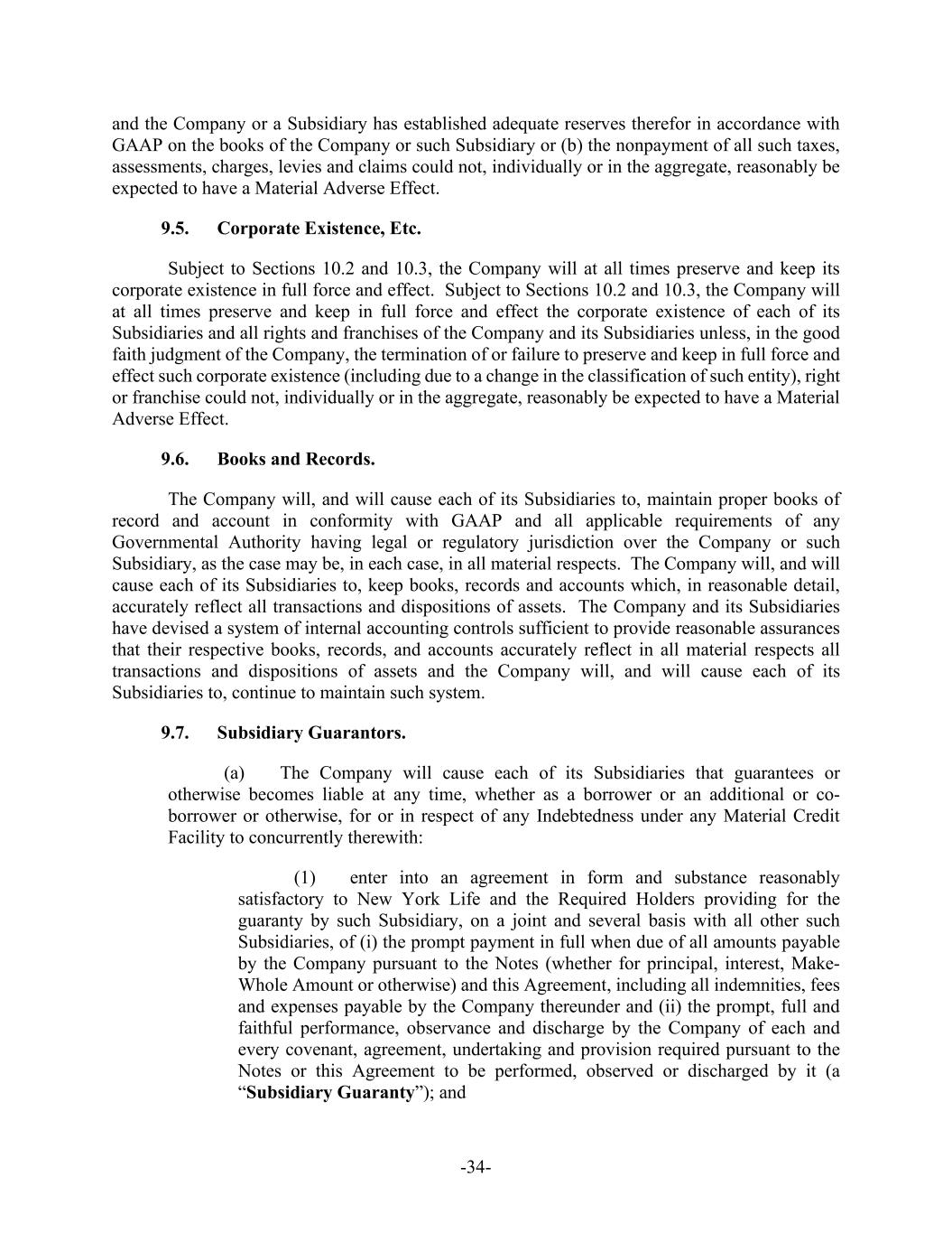 -34- and the Company or a Subsidiary has established adequate reserves therefor in accordance with GAAP on the books of the Company or such Subsidiary or (b) the nonpayment of all such taxes, assessments, charges, levies and claims could not, individually or in the aggregate, reasonably be expected to have a Material Adverse Effect. 9.5. Corporate Existence, Etc. Subject to Sections 10.2 and 10.3, the Company will at all times preserve and keep its corporate existence in full force and effect. Subject to Sections 10.2 and 10.3, the Company will at all times preserve and keep in full force and effect the corporate existence of each of its Subsidiaries and all rights and franchises of the Company and its Subsidiaries unless, in the good faith judgment of the Company, the termination of or failure to preserve and keep in full force and effect such corporate existence (including due to a change in the classification of such entity), right or franchise could not, individually or in the aggregate, reasonably be expected to have a Material Adverse Effect. 9.6. Books and Records. The Company will, and will cause each of its Subsidiaries to, maintain proper books of record and account in conformity with GAAP and all applicable requirements of any Governmental Authority having legal or regulatory jurisdiction over the Company or such Subsidiary, as the case may be, in each case, in all material respects. The Company will, and will cause each of its Subsidiaries to, keep books, records and accounts which, in reasonable detail, accurately reflect all transactions and dispositions of assets. The Company and its Subsidiaries have devised a system of internal accounting controls sufficient to provide reasonable assurances that their respective books, records, and accounts accurately reflect in all material respects all transactions and dispositions of assets and the Company will, and will cause each of its Subsidiaries to, continue to maintain such system. 9.7. Subsidiary Guarantors. (a) The Company will cause each of its Subsidiaries that guarantees or otherwise becomes liable at any time, whether as a borrower or an additional or co- borrower or otherwise, for or in respect of any Indebtedness under any Material Credit Facility to concurrently therewith: (1) enter into an agreement in form and substance reasonably satisfactory to New York Life and the Required Holders providing for the guaranty by such Subsidiary, on a joint and several basis with all other such Subsidiaries, of (i) the prompt payment in full when due of all amounts payable by the Company pursuant to the Notes (whether for principal, interest, Make- Whole Amount or otherwise) and this Agreement, including all indemnities, fees and expenses payable by the Company thereunder and (ii) the prompt, full and faithful performance, observance and discharge by the Company of each and every covenant, agreement, undertaking and provision required pursuant to the Notes or this Agreement to be performed, observed or discharged by it (a “Subsidiary Guaranty”); and