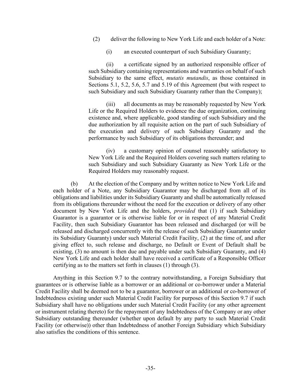 -35- (2) deliver the following to New York Life and each holder of a Note: (i) an executed counterpart of such Subsidiary Guaranty; (ii) a certificate signed by an authorized responsible officer of such Subsidiary containing representations and warranties on behalf of such Subsidiary to the same effect, mutatis mutandis, as those contained in Sections 5.1, 5.2, 5.6, 5.7 and 5.19 of this Agreement (but with respect to such Subsidiary and such Subsidiary Guaranty rather than the Company); (iii) all documents as may be reasonably requested by New York Life or the Required Holders to evidence the due organization, continuing existence and, where applicable, good standing of such Subsidiary and the due authorization by all requisite action on the part of such Subsidiary of the execution and delivery of such Subsidiary Guaranty and the performance by such Subsidiary of its obligations thereunder; and (iv) a customary opinion of counsel reasonably satisfactory to New York Life and the Required Holders covering such matters relating to such Subsidiary and such Subsidiary Guaranty as New York Life or the Required Holders may reasonably request. (b) At the election of the Company and by written notice to New York Life and each holder of a Note, any Subsidiary Guarantor may be discharged from all of its obligations and liabilities under its Subsidiary Guaranty and shall be automatically released from its obligations thereunder without the need for the execution or delivery of any other document by New York Life and the holders, provided that (1) if such Subsidiary Guarantor is a guarantor or is otherwise liable for or in respect of any Material Credit Facility, then such Subsidiary Guarantor has been released and discharged (or will be released and discharged concurrently with the release of such Subsidiary Guarantor under its Subsidiary Guaranty) under such Material Credit Facility, (2) at the time of, and after giving effect to, such release and discharge, no Default or Event of Default shall be existing, (3) no amount is then due and payable under such Subsidiary Guaranty, and (4) New York Life and each holder shall have received a certificate of a Responsible Officer certifying as to the matters set forth in clauses (1) through (3). Anything in this Section 9.7 to the contrary notwithstanding, a Foreign Subsidiary that guarantees or is otherwise liable as a borrower or an additional or co-borrower under a Material Credit Facility shall be deemed not to be a guarantor, borrower or an additional or co-borrower of Indebtedness existing under such Material Credit Facility for purposes of this Section 9.7 if such Subsidiary shall have no obligations under such Material Credit Facility (or any other agreement or instrument relating thereto) for the repayment of any Indebtedness of the Company or any other Subsidiary outstanding thereunder (whether upon default by any party to such Material Credit Facility (or otherwise)) other than Indebtedness of another Foreign Subsidiary which Subsidiary also satisfies the conditions of this sentence.
