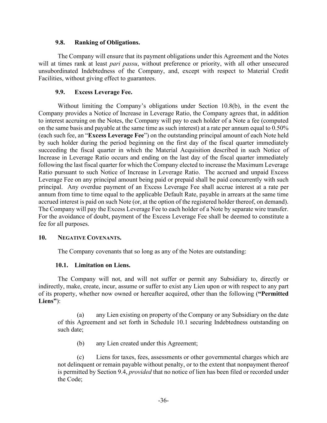-36- 9.8. Ranking of Obligations. The Company will ensure that its payment obligations under this Agreement and the Notes will at times rank at least pari passu, without preference or priority, with all other unsecured unsubordinated Indebtedness of the Company, and, except with respect to Material Credit Facilities, without giving effect to guarantees. 9.9. Excess Leverage Fee. Without limiting the Company’s obligations under Section 10.8(b), in the event the Company provides a Notice of Increase in Leverage Ratio, the Company agrees that, in addition to interest accruing on the Notes, the Company will pay to each holder of a Note a fee (computed on the same basis and payable at the same time as such interest) at a rate per annum equal to 0.50% (each such fee, an “Excess Leverage Fee”) on the outstanding principal amount of each Note held by such holder during the period beginning on the first day of the fiscal quarter immediately succeeding the fiscal quarter in which the Material Acquisition described in such Notice of Increase in Leverage Ratio occurs and ending on the last day of the fiscal quarter immediately following the last fiscal quarter for which the Company elected to increase the Maximum Leverage Ratio pursuant to such Notice of Increase in Leverage Ratio. The accrued and unpaid Excess Leverage Fee on any principal amount being paid or prepaid shall be paid concurrently with such principal. Any overdue payment of an Excess Leverage Fee shall accrue interest at a rate per annum from time to time equal to the applicable Default Rate, payable in arrears at the same time accrued interest is paid on such Note (or, at the option of the registered holder thereof, on demand). The Company will pay the Excess Leverage Fee to each holder of a Note by separate wire transfer. For the avoidance of doubt, payment of the Excess Leverage Fee shall be deemed to constitute a fee for all purposes. 10. NEGATIVE COVENANTS. The Company covenants that so long as any of the Notes are outstanding: 10.1. Limitation on Liens. The Company will not, and will not suffer or permit any Subsidiary to, directly or indirectly, make, create, incur, assume or suffer to exist any Lien upon or with respect to any part of its property, whether now owned or hereafter acquired, other than the following (“Permitted Liens”): (a) any Lien existing on property of the Company or any Subsidiary on the date of this Agreement and set forth in Schedule 10.1 securing Indebtedness outstanding on such date; (b) any Lien created under this Agreement; (c) Liens for taxes, fees, assessments or other governmental charges which are not delinquent or remain payable without penalty, or to the extent that nonpayment thereof is permitted by Section 9.4, provided that no notice of lien has been filed or recorded under the Code;