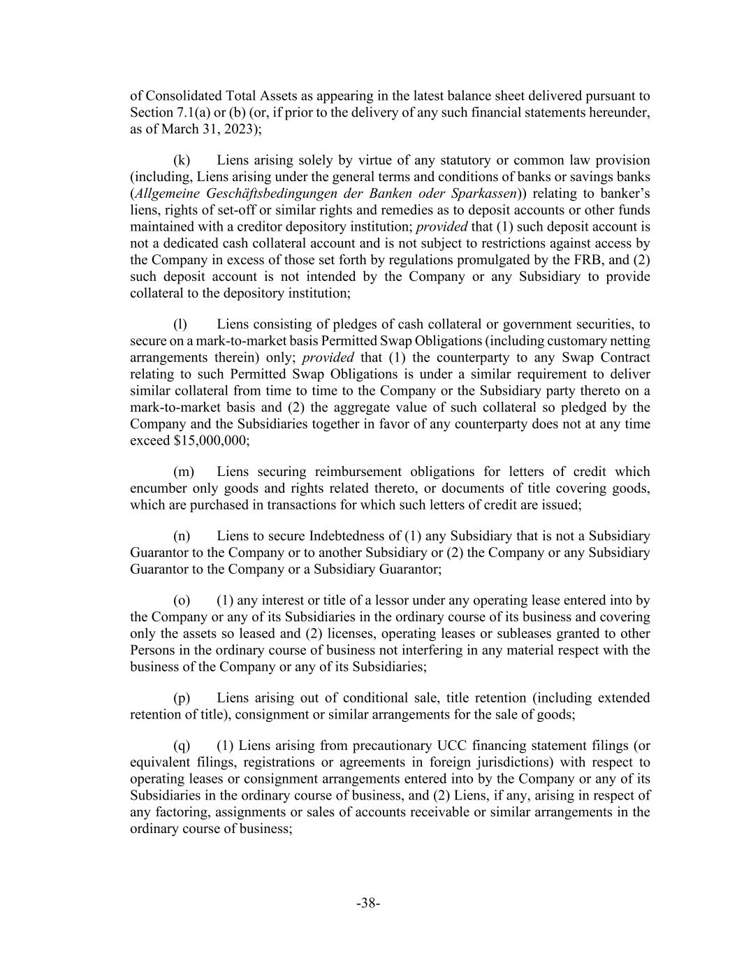 -38- of Consolidated Total Assets as appearing in the latest balance sheet delivered pursuant to Section 7.1(a) or (b) (or, if prior to the delivery of any such financial statements hereunder, as of March 31, 2023); (k) Liens arising solely by virtue of any statutory or common law provision (including, Liens arising under the general terms and conditions of banks or savings banks (Allgemeine Geschäftsbedingungen der Banken oder Sparkassen)) relating to banker’s liens, rights of set-off or similar rights and remedies as to deposit accounts or other funds maintained with a creditor depository institution; provided that (1) such deposit account is not a dedicated cash collateral account and is not subject to restrictions against access by the Company in excess of those set forth by regulations promulgated by the FRB, and (2) such deposit account is not intended by the Company or any Subsidiary to provide collateral to the depository institution; (l) Liens consisting of pledges of cash collateral or government securities, to secure on a mark-to-market basis Permitted Swap Obligations (including customary netting arrangements therein) only; provided that (1) the counterparty to any Swap Contract relating to such Permitted Swap Obligations is under a similar requirement to deliver similar collateral from time to time to the Company or the Subsidiary party thereto on a mark-to-market basis and (2) the aggregate value of such collateral so pledged by the Company and the Subsidiaries together in favor of any counterparty does not at any time exceed $15,000,000; (m) Liens securing reimbursement obligations for letters of credit which encumber only goods and rights related thereto, or documents of title covering goods, which are purchased in transactions for which such letters of credit are issued; (n) Liens to secure Indebtedness of (1) any Subsidiary that is not a Subsidiary Guarantor to the Company or to another Subsidiary or (2) the Company or any Subsidiary Guarantor to the Company or a Subsidiary Guarantor; (o) (1) any interest or title of a lessor under any operating lease entered into by the Company or any of its Subsidiaries in the ordinary course of its business and covering only the assets so leased and (2) licenses, operating leases or subleases granted to other Persons in the ordinary course of business not interfering in any material respect with the business of the Company or any of its Subsidiaries; (p) Liens arising out of conditional sale, title retention (including extended retention of title), consignment or similar arrangements for the sale of goods; (q) (1) Liens arising from precautionary UCC financing statement filings (or equivalent filings, registrations or agreements in foreign jurisdictions) with respect to operating leases or consignment arrangements entered into by the Company or any of its Subsidiaries in the ordinary course of business, and (2) Liens, if any, arising in respect of any factoring, assignments or sales of accounts receivable or similar arrangements in the ordinary course of business;