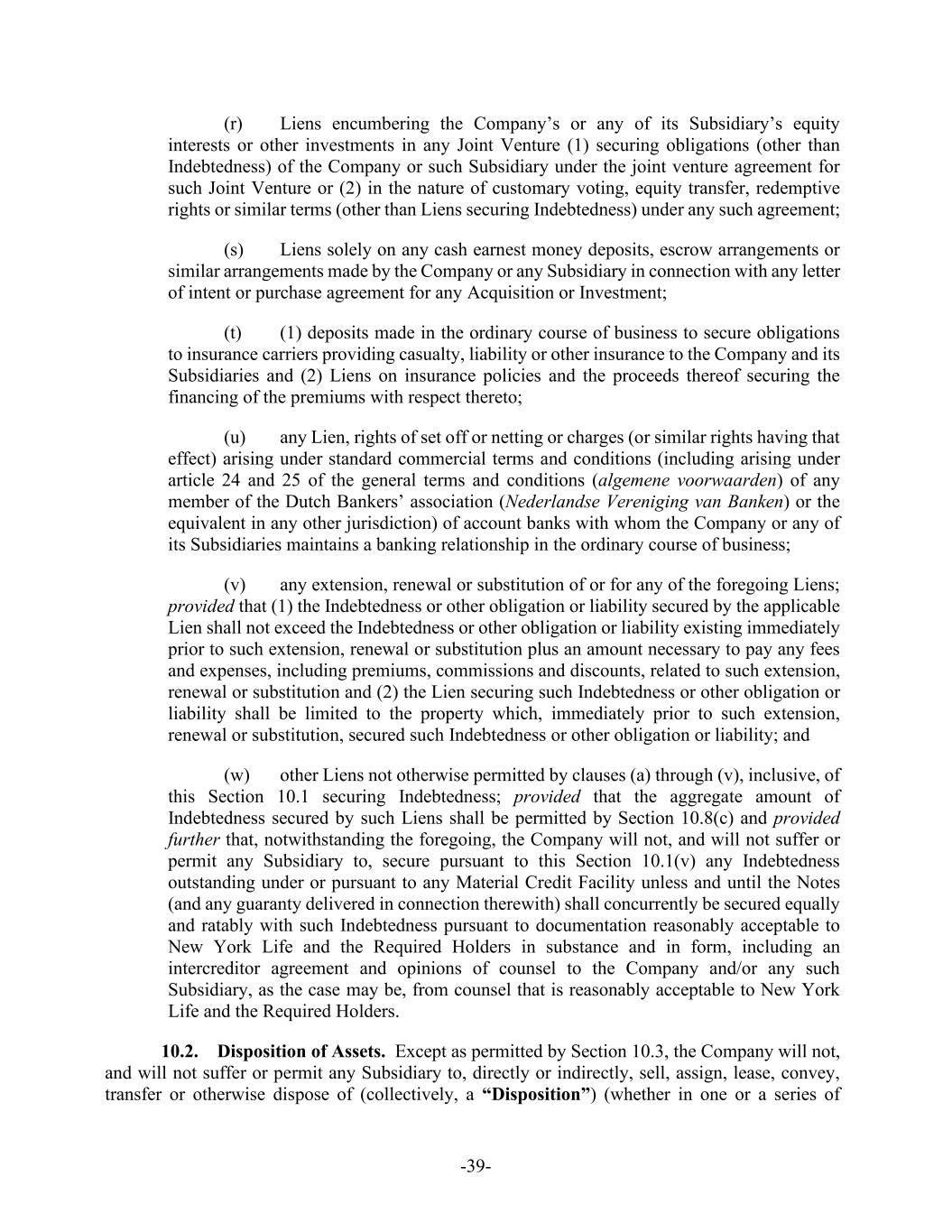 -39- (r) Liens encumbering the Company’s or any of its Subsidiary’s equity interests or other investments in any Joint Venture (1) securing obligations (other than Indebtedness) of the Company or such Subsidiary under the joint venture agreement for such Joint Venture or (2) in the nature of customary voting, equity transfer, redemptive rights or similar terms (other than Liens securing Indebtedness) under any such agreement; (s) Liens solely on any cash earnest money deposits, escrow arrangements or similar arrangements made by the Company or any Subsidiary in connection with any letter of intent or purchase agreement for any Acquisition or Investment; (t) (1) deposits made in the ordinary course of business to secure obligations to insurance carriers providing casualty, liability or other insurance to the Company and its Subsidiaries and (2) Liens on insurance policies and the proceeds thereof securing the financing of the premiums with respect thereto; (u) any Lien, rights of set off or netting or charges (or similar rights having that effect) arising under standard commercial terms and conditions (including arising under article 24 and 25 of the general terms and conditions (algemene voorwaarden) of any member of the Dutch Bankers’ association (Nederlandse Vereniging van Banken) or the equivalent in any other jurisdiction) of account banks with whom the Company or any of its Subsidiaries maintains a banking relationship in the ordinary course of business; (v) any extension, renewal or substitution of or for any of the foregoing Liens; provided that (1) the Indebtedness or other obligation or liability secured by the applicable Lien shall not exceed the Indebtedness or other obligation or liability existing immediately prior to such extension, renewal or substitution plus an amount necessary to pay any fees and expenses, including premiums, commissions and discounts, related to such extension, renewal or substitution and (2) the Lien securing such Indebtedness or other obligation or liability shall be limited to the property which, immediately prior to such extension, renewal or substitution, secured such Indebtedness or other obligation or liability; and (w) other Liens not otherwise permitted by clauses (a) through (v), inclusive, of this Section 10.1 securing Indebtedness; provided that the aggregate amount of Indebtedness secured by such Liens shall be permitted by Section 10.8(c) and provided further that, notwithstanding the foregoing, the Company will not, and will not suffer or permit any Subsidiary to, secure pursuant to this Section 10.1(v) any Indebtedness outstanding under or pursuant to any Material Credit Facility unless and until the Notes (and any guaranty delivered in connection therewith) shall concurrently be secured equally and ratably with such Indebtedness pursuant to documentation reasonably acceptable to New York Life and the Required Holders in substance and in form, including an intercreditor agreement and opinions of counsel to the Company and/or any such Subsidiary, as the case may be, from counsel that is reasonably acceptable to New York Life and the Required Holders. 10.2. Disposition of Assets. Except as permitted by Section 10.3, the Company will not, and will not suffer or permit any Subsidiary to, directly or indirectly, sell, assign, lease, convey, transfer or otherwise dispose of (collectively, a “Disposition”) (whether in one or a series of