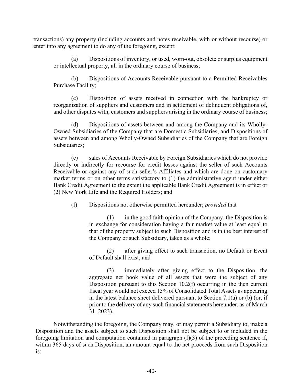 -40- transactions) any property (including accounts and notes receivable, with or without recourse) or enter into any agreement to do any of the foregoing, except: (a) Dispositions of inventory, or used, worn-out, obsolete or surplus equipment or intellectual property, all in the ordinary course of business; (b) Dispositions of Accounts Receivable pursuant to a Permitted Receivables Purchase Facility; (c) Disposition of assets received in connection with the bankruptcy or reorganization of suppliers and customers and in settlement of delinquent obligations of, and other disputes with, customers and suppliers arising in the ordinary course of business; (d) Dispositions of assets between and among the Company and its Wholly- Owned Subsidiaries of the Company that are Domestic Subsidiaries, and Dispositions of assets between and among Wholly-Owned Subsidiaries of the Company that are Foreign Subsidiaries; (e) sales of Accounts Receivable by Foreign Subsidiaries which do not provide directly or indirectly for recourse for credit losses against the seller of such Accounts Receivable or against any of such seller’s Affiliates and which are done on customary market terms or on other terms satisfactory to (1) the administrative agent under either Bank Credit Agreement to the extent the applicable Bank Credit Agreement is in effect or (2) New York Life and the Required Holders; and (f) Dispositions not otherwise permitted hereunder; provided that (1) in the good faith opinion of the Company, the Disposition is in exchange for consideration having a fair market value at least equal to that of the property subject to such Disposition and is in the best interest of the Company or such Subsidiary, taken as a whole; (2) after giving effect to such transaction, no Default or Event of Default shall exist; and (3) immediately after giving effect to the Disposition, the aggregate net book value of all assets that were the subject of any Disposition pursuant to this Section 10.2(f) occurring in the then current fiscal year would not exceed 15% of Consolidated Total Assets as appearing in the latest balance sheet delivered pursuant to Section 7.1(a) or (b) (or, if prior to the delivery of any such financial statements hereunder, as of March 31, 2023). Notwithstanding the foregoing, the Company may, or may permit a Subsidiary to, make a Disposition and the assets subject to such Disposition shall not be subject to or included in the foregoing limitation and computation contained in paragraph (f)(3) of the preceding sentence if, within 365 days of such Disposition, an amount equal to the net proceeds from such Disposition is: