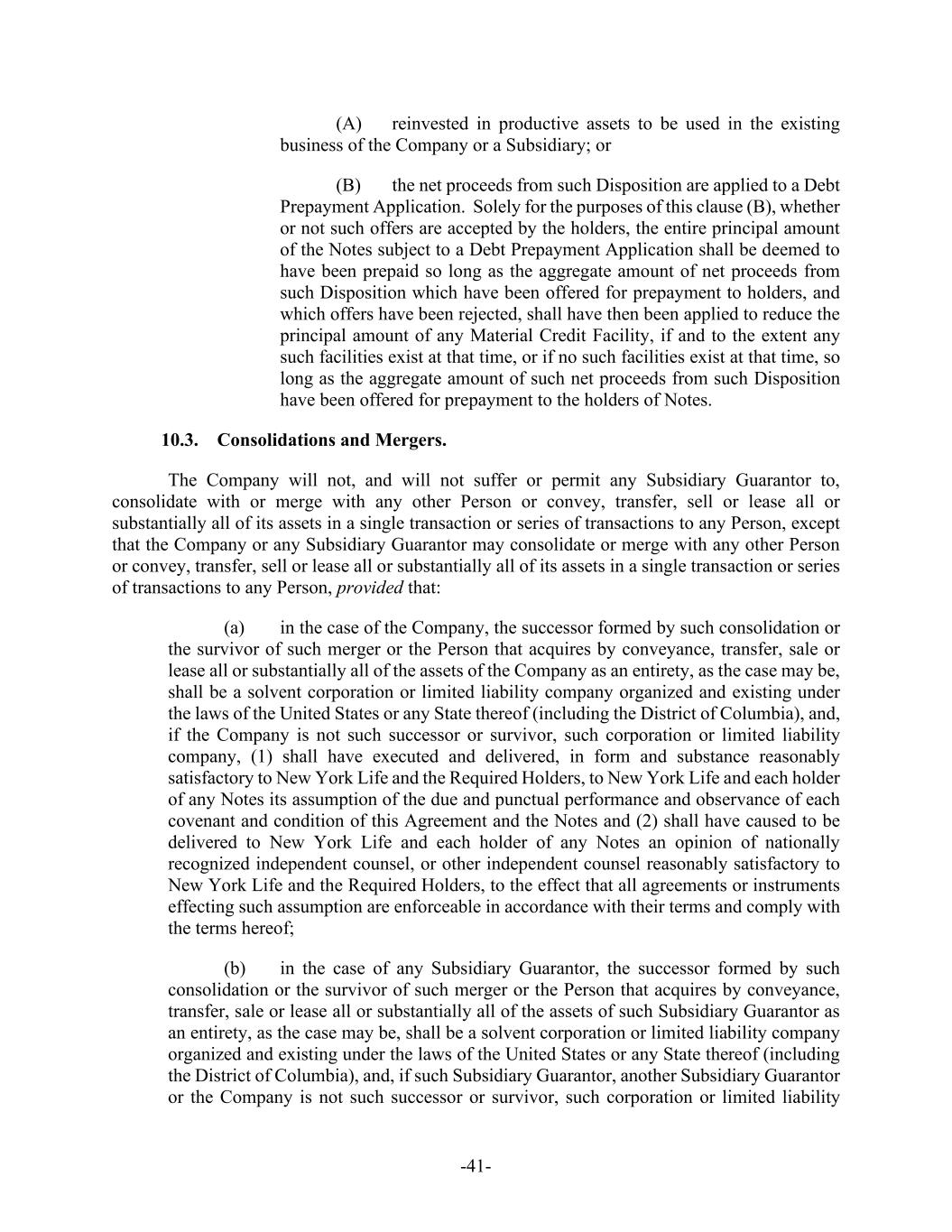 -41- (A) reinvested in productive assets to be used in the existing business of the Company or a Subsidiary; or (B) the net proceeds from such Disposition are applied to a Debt Prepayment Application. Solely for the purposes of this clause (B), whether or not such offers are accepted by the holders, the entire principal amount of the Notes subject to a Debt Prepayment Application shall be deemed to have been prepaid so long as the aggregate amount of net proceeds from such Disposition which have been offered for prepayment to holders, and which offers have been rejected, shall have then been applied to reduce the principal amount of any Material Credit Facility, if and to the extent any such facilities exist at that time, or if no such facilities exist at that time, so long as the aggregate amount of such net proceeds from such Disposition have been offered for prepayment to the holders of Notes. 10.3. Consolidations and Mergers. The Company will not, and will not suffer or permit any Subsidiary Guarantor to, consolidate with or merge with any other Person or convey, transfer, sell or lease all or substantially all of its assets in a single transaction or series of transactions to any Person, except that the Company or any Subsidiary Guarantor may consolidate or merge with any other Person or convey, transfer, sell or lease all or substantially all of its assets in a single transaction or series of transactions to any Person, provided that: (a) in the case of the Company, the successor formed by such consolidation or the survivor of such merger or the Person that acquires by conveyance, transfer, sale or lease all or substantially all of the assets of the Company as an entirety, as the case may be, shall be a solvent corporation or limited liability company organized and existing under the laws of the United States or any State thereof (including the District of Columbia), and, if the Company is not such successor or survivor, such corporation or limited liability company, (1) shall have executed and delivered, in form and substance reasonably satisfactory to New York Life and the Required Holders, to New York Life and each holder of any Notes its assumption of the due and punctual performance and observance of each covenant and condition of this Agreement and the Notes and (2) shall have caused to be delivered to New York Life and each holder of any Notes an opinion of nationally recognized independent counsel, or other independent counsel reasonably satisfactory to New York Life and the Required Holders, to the effect that all agreements or instruments effecting such assumption are enforceable in accordance with their terms and comply with the terms hereof; (b) in the case of any Subsidiary Guarantor, the successor formed by such consolidation or the survivor of such merger or the Person that acquires by conveyance, transfer, sale or lease all or substantially all of the assets of such Subsidiary Guarantor as an entirety, as the case may be, shall be a solvent corporation or limited liability company organized and existing under the laws of the United States or any State thereof (including the District of Columbia), and, if such Subsidiary Guarantor, another Subsidiary Guarantor or the Company is not such successor or survivor, such corporation or limited liability