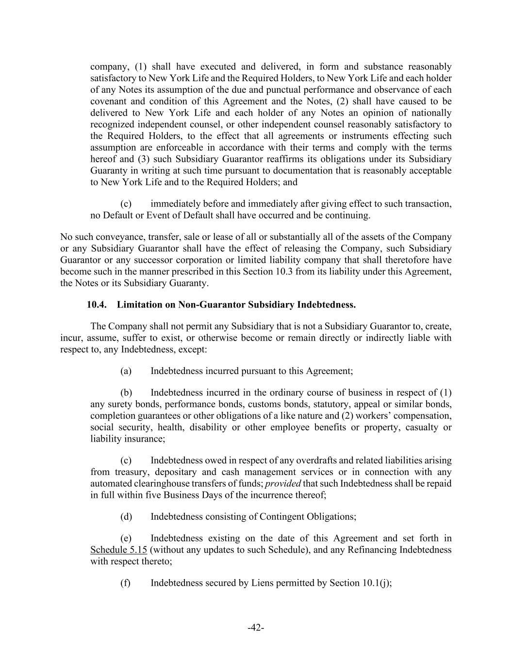 -42- company, (1) shall have executed and delivered, in form and substance reasonably satisfactory to New York Life and the Required Holders, to New York Life and each holder of any Notes its assumption of the due and punctual performance and observance of each covenant and condition of this Agreement and the Notes, (2) shall have caused to be delivered to New York Life and each holder of any Notes an opinion of nationally recognized independent counsel, or other independent counsel reasonably satisfactory to the Required Holders, to the effect that all agreements or instruments effecting such assumption are enforceable in accordance with their terms and comply with the terms hereof and (3) such Subsidiary Guarantor reaffirms its obligations under its Subsidiary Guaranty in writing at such time pursuant to documentation that is reasonably acceptable to New York Life and to the Required Holders; and (c) immediately before and immediately after giving effect to such transaction, no Default or Event of Default shall have occurred and be continuing. No such conveyance, transfer, sale or lease of all or substantially all of the assets of the Company or any Subsidiary Guarantor shall have the effect of releasing the Company, such Subsidiary Guarantor or any successor corporation or limited liability company that shall theretofore have become such in the manner prescribed in this Section 10.3 from its liability under this Agreement, the Notes or its Subsidiary Guaranty. 10.4. Limitation on Non-Guarantor Subsidiary Indebtedness. The Company shall not permit any Subsidiary that is not a Subsidiary Guarantor to, create, incur, assume, suffer to exist, or otherwise become or remain directly or indirectly liable with respect to, any Indebtedness, except: (a) Indebtedness incurred pursuant to this Agreement; (b) Indebtedness incurred in the ordinary course of business in respect of (1) any surety bonds, performance bonds, customs bonds, statutory, appeal or similar bonds, completion guarantees or other obligations of a like nature and (2) workers’ compensation, social security, health, disability or other employee benefits or property, casualty or liability insurance; (c) Indebtedness owed in respect of any overdrafts and related liabilities arising from treasury, depositary and cash management services or in connection with any automated clearinghouse transfers of funds; provided that such Indebtedness shall be repaid in full within five Business Days of the incurrence thereof; (d) Indebtedness consisting of Contingent Obligations; (e) Indebtedness existing on the date of this Agreement and set forth in Schedule 5.15 (without any updates to such Schedule), and any Refinancing Indebtedness with respect thereto; (f) Indebtedness secured by Liens permitted by Section 10.1(j);