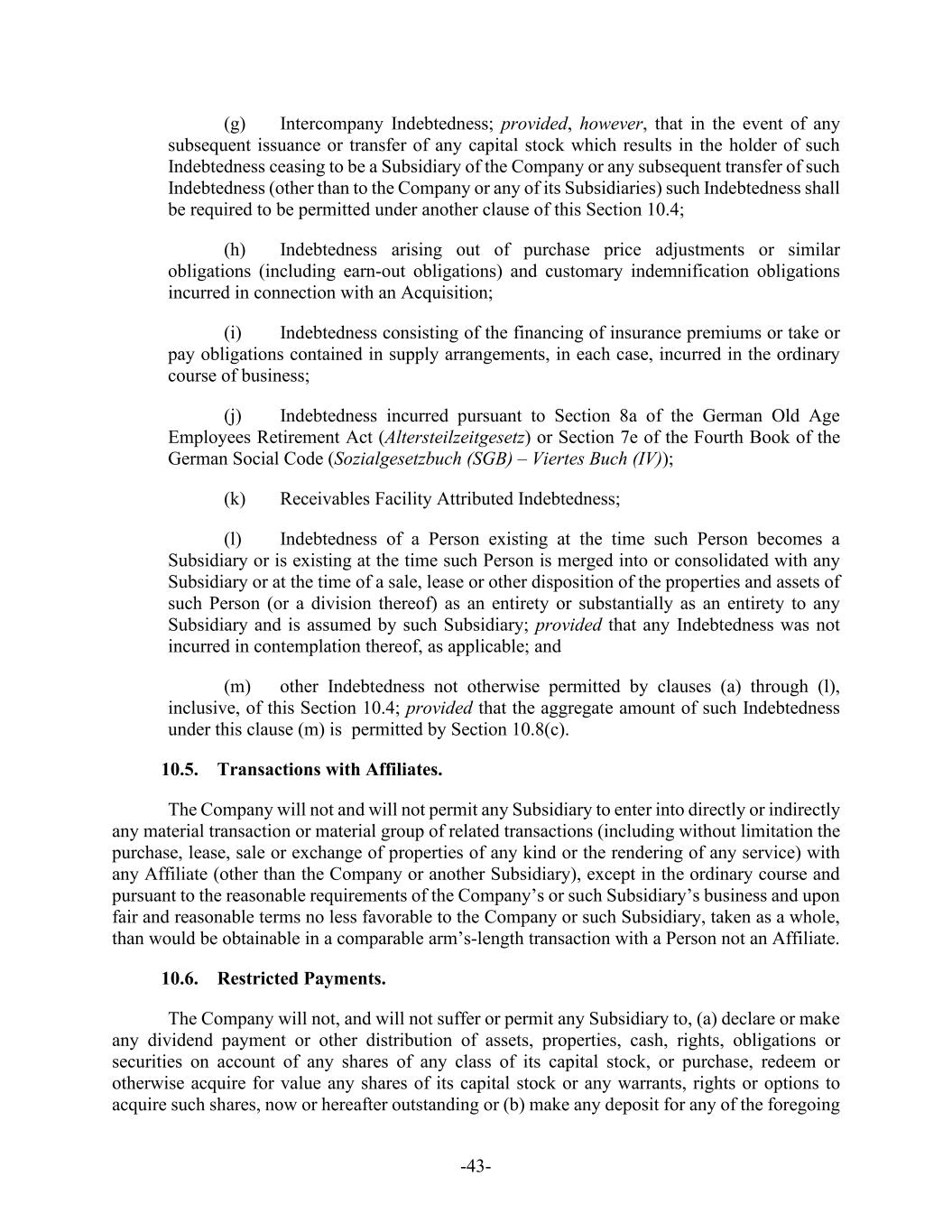 -43- (g) Intercompany Indebtedness; provided, however, that in the event of any subsequent issuance or transfer of any capital stock which results in the holder of such Indebtedness ceasing to be a Subsidiary of the Company or any subsequent transfer of such Indebtedness (other than to the Company or any of its Subsidiaries) such Indebtedness shall be required to be permitted under another clause of this Section 10.4; (h) Indebtedness arising out of purchase price adjustments or similar obligations (including earn-out obligations) and customary indemnification obligations incurred in connection with an Acquisition; (i) Indebtedness consisting of the financing of insurance premiums or take or pay obligations contained in supply arrangements, in each case, incurred in the ordinary course of business; (j) Indebtedness incurred pursuant to Section 8a of the German Old Age Employees Retirement Act (Altersteilzeitgesetz) or Section 7e of the Fourth Book of the German Social Code (Sozialgesetzbuch (SGB) – Viertes Buch (IV)); (k) Receivables Facility Attributed Indebtedness; (l) Indebtedness of a Person existing at the time such Person becomes a Subsidiary or is existing at the time such Person is merged into or consolidated with any Subsidiary or at the time of a sale, lease or other disposition of the properties and assets of such Person (or a division thereof) as an entirety or substantially as an entirety to any Subsidiary and is assumed by such Subsidiary; provided that any Indebtedness was not incurred in contemplation thereof, as applicable; and (m) other Indebtedness not otherwise permitted by clauses (a) through (l), inclusive, of this Section 10.4; provided that the aggregate amount of such Indebtedness under this clause (m) is permitted by Section 10.8(c). 10.5. Transactions with Affiliates. The Company will not and will not permit any Subsidiary to enter into directly or indirectly any material transaction or material group of related transactions (including without limitation the purchase, lease, sale or exchange of properties of any kind or the rendering of any service) with any Affiliate (other than the Company or another Subsidiary), except in the ordinary course and pursuant to the reasonable requirements of the Company’s or such Subsidiary’s business and upon fair and reasonable terms no less favorable to the Company or such Subsidiary, taken as a whole, than would be obtainable in a comparable arm’s-length transaction with a Person not an Affiliate. 10.6. Restricted Payments. The Company will not, and will not suffer or permit any Subsidiary to, (a) declare or make any dividend payment or other distribution of assets, properties, cash, rights, obligations or securities on account of any shares of any class of its capital stock, or purchase, redeem or otherwise acquire for value any shares of its capital stock or any warrants, rights or options to acquire such shares, now or hereafter outstanding or (b) make any deposit for any of the foregoing