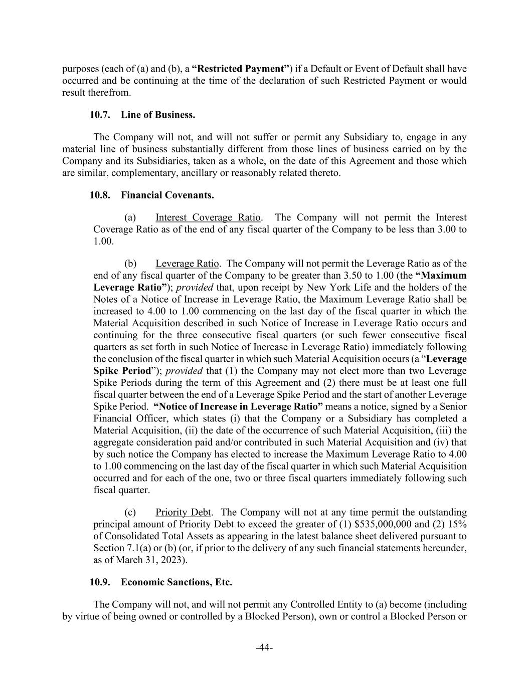 -44- purposes (each of (a) and (b), a “Restricted Payment”) if a Default or Event of Default shall have occurred and be continuing at the time of the declaration of such Restricted Payment or would result therefrom. 10.7. Line of Business. The Company will not, and will not suffer or permit any Subsidiary to, engage in any material line of business substantially different from those lines of business carried on by the Company and its Subsidiaries, taken as a whole, on the date of this Agreement and those which are similar, complementary, ancillary or reasonably related thereto. 10.8. Financial Covenants. (a) Interest Coverage Ratio. The Company will not permit the Interest Coverage Ratio as of the end of any fiscal quarter of the Company to be less than 3.00 to 1.00. (b) Leverage Ratio. The Company will not permit the Leverage Ratio as of the end of any fiscal quarter of the Company to be greater than 3.50 to 1.00 (the “Maximum Leverage Ratio”); provided that, upon receipt by New York Life and the holders of the Notes of a Notice of Increase in Leverage Ratio, the Maximum Leverage Ratio shall be increased to 4.00 to 1.00 commencing on the last day of the fiscal quarter in which the Material Acquisition described in such Notice of Increase in Leverage Ratio occurs and continuing for the three consecutive fiscal quarters (or such fewer consecutive fiscal quarters as set forth in such Notice of Increase in Leverage Ratio) immediately following the conclusion of the fiscal quarter in which such Material Acquisition occurs (a “Leverage Spike Period”); provided that (1) the Company may not elect more than two Leverage Spike Periods during the term of this Agreement and (2) there must be at least one full fiscal quarter between the end of a Leverage Spike Period and the start of another Leverage Spike Period. “Notice of Increase in Leverage Ratio” means a notice, signed by a Senior Financial Officer, which states (i) that the Company or a Subsidiary has completed a Material Acquisition, (ii) the date of the occurrence of such Material Acquisition, (iii) the aggregate consideration paid and/or contributed in such Material Acquisition and (iv) that by such notice the Company has elected to increase the Maximum Leverage Ratio to 4.00 to 1.00 commencing on the last day of the fiscal quarter in which such Material Acquisition occurred and for each of the one, two or three fiscal quarters immediately following such fiscal quarter. (c) Priority Debt. The Company will not at any time permit the outstanding principal amount of Priority Debt to exceed the greater of (1) $535,000,000 and (2) 15% of Consolidated Total Assets as appearing in the latest balance sheet delivered pursuant to Section 7.1(a) or (b) (or, if prior to the delivery of any such financial statements hereunder, as of March 31, 2023). 10.9. Economic Sanctions, Etc. The Company will not, and will not permit any Controlled Entity to (a) become (including by virtue of being owned or controlled by a Blocked Person), own or control a Blocked Person or