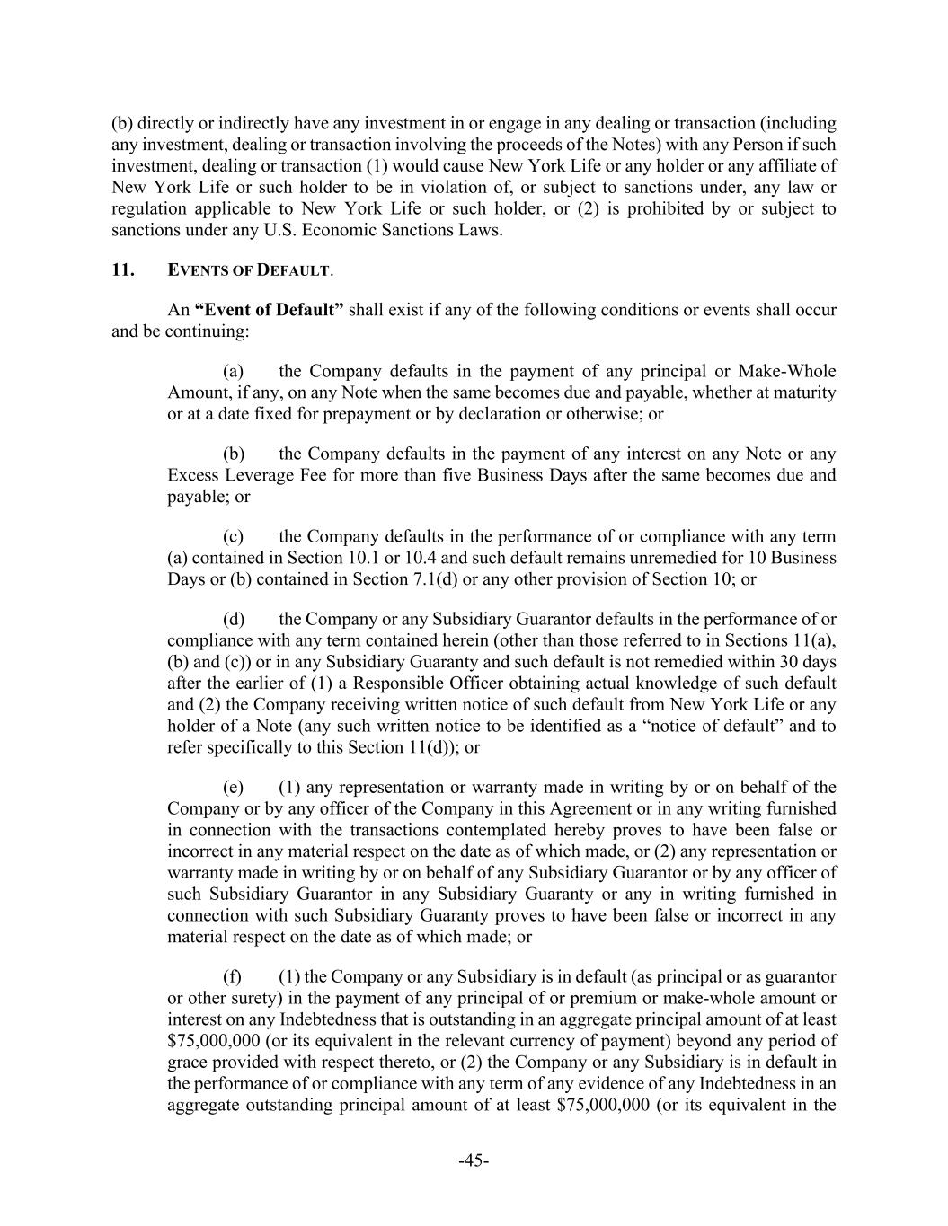 -45- (b) directly or indirectly have any investment in or engage in any dealing or transaction (including any investment, dealing or transaction involving the proceeds of the Notes) with any Person if such investment, dealing or transaction (1) would cause New York Life or any holder or any affiliate of New York Life or such holder to be in violation of, or subject to sanctions under, any law or regulation applicable to New York Life or such holder, or (2) is prohibited by or subject to sanctions under any U.S. Economic Sanctions Laws. 11. EVENTS OF DEFAULT. An “Event of Default” shall exist if any of the following conditions or events shall occur and be continuing: (a) the Company defaults in the payment of any principal or Make-Whole Amount, if any, on any Note when the same becomes due and payable, whether at maturity or at a date fixed for prepayment or by declaration or otherwise; or (b) the Company defaults in the payment of any interest on any Note or any Excess Leverage Fee for more than five Business Days after the same becomes due and payable; or (c) the Company defaults in the performance of or compliance with any term (a) contained in Section 10.1 or 10.4 and such default remains unremedied for 10 Business Days or (b) contained in Section 7.1(d) or any other provision of Section 10; or (d) the Company or any Subsidiary Guarantor defaults in the performance of or compliance with any term contained herein (other than those referred to in Sections 11(a), (b) and (c)) or in any Subsidiary Guaranty and such default is not remedied within 30 days after the earlier of (1) a Responsible Officer obtaining actual knowledge of such default and (2) the Company receiving written notice of such default from New York Life or any holder of a Note (any such written notice to be identified as a “notice of default” and to refer specifically to this Section 11(d)); or (e) (1) any representation or warranty made in writing by or on behalf of the Company or by any officer of the Company in this Agreement or in any writing furnished in connection with the transactions contemplated hereby proves to have been false or incorrect in any material respect on the date as of which made, or (2) any representation or warranty made in writing by or on behalf of any Subsidiary Guarantor or by any officer of such Subsidiary Guarantor in any Subsidiary Guaranty or any in writing furnished in connection with such Subsidiary Guaranty proves to have been false or incorrect in any material respect on the date as of which made; or (f) (1) the Company or any Subsidiary is in default (as principal or as guarantor or other surety) in the payment of any principal of or premium or make-whole amount or interest on any Indebtedness that is outstanding in an aggregate principal amount of at least $75,000,000 (or its equivalent in the relevant currency of payment) beyond any period of grace provided with respect thereto, or (2) the Company or any Subsidiary is in default in the performance of or compliance with any term of any evidence of any Indebtedness in an aggregate outstanding principal amount of at least $75,000,000 (or its equivalent in the