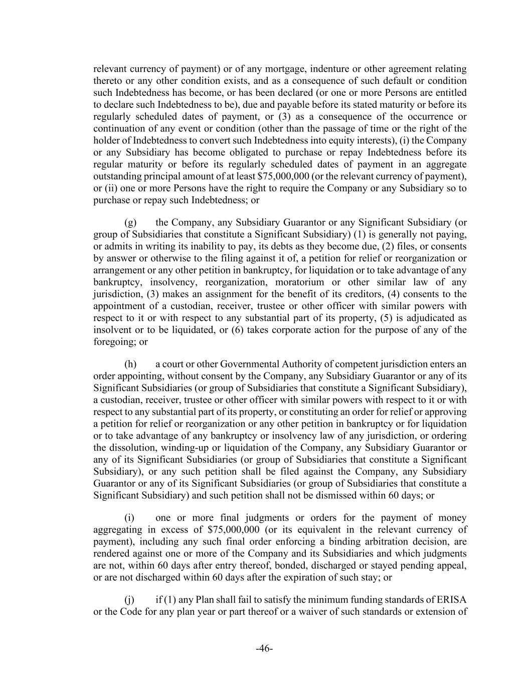 -46- relevant currency of payment) or of any mortgage, indenture or other agreement relating thereto or any other condition exists, and as a consequence of such default or condition such Indebtedness has become, or has been declared (or one or more Persons are entitled to declare such Indebtedness to be), due and payable before its stated maturity or before its regularly scheduled dates of payment, or (3) as a consequence of the occurrence or continuation of any event or condition (other than the passage of time or the right of the holder of Indebtedness to convert such Indebtedness into equity interests), (i) the Company or any Subsidiary has become obligated to purchase or repay Indebtedness before its regular maturity or before its regularly scheduled dates of payment in an aggregate outstanding principal amount of at least $75,000,000 (or the relevant currency of payment), or (ii) one or more Persons have the right to require the Company or any Subsidiary so to purchase or repay such Indebtedness; or (g) the Company, any Subsidiary Guarantor or any Significant Subsidiary (or group of Subsidiaries that constitute a Significant Subsidiary) (1) is generally not paying, or admits in writing its inability to pay, its debts as they become due, (2) files, or consents by answer or otherwise to the filing against it of, a petition for relief or reorganization or arrangement or any other petition in bankruptcy, for liquidation or to take advantage of any bankruptcy, insolvency, reorganization, moratorium or other similar law of any jurisdiction, (3) makes an assignment for the benefit of its creditors, (4) consents to the appointment of a custodian, receiver, trustee or other officer with similar powers with respect to it or with respect to any substantial part of its property, (5) is adjudicated as insolvent or to be liquidated, or (6) takes corporate action for the purpose of any of the foregoing; or (h) a court or other Governmental Authority of competent jurisdiction enters an order appointing, without consent by the Company, any Subsidiary Guarantor or any of its Significant Subsidiaries (or group of Subsidiaries that constitute a Significant Subsidiary), a custodian, receiver, trustee or other officer with similar powers with respect to it or with respect to any substantial part of its property, or constituting an order for relief or approving a petition for relief or reorganization or any other petition in bankruptcy or for liquidation or to take advantage of any bankruptcy or insolvency law of any jurisdiction, or ordering the dissolution, winding-up or liquidation of the Company, any Subsidiary Guarantor or any of its Significant Subsidiaries (or group of Subsidiaries that constitute a Significant Subsidiary), or any such petition shall be filed against the Company, any Subsidiary Guarantor or any of its Significant Subsidiaries (or group of Subsidiaries that constitute a Significant Subsidiary) and such petition shall not be dismissed within 60 days; or (i) one or more final judgments or orders for the payment of money aggregating in excess of $75,000,000 (or its equivalent in the relevant currency of payment), including any such final order enforcing a binding arbitration decision, are rendered against one or more of the Company and its Subsidiaries and which judgments are not, within 60 days after entry thereof, bonded, discharged or stayed pending appeal, or are not discharged within 60 days after the expiration of such stay; or (j) if (1) any Plan shall fail to satisfy the minimum funding standards of ERISA or the Code for any plan year or part thereof or a waiver of such standards or extension of