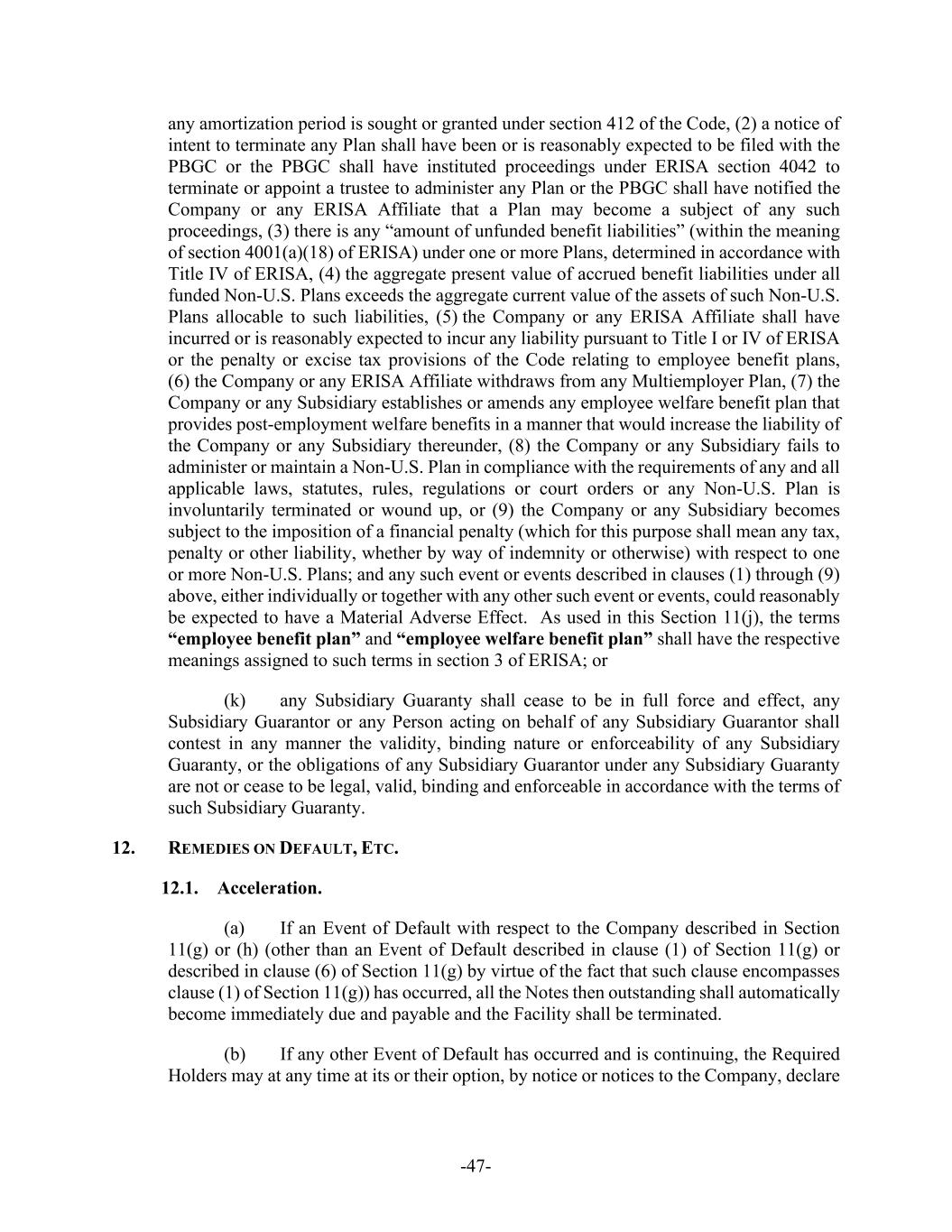 -47- any amortization period is sought or granted under section 412 of the Code, (2) a notice of intent to terminate any Plan shall have been or is reasonably expected to be filed with the PBGC or the PBGC shall have instituted proceedings under ERISA section 4042 to terminate or appoint a trustee to administer any Plan or the PBGC shall have notified the Company or any ERISA Affiliate that a Plan may become a subject of any such proceedings, (3) there is any “amount of unfunded benefit liabilities” (within the meaning of section 4001(a)(18) of ERISA) under one or more Plans, determined in accordance with Title IV of ERISA, (4) the aggregate present value of accrued benefit liabilities under all funded Non-U.S. Plans exceeds the aggregate current value of the assets of such Non-U.S. Plans allocable to such liabilities, (5) the Company or any ERISA Affiliate shall have incurred or is reasonably expected to incur any liability pursuant to Title I or IV of ERISA or the penalty or excise tax provisions of the Code relating to employee benefit plans, (6) the Company or any ERISA Affiliate withdraws from any Multiemployer Plan, (7) the Company or any Subsidiary establishes or amends any employee welfare benefit plan that provides post-employment welfare benefits in a manner that would increase the liability of the Company or any Subsidiary thereunder, (8) the Company or any Subsidiary fails to administer or maintain a Non-U.S. Plan in compliance with the requirements of any and all applicable laws, statutes, rules, regulations or court orders or any Non-U.S. Plan is involuntarily terminated or wound up, or (9) the Company or any Subsidiary becomes subject to the imposition of a financial penalty (which for this purpose shall mean any tax, penalty or other liability, whether by way of indemnity or otherwise) with respect to one or more Non-U.S. Plans; and any such event or events described in clauses (1) through (9) above, either individually or together with any other such event or events, could reasonably be expected to have a Material Adverse Effect. As used in this Section 11(j), the terms “employee benefit plan” and “employee welfare benefit plan” shall have the respective meanings assigned to such terms in section 3 of ERISA; or (k) any Subsidiary Guaranty shall cease to be in full force and effect, any Subsidiary Guarantor or any Person acting on behalf of any Subsidiary Guarantor shall contest in any manner the validity, binding nature or enforceability of any Subsidiary Guaranty, or the obligations of any Subsidiary Guarantor under any Subsidiary Guaranty are not or cease to be legal, valid, binding and enforceable in accordance with the terms of such Subsidiary Guaranty. 12. REMEDIES ON DEFAULT, ETC. 12.1. Acceleration. (a) If an Event of Default with respect to the Company described in Section 11(g) or (h) (other than an Event of Default described in clause (1) of Section 11(g) or described in clause (6) of Section 11(g) by virtue of the fact that such clause encompasses clause (1) of Section 11(g)) has occurred, all the Notes then outstanding shall automatically become immediately due and payable and the Facility shall be terminated. (b) If any other Event of Default has occurred and is continuing, the Required Holders may at any time at its or their option, by notice or notices to the Company, declare