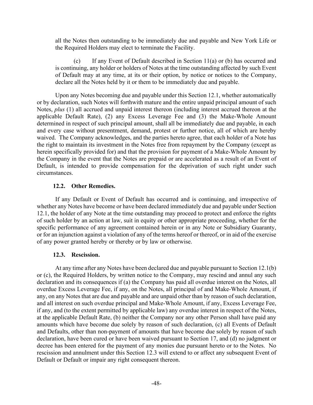 -48- all the Notes then outstanding to be immediately due and payable and New York Life or the Required Holders may elect to terminate the Facility. (c) If any Event of Default described in Section 11(a) or (b) has occurred and is continuing, any holder or holders of Notes at the time outstanding affected by such Event of Default may at any time, at its or their option, by notice or notices to the Company, declare all the Notes held by it or them to be immediately due and payable. Upon any Notes becoming due and payable under this Section 12.1, whether automatically or by declaration, such Notes will forthwith mature and the entire unpaid principal amount of such Notes, plus (1) all accrued and unpaid interest thereon (including interest accrued thereon at the applicable Default Rate), (2) any Excess Leverage Fee and (3) the Make-Whole Amount determined in respect of such principal amount, shall all be immediately due and payable, in each and every case without presentment, demand, protest or further notice, all of which are hereby waived. The Company acknowledges, and the parties hereto agree, that each holder of a Note has the right to maintain its investment in the Notes free from repayment by the Company (except as herein specifically provided for) and that the provision for payment of a Make-Whole Amount by the Company in the event that the Notes are prepaid or are accelerated as a result of an Event of Default, is intended to provide compensation for the deprivation of such right under such circumstances. 12.2. Other Remedies. If any Default or Event of Default has occurred and is continuing, and irrespective of whether any Notes have become or have been declared immediately due and payable under Section 12.1, the holder of any Note at the time outstanding may proceed to protect and enforce the rights of such holder by an action at law, suit in equity or other appropriate proceeding, whether for the specific performance of any agreement contained herein or in any Note or Subsidiary Guaranty, or for an injunction against a violation of any of the terms hereof or thereof, or in aid of the exercise of any power granted hereby or thereby or by law or otherwise. 12.3. Rescission. At any time after any Notes have been declared due and payable pursuant to Section 12.1(b) or (c), the Required Holders, by written notice to the Company, may rescind and annul any such declaration and its consequences if (a) the Company has paid all overdue interest on the Notes, all overdue Excess Leverage Fee, if any, on the Notes, all principal of and Make-Whole Amount, if any, on any Notes that are due and payable and are unpaid other than by reason of such declaration, and all interest on such overdue principal and Make-Whole Amount, if any, Excess Leverage Fee, if any, and (to the extent permitted by applicable law) any overdue interest in respect of the Notes, at the applicable Default Rate, (b) neither the Company nor any other Person shall have paid any amounts which have become due solely by reason of such declaration, (c) all Events of Default and Defaults, other than non-payment of amounts that have become due solely by reason of such declaration, have been cured or have been waived pursuant to Section 17, and (d) no judgment or decree has been entered for the payment of any monies due pursuant hereto or to the Notes. No rescission and annulment under this Section 12.3 will extend to or affect any subsequent Event of Default or Default or impair any right consequent thereon.