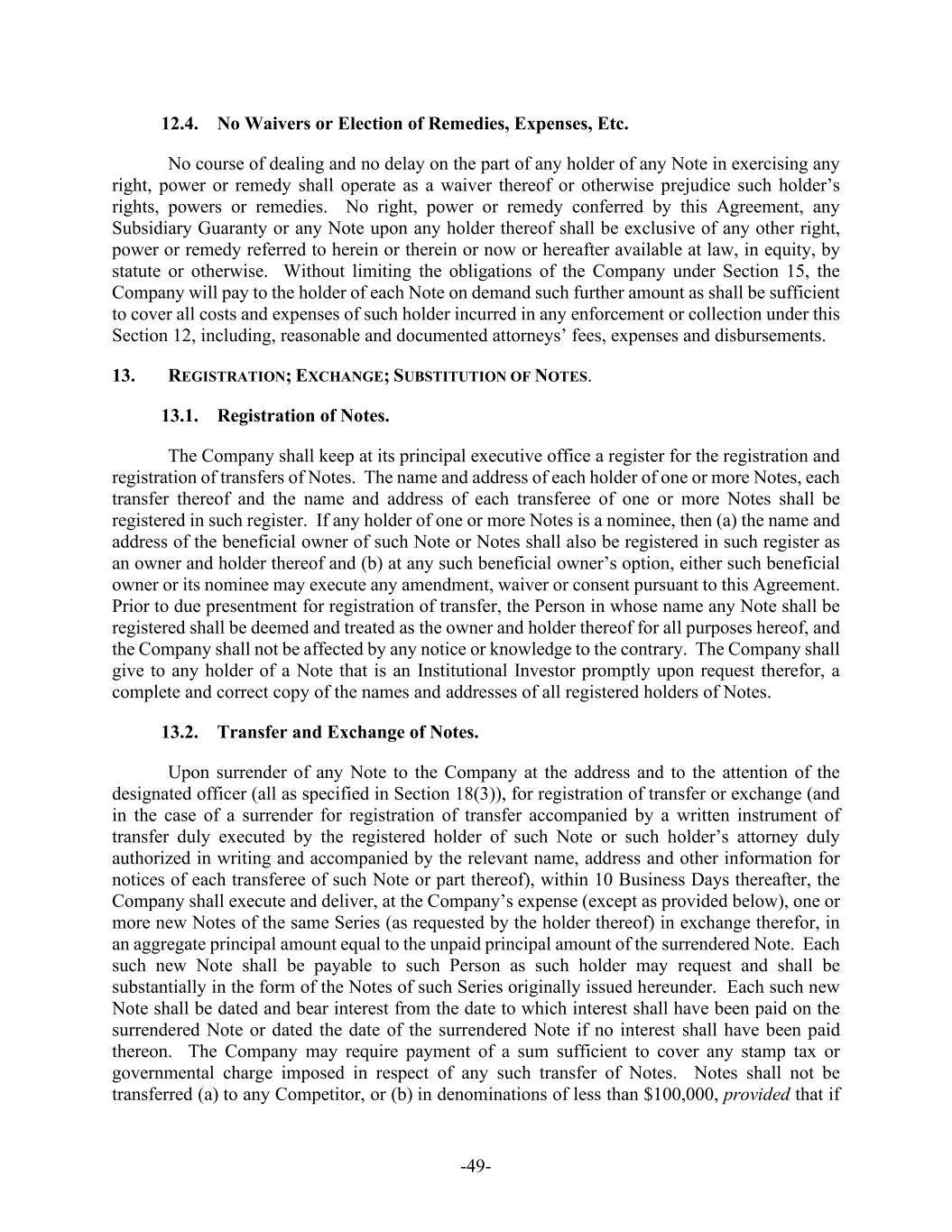 -49- 12.4. No Waivers or Election of Remedies, Expenses, Etc. No course of dealing and no delay on the part of any holder of any Note in exercising any right, power or remedy shall operate as a waiver thereof or otherwise prejudice such holder’s rights, powers or remedies. No right, power or remedy conferred by this Agreement, any Subsidiary Guaranty or any Note upon any holder thereof shall be exclusive of any other right, power or remedy referred to herein or therein or now or hereafter available at law, in equity, by statute or otherwise. Without limiting the obligations of the Company under Section 15, the Company will pay to the holder of each Note on demand such further amount as shall be sufficient to cover all costs and expenses of such holder incurred in any enforcement or collection under this Section 12, including, reasonable and documented attorneys’ fees, expenses and disbursements. 13. REGISTRATION; EXCHANGE; SUBSTITUTION OF NOTES. 13.1. Registration of Notes. The Company shall keep at its principal executive office a register for the registration and registration of transfers of Notes. The name and address of each holder of one or more Notes, each transfer thereof and the name and address of each transferee of one or more Notes shall be registered in such register. If any holder of one or more Notes is a nominee, then (a) the name and address of the beneficial owner of such Note or Notes shall also be registered in such register as an owner and holder thereof and (b) at any such beneficial owner’s option, either such beneficial owner or its nominee may execute any amendment, waiver or consent pursuant to this Agreement. Prior to due presentment for registration of transfer, the Person in whose name any Note shall be registered shall be deemed and treated as the owner and holder thereof for all purposes hereof, and the Company shall not be affected by any notice or knowledge to the contrary. The Company shall give to any holder of a Note that is an Institutional Investor promptly upon request therefor, a complete and correct copy of the names and addresses of all registered holders of Notes. 13.2. Transfer and Exchange of Notes. Upon surrender of any Note to the Company at the address and to the attention of the designated officer (all as specified in Section 18(3)), for registration of transfer or exchange (and in the case of a surrender for registration of transfer accompanied by a written instrument of transfer duly executed by the registered holder of such Note or such holder’s attorney duly authorized in writing and accompanied by the relevant name, address and other information for notices of each transferee of such Note or part thereof), within 10 Business Days thereafter, the Company shall execute and deliver, at the Company’s expense (except as provided below), one or more new Notes of the same Series (as requested by the holder thereof) in exchange therefor, in an aggregate principal amount equal to the unpaid principal amount of the surrendered Note. Each such new Note shall be payable to such Person as such holder may request and shall be substantially in the form of the Notes of such Series originally issued hereunder. Each such new Note shall be dated and bear interest from the date to which interest shall have been paid on the surrendered Note or dated the date of the surrendered Note if no interest shall have been paid thereon. The Company may require payment of a sum sufficient to cover any stamp tax or governmental charge imposed in respect of any such transfer of Notes. Notes shall not be transferred (a) to any Competitor, or (b) in denominations of less than $100,000, provided that if