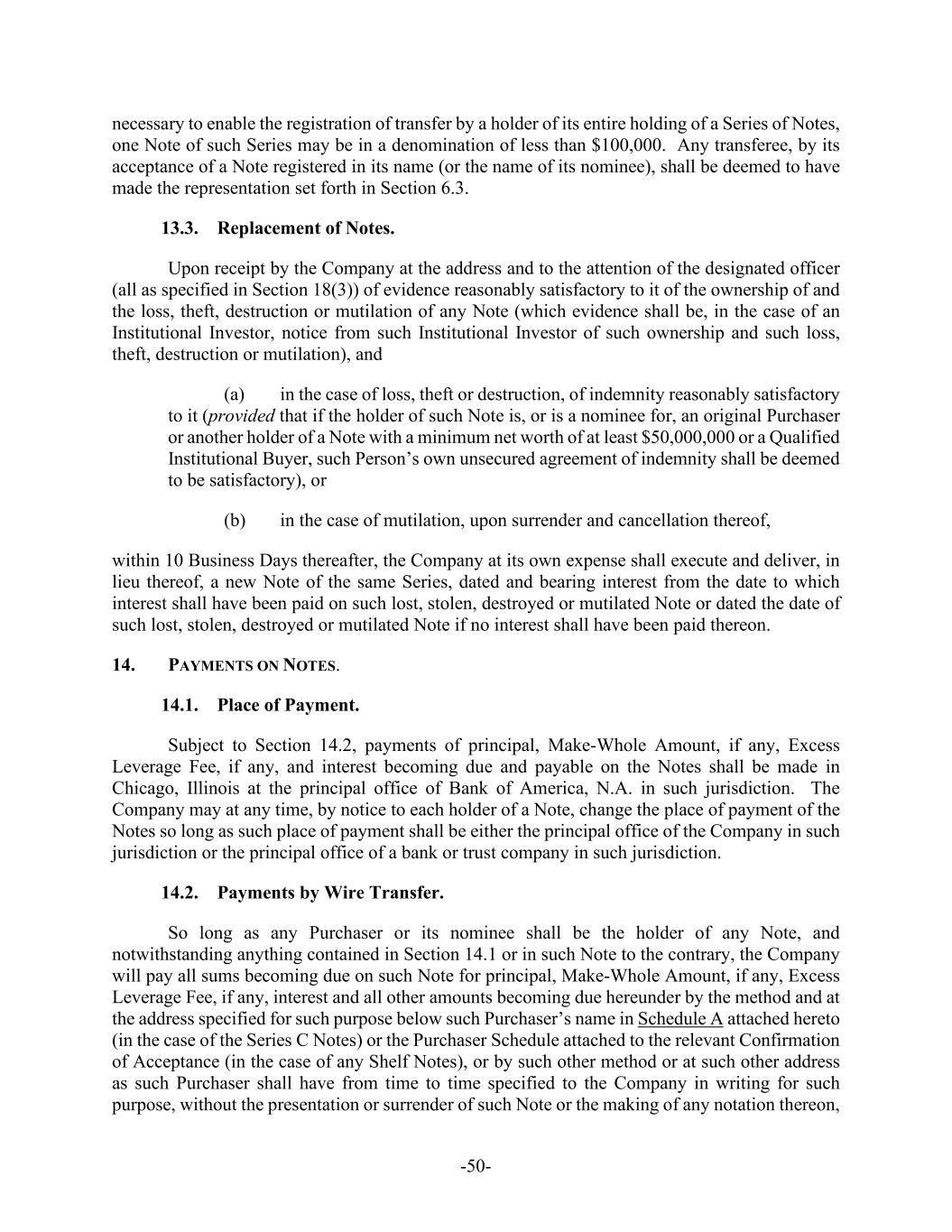 -50- necessary to enable the registration of transfer by a holder of its entire holding of a Series of Notes, one Note of such Series may be in a denomination of less than $100,000. Any transferee, by its acceptance of a Note registered in its name (or the name of its nominee), shall be deemed to have made the representation set forth in Section 6.3. 13.3. Replacement of Notes. Upon receipt by the Company at the address and to the attention of the designated officer (all as specified in Section 18(3)) of evidence reasonably satisfactory to it of the ownership of and the loss, theft, destruction or mutilation of any Note (which evidence shall be, in the case of an Institutional Investor, notice from such Institutional Investor of such ownership and such loss, theft, destruction or mutilation), and (a) in the case of loss, theft or destruction, of indemnity reasonably satisfactory to it (provided that if the holder of such Note is, or is a nominee for, an original Purchaser or another holder of a Note with a minimum net worth of at least $50,000,000 or a Qualified Institutional Buyer, such Person’s own unsecured agreement of indemnity shall be deemed to be satisfactory), or (b) in the case of mutilation, upon surrender and cancellation thereof, within 10 Business Days thereafter, the Company at its own expense shall execute and deliver, in lieu thereof, a new Note of the same Series, dated and bearing interest from the date to which interest shall have been paid on such lost, stolen, destroyed or mutilated Note or dated the date of such lost, stolen, destroyed or mutilated Note if no interest shall have been paid thereon. 14. PAYMENTS ON NOTES. 14.1. Place of Payment. Subject to Section 14.2, payments of principal, Make-Whole Amount, if any, Excess Leverage Fee, if any, and interest becoming due and payable on the Notes shall be made in Chicago, Illinois at the principal office of Bank of America, N.A. in such jurisdiction. The Company may at any time, by notice to each holder of a Note, change the place of payment of the Notes so long as such place of payment shall be either the principal office of the Company in such jurisdiction or the principal office of a bank or trust company in such jurisdiction. 14.2. Payments by Wire Transfer. So long as any Purchaser or its nominee shall be the holder of any Note, and notwithstanding anything contained in Section 14.1 or in such Note to the contrary, the Company will pay all sums becoming due on such Note for principal, Make-Whole Amount, if any, Excess Leverage Fee, if any, interest and all other amounts becoming due hereunder by the method and at the address specified for such purpose below such Purchaser’s name in Schedule A attached hereto (in the case of the Series C Notes) or the Purchaser Schedule attached to the relevant Confirmation of Acceptance (in the case of any Shelf Notes), or by such other method or at such other address as such Purchaser shall have from time to time specified to the Company in writing for such purpose, without the presentation or surrender of such Note or the making of any notation thereon,