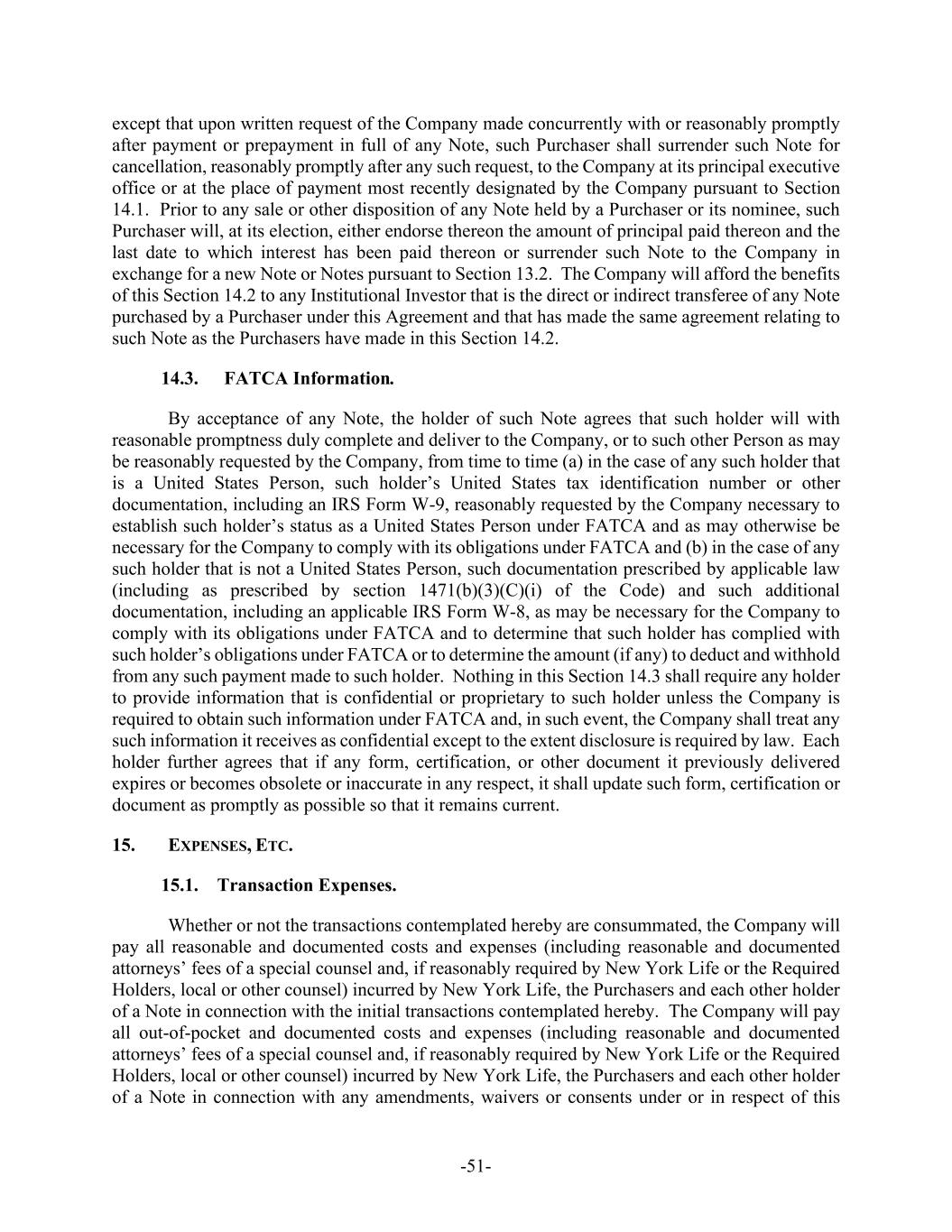 -51- except that upon written request of the Company made concurrently with or reasonably promptly after payment or prepayment in full of any Note, such Purchaser shall surrender such Note for cancellation, reasonably promptly after any such request, to the Company at its principal executive office or at the place of payment most recently designated by the Company pursuant to Section 14.1. Prior to any sale or other disposition of any Note held by a Purchaser or its nominee, such Purchaser will, at its election, either endorse thereon the amount of principal paid thereon and the last date to which interest has been paid thereon or surrender such Note to the Company in exchange for a new Note or Notes pursuant to Section 13.2. The Company will afford the benefits of this Section 14.2 to any Institutional Investor that is the direct or indirect transferee of any Note purchased by a Purchaser under this Agreement and that has made the same agreement relating to such Note as the Purchasers have made in this Section 14.2. 14.3. FATCA Information. By acceptance of any Note, the holder of such Note agrees that such holder will with reasonable promptness duly complete and deliver to the Company, or to such other Person as may be reasonably requested by the Company, from time to time (a) in the case of any such holder that is a United States Person, such holder’s United States tax identification number or other documentation, including an IRS Form W-9, reasonably requested by the Company necessary to establish such holder’s status as a United States Person under FATCA and as may otherwise be necessary for the Company to comply with its obligations under FATCA and (b) in the case of any such holder that is not a United States Person, such documentation prescribed by applicable law (including as prescribed by section 1471(b)(3)(C)(i) of the Code) and such additional documentation, including an applicable IRS Form W-8, as may be necessary for the Company to comply with its obligations under FATCA and to determine that such holder has complied with such holder’s obligations under FATCA or to determine the amount (if any) to deduct and withhold from any such payment made to such holder. Nothing in this Section 14.3 shall require any holder to provide information that is confidential or proprietary to such holder unless the Company is required to obtain such information under FATCA and, in such event, the Company shall treat any such information it receives as confidential except to the extent disclosure is required by law. Each holder further agrees that if any form, certification, or other document it previously delivered expires or becomes obsolete or inaccurate in any respect, it shall update such form, certification or document as promptly as possible so that it remains current. 15. EXPENSES, ETC. 15.1. Transaction Expenses. Whether or not the transactions contemplated hereby are consummated, the Company will pay all reasonable and documented costs and expenses (including reasonable and documented attorneys’ fees of a special counsel and, if reasonably required by New York Life or the Required Holders, local or other counsel) incurred by New York Life, the Purchasers and each other holder of a Note in connection with the initial transactions contemplated hereby. The Company will pay all out-of-pocket and documented costs and expenses (including reasonable and documented attorneys’ fees of a special counsel and, if reasonably required by New York Life or the Required Holders, local or other counsel) incurred by New York Life, the Purchasers and each other holder of a Note in connection with any amendments, waivers or consents under or in respect of this