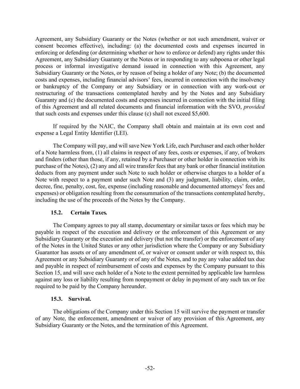 -52- Agreement, any Subsidiary Guaranty or the Notes (whether or not such amendment, waiver or consent becomes effective), including: (a) the documented costs and expenses incurred in enforcing or defending (or determining whether or how to enforce or defend) any rights under this Agreement, any Subsidiary Guaranty or the Notes or in responding to any subpoena or other legal process or informal investigative demand issued in connection with this Agreement, any Subsidiary Guaranty or the Notes, or by reason of being a holder of any Note; (b) the documented costs and expenses, including financial advisors’ fees, incurred in connection with the insolvency or bankruptcy of the Company or any Subsidiary or in connection with any work-out or restructuring of the transactions contemplated hereby and by the Notes and any Subsidiary Guaranty and (c) the documented costs and expenses incurred in connection with the initial filing of this Agreement and all related documents and financial information with the SVO, provided that such costs and expenses under this clause (c) shall not exceed $5,600. If required by the NAIC, the Company shall obtain and maintain at its own cost and expense a Legal Entity Identifier (LEI). The Company will pay, and will save New York Life, each Purchaser and each other holder of a Note harmless from, (1) all claims in respect of any fees, costs or expenses, if any, of brokers and finders (other than those, if any, retained by a Purchaser or other holder in connection with its purchase of the Notes), (2) any and all wire transfer fees that any bank or other financial institution deducts from any payment under such Note to such holder or otherwise charges to a holder of a Note with respect to a payment under such Note and (3) any judgment, liability, claim, order, decree, fine, penalty, cost, fee, expense (including reasonable and documented attorneys’ fees and expenses) or obligation resulting from the consummation of the transactions contemplated hereby, including the use of the proceeds of the Notes by the Company. 15.2. Certain Taxes. The Company agrees to pay all stamp, documentary or similar taxes or fees which may be payable in respect of the execution and delivery or the enforcement of this Agreement or any Subsidiary Guaranty or the execution and delivery (but not the transfer) or the enforcement of any of the Notes in the United States or any other jurisdiction where the Company or any Subsidiary Guarantor has assets or of any amendment of, or waiver or consent under or with respect to, this Agreement or any Subsidiary Guaranty or of any of the Notes, and to pay any value added tax due and payable in respect of reimbursement of costs and expenses by the Company pursuant to this Section 15, and will save each holder of a Note to the extent permitted by applicable law harmless against any loss or liability resulting from nonpayment or delay in payment of any such tax or fee required to be paid by the Company hereunder. 15.3. Survival. The obligations of the Company under this Section 15 will survive the payment or transfer of any Note, the enforcement, amendment or waiver of any provision of this Agreement, any Subsidiary Guaranty or the Notes, and the termination of this Agreement.