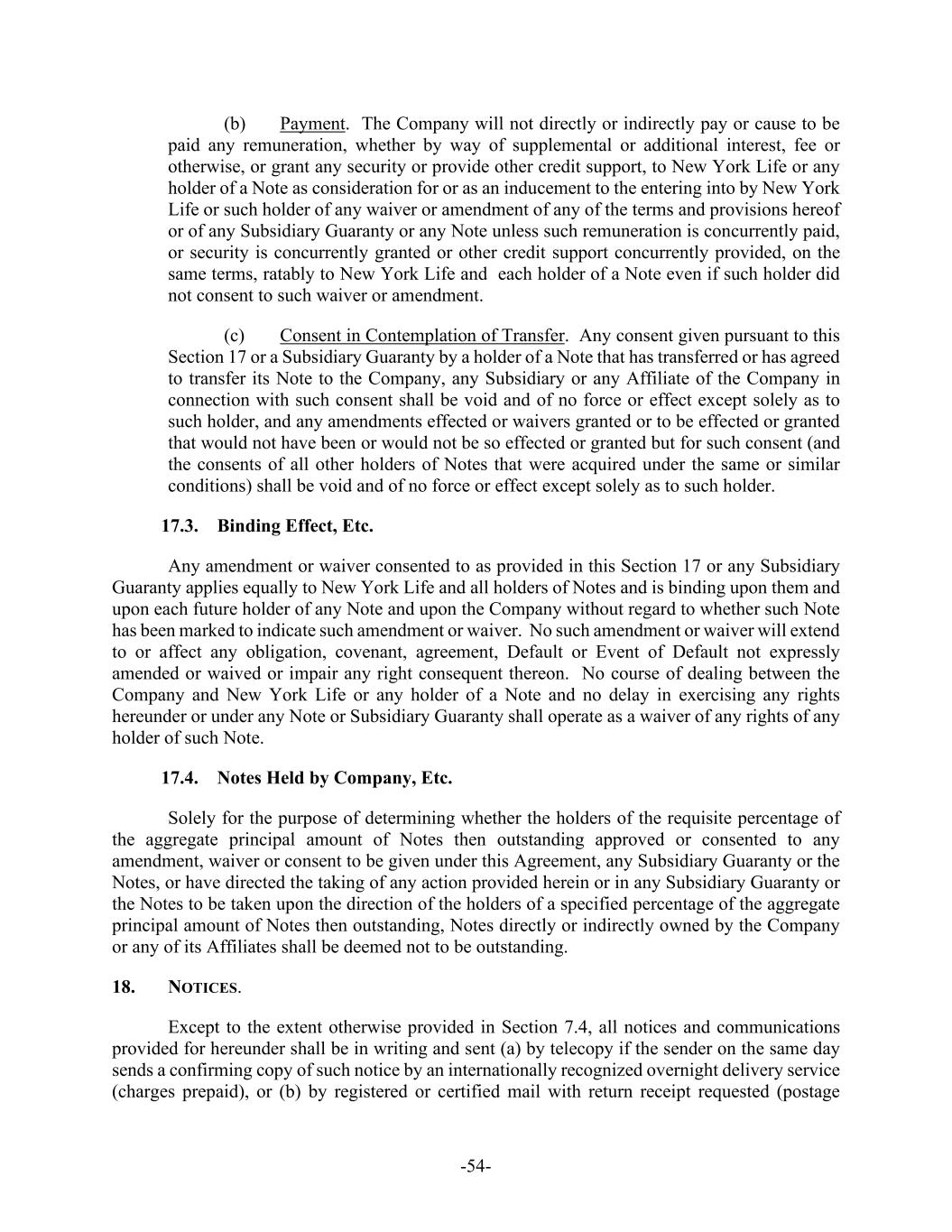 -54- (b) Payment. The Company will not directly or indirectly pay or cause to be paid any remuneration, whether by way of supplemental or additional interest, fee or otherwise, or grant any security or provide other credit support, to New York Life or any holder of a Note as consideration for or as an inducement to the entering into by New York Life or such holder of any waiver or amendment of any of the terms and provisions hereof or of any Subsidiary Guaranty or any Note unless such remuneration is concurrently paid, or security is concurrently granted or other credit support concurrently provided, on the same terms, ratably to New York Life and each holder of a Note even if such holder did not consent to such waiver or amendment. (c) Consent in Contemplation of Transfer. Any consent given pursuant to this Section 17 or a Subsidiary Guaranty by a holder of a Note that has transferred or has agreed to transfer its Note to the Company, any Subsidiary or any Affiliate of the Company in connection with such consent shall be void and of no force or effect except solely as to such holder, and any amendments effected or waivers granted or to be effected or granted that would not have been or would not be so effected or granted but for such consent (and the consents of all other holders of Notes that were acquired under the same or similar conditions) shall be void and of no force or effect except solely as to such holder. 17.3. Binding Effect, Etc. Any amendment or waiver consented to as provided in this Section 17 or any Subsidiary Guaranty applies equally to New York Life and all holders of Notes and is binding upon them and upon each future holder of any Note and upon the Company without regard to whether such Note has been marked to indicate such amendment or waiver. No such amendment or waiver will extend to or affect any obligation, covenant, agreement, Default or Event of Default not expressly amended or waived or impair any right consequent thereon. No course of dealing between the Company and New York Life or any holder of a Note and no delay in exercising any rights hereunder or under any Note or Subsidiary Guaranty shall operate as a waiver of any rights of any holder of such Note. 17.4. Notes Held by Company, Etc. Solely for the purpose of determining whether the holders of the requisite percentage of the aggregate principal amount of Notes then outstanding approved or consented to any amendment, waiver or consent to be given under this Agreement, any Subsidiary Guaranty or the Notes, or have directed the taking of any action provided herein or in any Subsidiary Guaranty or the Notes to be taken upon the direction of the holders of a specified percentage of the aggregate principal amount of Notes then outstanding, Notes directly or indirectly owned by the Company or any of its Affiliates shall be deemed not to be outstanding. 18. NOTICES. Except to the extent otherwise provided in Section 7.4, all notices and communications provided for hereunder shall be in writing and sent (a) by telecopy if the sender on the same day sends a confirming copy of such notice by an internationally recognized overnight delivery service (charges prepaid), or (b) by registered or certified mail with return receipt requested (postage