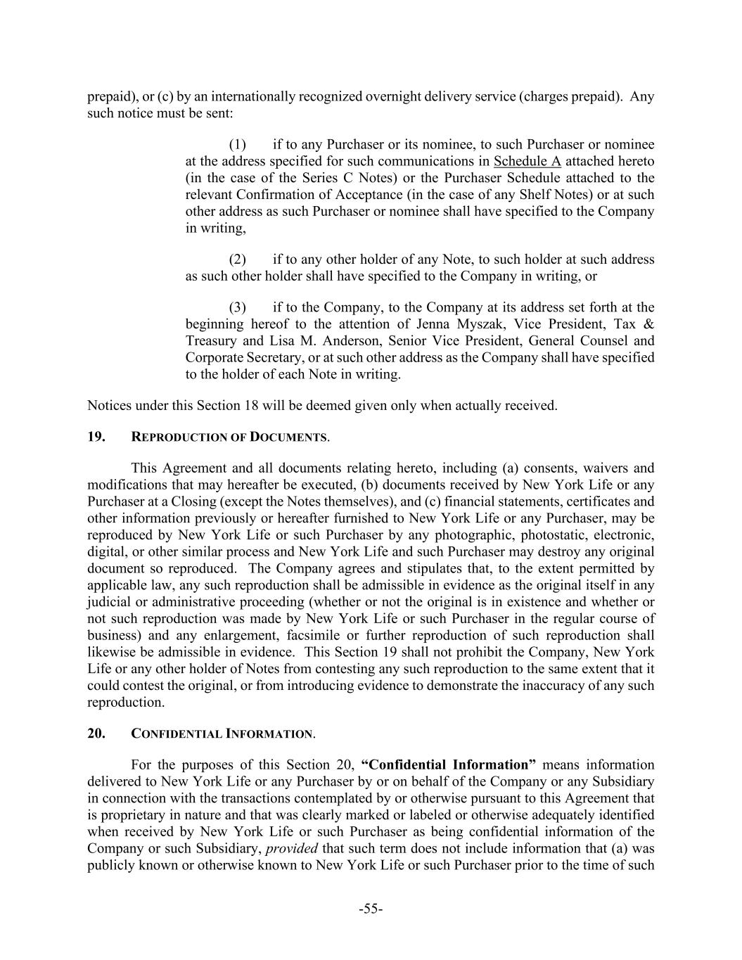 -55- prepaid), or (c) by an internationally recognized overnight delivery service (charges prepaid). Any such notice must be sent: (1) if to any Purchaser or its nominee, to such Purchaser or nominee at the address specified for such communications in Schedule A attached hereto (in the case of the Series C Notes) or the Purchaser Schedule attached to the relevant Confirmation of Acceptance (in the case of any Shelf Notes) or at such other address as such Purchaser or nominee shall have specified to the Company in writing, (2) if to any other holder of any Note, to such holder at such address as such other holder shall have specified to the Company in writing, or (3) if to the Company, to the Company at its address set forth at the beginning hereof to the attention of Jenna Myszak, Vice President, Tax & Treasury and Lisa M. Anderson, Senior Vice President, General Counsel and Corporate Secretary, or at such other address as the Company shall have specified to the holder of each Note in writing. Notices under this Section 18 will be deemed given only when actually received. 19. REPRODUCTION OF DOCUMENTS. This Agreement and all documents relating hereto, including (a) consents, waivers and modifications that may hereafter be executed, (b) documents received by New York Life or any Purchaser at a Closing (except the Notes themselves), and (c) financial statements, certificates and other information previously or hereafter furnished to New York Life or any Purchaser, may be reproduced by New York Life or such Purchaser by any photographic, photostatic, electronic, digital, or other similar process and New York Life and such Purchaser may destroy any original document so reproduced. The Company agrees and stipulates that, to the extent permitted by applicable law, any such reproduction shall be admissible in evidence as the original itself in any judicial or administrative proceeding (whether or not the original is in existence and whether or not such reproduction was made by New York Life or such Purchaser in the regular course of business) and any enlargement, facsimile or further reproduction of such reproduction shall likewise be admissible in evidence. This Section 19 shall not prohibit the Company, New York Life or any other holder of Notes from contesting any such reproduction to the same extent that it could contest the original, or from introducing evidence to demonstrate the inaccuracy of any such reproduction. 20. CONFIDENTIAL INFORMATION. For the purposes of this Section 20, “Confidential Information” means information delivered to New York Life or any Purchaser by or on behalf of the Company or any Subsidiary in connection with the transactions contemplated by or otherwise pursuant to this Agreement that is proprietary in nature and that was clearly marked or labeled or otherwise adequately identified when received by New York Life or such Purchaser as being confidential information of the Company or such Subsidiary, provided that such term does not include information that (a) was publicly known or otherwise known to New York Life or such Purchaser prior to the time of such