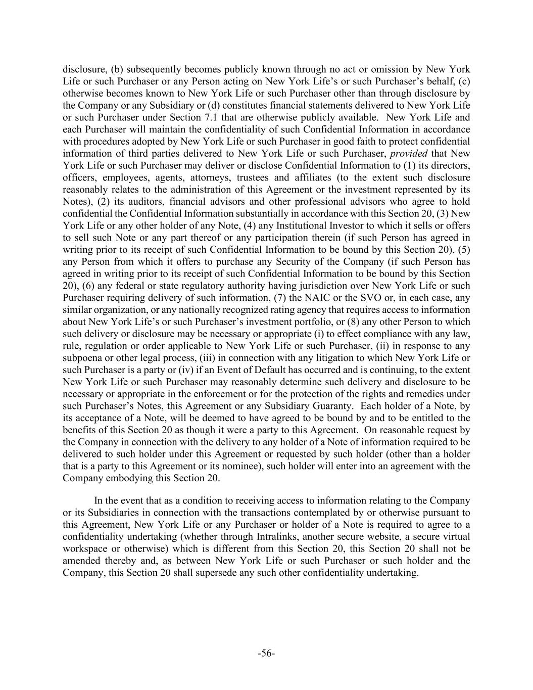 -56- disclosure, (b) subsequently becomes publicly known through no act or omission by New York Life or such Purchaser or any Person acting on New York Life’s or such Purchaser’s behalf, (c) otherwise becomes known to New York Life or such Purchaser other than through disclosure by the Company or any Subsidiary or (d) constitutes financial statements delivered to New York Life or such Purchaser under Section 7.1 that are otherwise publicly available. New York Life and each Purchaser will maintain the confidentiality of such Confidential Information in accordance with procedures adopted by New York Life or such Purchaser in good faith to protect confidential information of third parties delivered to New York Life or such Purchaser, provided that New York Life or such Purchaser may deliver or disclose Confidential Information to (1) its directors, officers, employees, agents, attorneys, trustees and affiliates (to the extent such disclosure reasonably relates to the administration of this Agreement or the investment represented by its Notes), (2) its auditors, financial advisors and other professional advisors who agree to hold confidential the Confidential Information substantially in accordance with this Section 20, (3) New York Life or any other holder of any Note, (4) any Institutional Investor to which it sells or offers to sell such Note or any part thereof or any participation therein (if such Person has agreed in writing prior to its receipt of such Confidential Information to be bound by this Section 20), (5) any Person from which it offers to purchase any Security of the Company (if such Person has agreed in writing prior to its receipt of such Confidential Information to be bound by this Section 20), (6) any federal or state regulatory authority having jurisdiction over New York Life or such Purchaser requiring delivery of such information, (7) the NAIC or the SVO or, in each case, any similar organization, or any nationally recognized rating agency that requires access to information about New York Life’s or such Purchaser’s investment portfolio, or (8) any other Person to which such delivery or disclosure may be necessary or appropriate (i) to effect compliance with any law, rule, regulation or order applicable to New York Life or such Purchaser, (ii) in response to any subpoena or other legal process, (iii) in connection with any litigation to which New York Life or such Purchaser is a party or (iv) if an Event of Default has occurred and is continuing, to the extent New York Life or such Purchaser may reasonably determine such delivery and disclosure to be necessary or appropriate in the enforcement or for the protection of the rights and remedies under such Purchaser’s Notes, this Agreement or any Subsidiary Guaranty. Each holder of a Note, by its acceptance of a Note, will be deemed to have agreed to be bound by and to be entitled to the benefits of this Section 20 as though it were a party to this Agreement. On reasonable request by the Company in connection with the delivery to any holder of a Note of information required to be delivered to such holder under this Agreement or requested by such holder (other than a holder that is a party to this Agreement or its nominee), such holder will enter into an agreement with the Company embodying this Section 20. In the event that as a condition to receiving access to information relating to the Company or its Subsidiaries in connection with the transactions contemplated by or otherwise pursuant to this Agreement, New York Life or any Purchaser or holder of a Note is required to agree to a confidentiality undertaking (whether through Intralinks, another secure website, a secure virtual workspace or otherwise) which is different from this Section 20, this Section 20 shall not be amended thereby and, as between New York Life or such Purchaser or such holder and the Company, this Section 20 shall supersede any such other confidentiality undertaking.