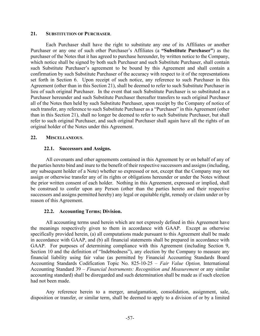 -57- 21. SUBSTITUTION OF PURCHASER. Each Purchaser shall have the right to substitute any one of its Affiliates or another Purchaser or any one of such other Purchaser’s Affiliates (a “Substitute Purchaser”) as the purchaser of the Notes that it has agreed to purchase hereunder, by written notice to the Company, which notice shall be signed by both such Purchaser and such Substitute Purchaser, shall contain such Substitute Purchaser’s agreement to be bound by this Agreement and shall contain a confirmation by such Substitute Purchaser of the accuracy with respect to it of the representations set forth in Section 6. Upon receipt of such notice, any reference to such Purchaser in this Agreement (other than in this Section 21), shall be deemed to refer to such Substitute Purchaser in lieu of such original Purchaser. In the event that such Substitute Purchaser is so substituted as a Purchaser hereunder and such Substitute Purchaser thereafter transfers to such original Purchaser all of the Notes then held by such Substitute Purchaser, upon receipt by the Company of notice of such transfer, any reference to such Substitute Purchaser as a “Purchaser” in this Agreement (other than in this Section 21), shall no longer be deemed to refer to such Substitute Purchaser, but shall refer to such original Purchaser, and such original Purchaser shall again have all the rights of an original holder of the Notes under this Agreement. 22. MISCELLANEOUS. 22.1. Successors and Assigns. All covenants and other agreements contained in this Agreement by or on behalf of any of the parties hereto bind and inure to the benefit of their respective successors and assigns (including, any subsequent holder of a Note) whether so expressed or not, except that the Company may not assign or otherwise transfer any of its rights or obligations hereunder or under the Notes without the prior written consent of each holder. Nothing in this Agreement, expressed or implied, shall be construed to confer upon any Person (other than the parties hereto and their respective successors and assigns permitted hereby) any legal or equitable right, remedy or claim under or by reason of this Agreement. 22.2. Accounting Terms; Division. All accounting terms used herein which are not expressly defined in this Agreement have the meanings respectively given to them in accordance with GAAP. Except as otherwise specifically provided herein, (a) all computations made pursuant to this Agreement shall be made in accordance with GAAP, and (b) all financial statements shall be prepared in accordance with GAAP. For purposes of determining compliance with this Agreement (including Section 9, Section 10 and the definition of “Indebtedness”), any election by the Company to measure any financial liability using fair value (as permitted by Financial Accounting Standards Board Accounting Standards Codification Topic No. 825-10-25 – Fair Value Option, International Accounting Standard 39 – Financial Instruments: Recognition and Measurement or any similar accounting standard) shall be disregarded and such determination shall be made as if such election had not been made. Any reference herein to a merger, amalgamation, consolidation, assignment, sale, disposition or transfer, or similar term, shall be deemed to apply to a division of or by a limited