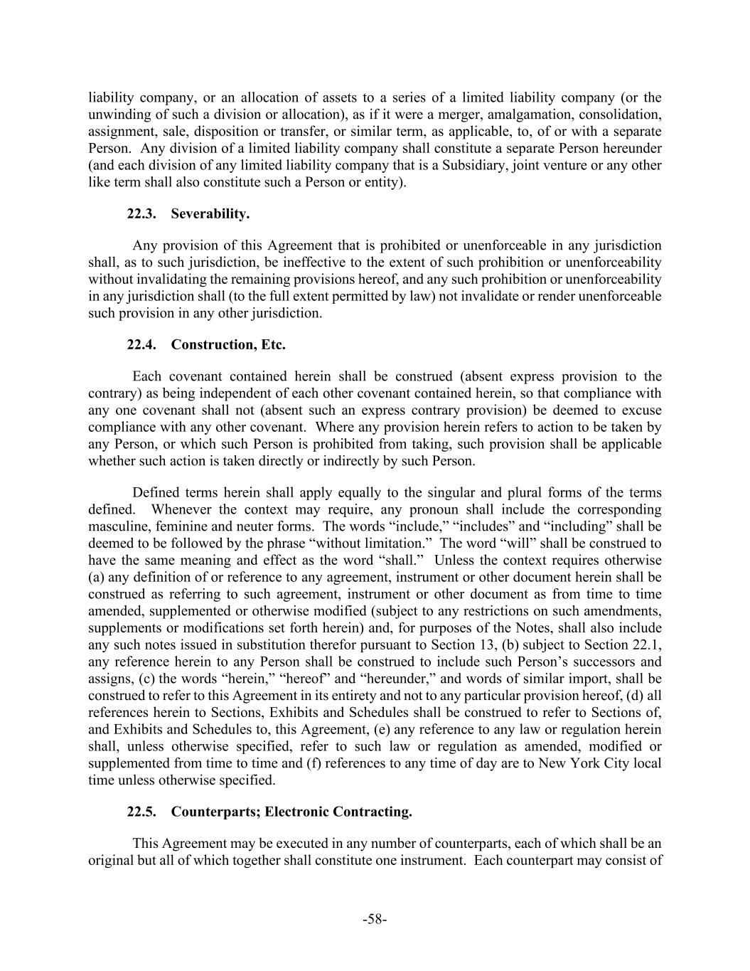 -58- liability company, or an allocation of assets to a series of a limited liability company (or the unwinding of such a division or allocation), as if it were a merger, amalgamation, consolidation, assignment, sale, disposition or transfer, or similar term, as applicable, to, of or with a separate Person. Any division of a limited liability company shall constitute a separate Person hereunder (and each division of any limited liability company that is a Subsidiary, joint venture or any other like term shall also constitute such a Person or entity). 22.3. Severability. Any provision of this Agreement that is prohibited or unenforceable in any jurisdiction shall, as to such jurisdiction, be ineffective to the extent of such prohibition or unenforceability without invalidating the remaining provisions hereof, and any such prohibition or unenforceability in any jurisdiction shall (to the full extent permitted by law) not invalidate or render unenforceable such provision in any other jurisdiction. 22.4. Construction, Etc. Each covenant contained herein shall be construed (absent express provision to the contrary) as being independent of each other covenant contained herein, so that compliance with any one covenant shall not (absent such an express contrary provision) be deemed to excuse compliance with any other covenant. Where any provision herein refers to action to be taken by any Person, or which such Person is prohibited from taking, such provision shall be applicable whether such action is taken directly or indirectly by such Person. Defined terms herein shall apply equally to the singular and plural forms of the terms defined. Whenever the context may require, any pronoun shall include the corresponding masculine, feminine and neuter forms. The words “include,” “includes” and “including” shall be deemed to be followed by the phrase “without limitation.” The word “will” shall be construed to have the same meaning and effect as the word “shall.” Unless the context requires otherwise (a) any definition of or reference to any agreement, instrument or other document herein shall be construed as referring to such agreement, instrument or other document as from time to time amended, supplemented or otherwise modified (subject to any restrictions on such amendments, supplements or modifications set forth herein) and, for purposes of the Notes, shall also include any such notes issued in substitution therefor pursuant to Section 13, (b) subject to Section 22.1, any reference herein to any Person shall be construed to include such Person’s successors and assigns, (c) the words “herein,” “hereof” and “hereunder,” and words of similar import, shall be construed to refer to this Agreement in its entirety and not to any particular provision hereof, (d) all references herein to Sections, Exhibits and Schedules shall be construed to refer to Sections of, and Exhibits and Schedules to, this Agreement, (e) any reference to any law or regulation herein shall, unless otherwise specified, refer to such law or regulation as amended, modified or supplemented from time to time and (f) references to any time of day are to New York City local time unless otherwise specified. 22.5. Counterparts; Electronic Contracting. This Agreement may be executed in any number of counterparts, each of which shall be an original but all of which together shall constitute one instrument. Each counterpart may consist of