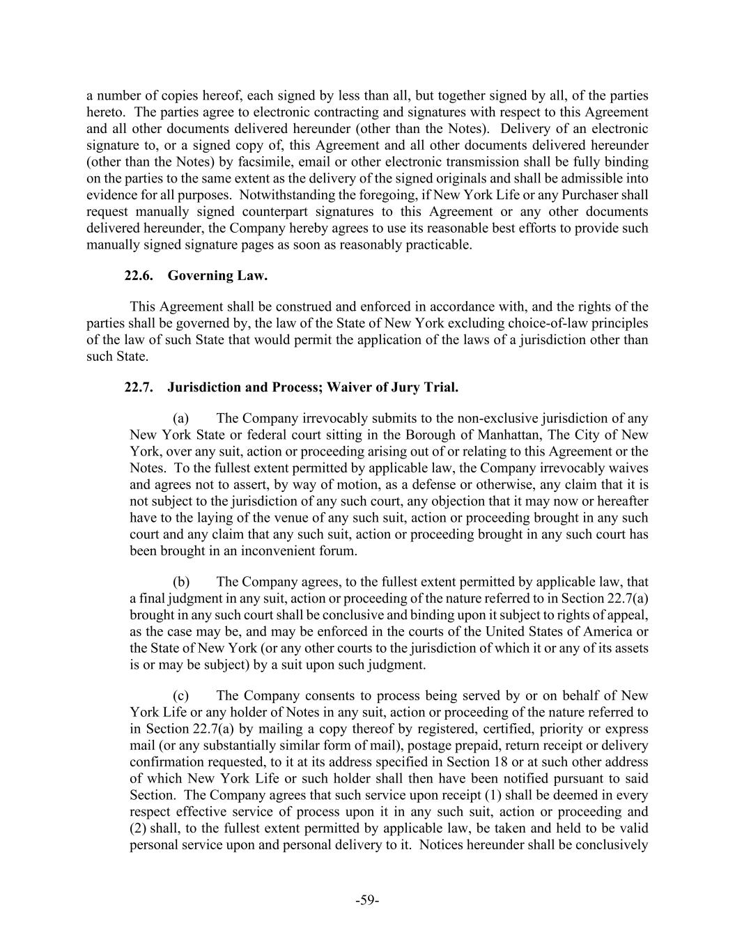 -59- a number of copies hereof, each signed by less than all, but together signed by all, of the parties hereto. The parties agree to electronic contracting and signatures with respect to this Agreement and all other documents delivered hereunder (other than the Notes). Delivery of an electronic signature to, or a signed copy of, this Agreement and all other documents delivered hereunder (other than the Notes) by facsimile, email or other electronic transmission shall be fully binding on the parties to the same extent as the delivery of the signed originals and shall be admissible into evidence for all purposes. Notwithstanding the foregoing, if New York Life or any Purchaser shall request manually signed counterpart signatures to this Agreement or any other documents delivered hereunder, the Company hereby agrees to use its reasonable best efforts to provide such manually signed signature pages as soon as reasonably practicable. 22.6. Governing Law. This Agreement shall be construed and enforced in accordance with, and the rights of the parties shall be governed by, the law of the State of New York excluding choice-of-law principles of the law of such State that would permit the application of the laws of a jurisdiction other than such State. 22.7. Jurisdiction and Process; Waiver of Jury Trial. (a) The Company irrevocably submits to the non-exclusive jurisdiction of any New York State or federal court sitting in the Borough of Manhattan, The City of New York, over any suit, action or proceeding arising out of or relating to this Agreement or the Notes. To the fullest extent permitted by applicable law, the Company irrevocably waives and agrees not to assert, by way of motion, as a defense or otherwise, any claim that it is not subject to the jurisdiction of any such court, any objection that it may now or hereafter have to the laying of the venue of any such suit, action or proceeding brought in any such court and any claim that any such suit, action or proceeding brought in any such court has been brought in an inconvenient forum. (b) The Company agrees, to the fullest extent permitted by applicable law, that a final judgment in any suit, action or proceeding of the nature referred to in Section 22.7(a) brought in any such court shall be conclusive and binding upon it subject to rights of appeal, as the case may be, and may be enforced in the courts of the United States of America or the State of New York (or any other courts to the jurisdiction of which it or any of its assets is or may be subject) by a suit upon such judgment. (c) The Company consents to process being served by or on behalf of New York Life or any holder of Notes in any suit, action or proceeding of the nature referred to in Section 22.7(a) by mailing a copy thereof by registered, certified, priority or express mail (or any substantially similar form of mail), postage prepaid, return receipt or delivery confirmation requested, to it at its address specified in Section 18 or at such other address of which New York Life or such holder shall then have been notified pursuant to said Section. The Company agrees that such service upon receipt (1) shall be deemed in every respect effective service of process upon it in any such suit, action or proceeding and (2) shall, to the fullest extent permitted by applicable law, be taken and held to be valid personal service upon and personal delivery to it. Notices hereunder shall be conclusively