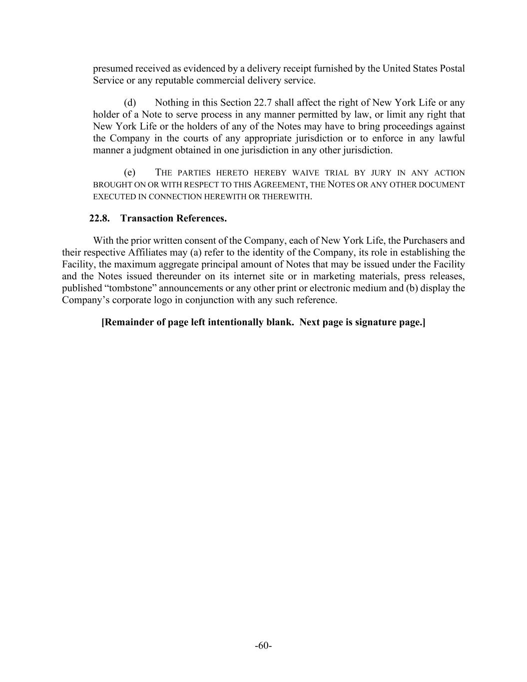 -60- presumed received as evidenced by a delivery receipt furnished by the United States Postal Service or any reputable commercial delivery service. (d) Nothing in this Section 22.7 shall affect the right of New York Life or any holder of a Note to serve process in any manner permitted by law, or limit any right that New York Life or the holders of any of the Notes may have to bring proceedings against the Company in the courts of any appropriate jurisdiction or to enforce in any lawful manner a judgment obtained in one jurisdiction in any other jurisdiction. (e) THE PARTIES HERETO HEREBY WAIVE TRIAL BY JURY IN ANY ACTION BROUGHT ON OR WITH RESPECT TO THIS AGREEMENT, THE NOTES OR ANY OTHER DOCUMENT EXECUTED IN CONNECTION HEREWITH OR THEREWITH. 22.8. Transaction References. With the prior written consent of the Company, each of New York Life, the Purchasers and their respective Affiliates may (a) refer to the identity of the Company, its role in establishing the Facility, the maximum aggregate principal amount of Notes that may be issued under the Facility and the Notes issued thereunder on its internet site or in marketing materials, press releases, published “tombstone” announcements or any other print or electronic medium and (b) display the Company’s corporate logo in conjunction with any such reference. [Remainder of page left intentionally blank. Next page is signature page.]