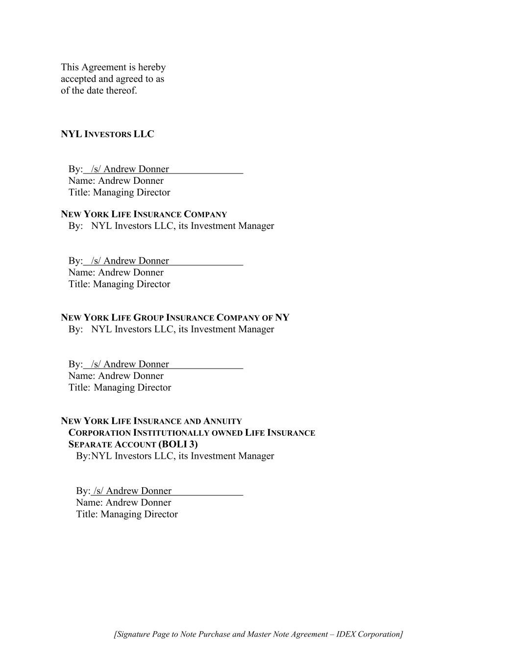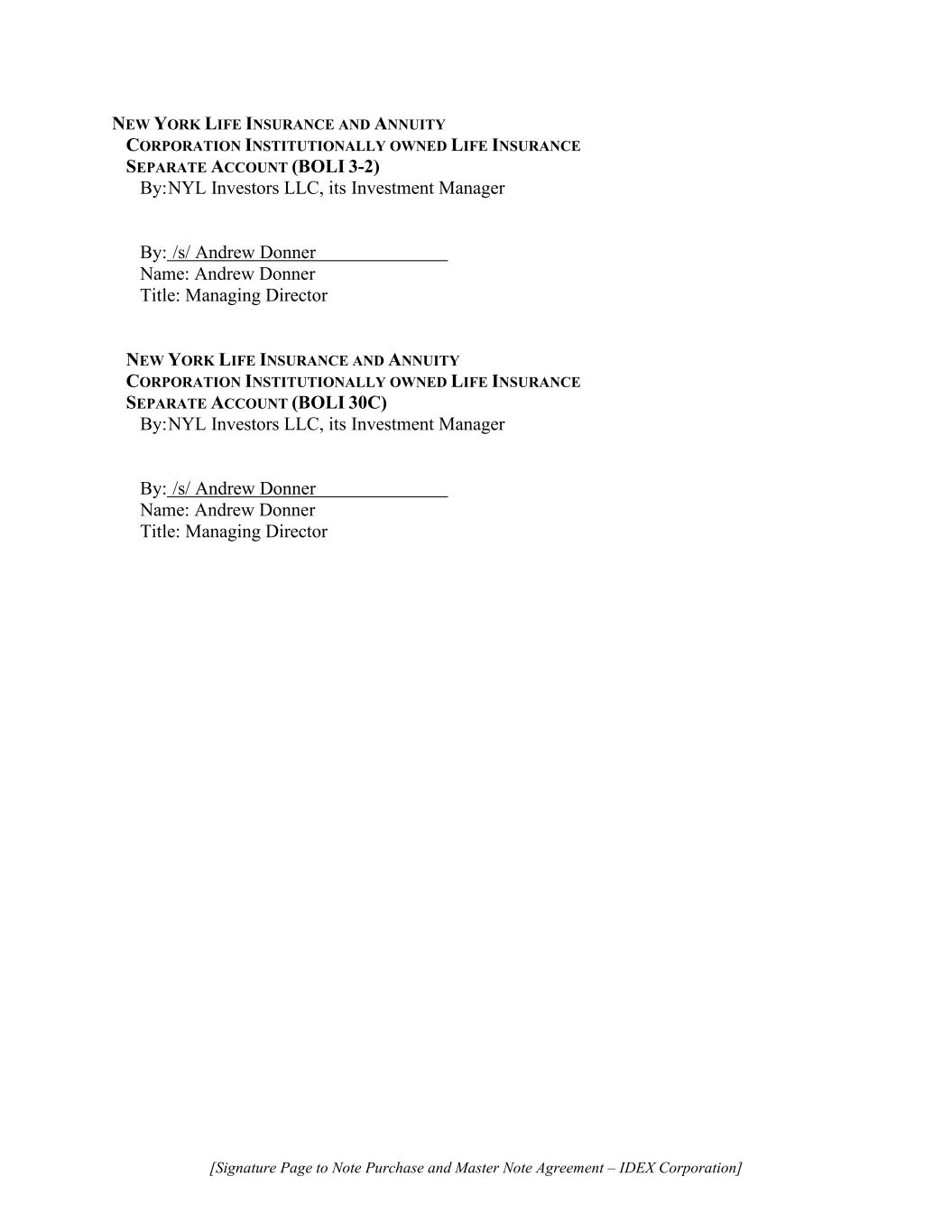 [Signature Page to Note Purchase and Master Note Agreement – IDEX Corporation] NEW YORK LIFE INSURANCE AND ANNUITY CORPORATION INSTITUTIONALLY OWNED LIFE INSURANCE SEPARATE ACCOUNT (BOLI 3-2) By: NYL Investors LLC, its Investment Manager By: /s/ Andrew Donner Name: Andrew Donner Title: Managing Director NEW YORK LIFE INSURANCE AND ANNUITY CORPORATION INSTITUTIONALLY OWNED LIFE INSURANCE SEPARATE ACCOUNT (BOLI 30C) By: NYL Investors LLC, its Investment Manager By: /s/ Andrew Donner Name: Andrew Donner Title: Managing Director