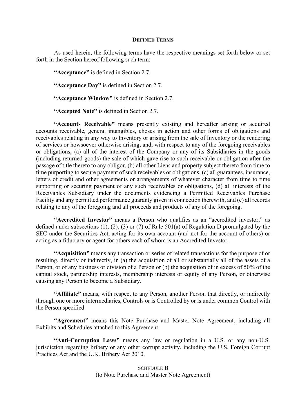 SCHEDULE B (to Note Purchase and Master Note Agreement) DEFINED TERMS As used herein, the following terms have the respective meanings set forth below or set forth in the Section hereof following such term: “Acceptance” is defined in Section 2.7. “Acceptance Day” is defined in Section 2.7. “Acceptance Window” is defined in Section 2.7. “Accepted Note” is defined in Section 2.7. “Accounts Receivable” means presently existing and hereafter arising or acquired accounts receivable, general intangibles, choses in action and other forms of obligations and receivables relating in any way to Inventory or arising from the sale of Inventory or the rendering of services or howsoever otherwise arising, and, with respect to any of the foregoing receivables or obligations, (a) all of the interest of the Company or any of its Subsidiaries in the goods (including returned goods) the sale of which gave rise to such receivable or obligation after the passage of title thereto to any obligor, (b) all other Liens and property subject thereto from time to time purporting to secure payment of such receivables or obligations, (c) all guarantees, insurance, letters of credit and other agreements or arrangements of whatever character from time to time supporting or securing payment of any such receivables or obligations, (d) all interests of the Receivables Subsidiary under the documents evidencing a Permitted Receivables Purchase Facility and any permitted performance guaranty given in connection therewith, and (e) all records relating to any of the foregoing and all proceeds and products of any of the foregoing. “Accredited Investor” means a Person who qualifies as an “accredited investor,” as defined under subsections (1), (2), (3) or (7) of Rule 501(a) of Regulation D promulgated by the SEC under the Securities Act, acting for its own account (and not for the account of others) or acting as a fiduciary or agent for others each of whom is an Accredited Investor. “Acquisition” means any transaction or series of related transactions for the purpose of or resulting, directly or indirectly, in (a) the acquisition of all or substantially all of the assets of a Person, or of any business or division of a Person or (b) the acquisition of in excess of 50% of the capital stock, partnership interests, membership interests or equity of any Person, or otherwise causing any Person to become a Subsidiary. “Affiliate” means, with respect to any Person, another Person that directly, or indirectly through one or more intermediaries, Controls or is Controlled by or is under common Control with the Person specified. “Agreement” means this Note Purchase and Master Note Agreement, including all Exhibits and Schedules attached to this Agreement. “Anti-Corruption Laws” means any law or regulation in a U.S. or any non-U.S. jurisdiction regarding bribery or any other corrupt activity, including the U.S. Foreign Corrupt Practices Act and the U.K. Bribery Act 2010.