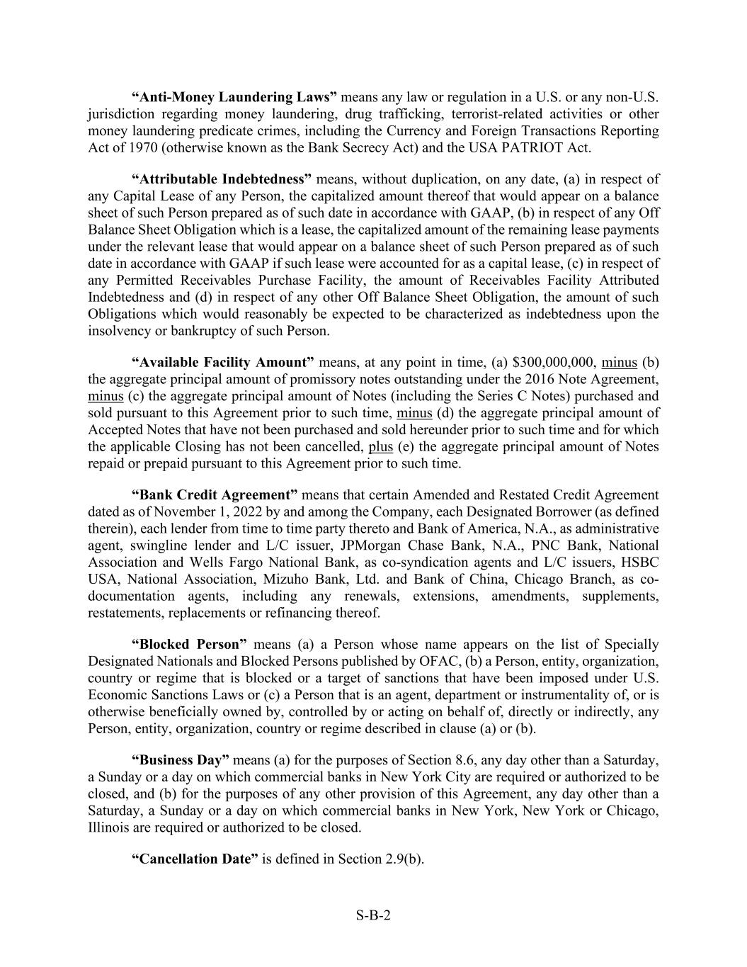 S-B-2 “Anti-Money Laundering Laws” means any law or regulation in a U.S. or any non-U.S. jurisdiction regarding money laundering, drug trafficking, terrorist-related activities or other money laundering predicate crimes, including the Currency and Foreign Transactions Reporting Act of 1970 (otherwise known as the Bank Secrecy Act) and the USA PATRIOT Act. “Attributable Indebtedness” means, without duplication, on any date, (a) in respect of any Capital Lease of any Person, the capitalized amount thereof that would appear on a balance sheet of such Person prepared as of such date in accordance with GAAP, (b) in respect of any Off Balance Sheet Obligation which is a lease, the capitalized amount of the remaining lease payments under the relevant lease that would appear on a balance sheet of such Person prepared as of such date in accordance with GAAP if such lease were accounted for as a capital lease, (c) in respect of any Permitted Receivables Purchase Facility, the amount of Receivables Facility Attributed Indebtedness and (d) in respect of any other Off Balance Sheet Obligation, the amount of such Obligations which would reasonably be expected to be characterized as indebtedness upon the insolvency or bankruptcy of such Person. “Available Facility Amount” means, at any point in time, (a) $300,000,000, minus (b) the aggregate principal amount of promissory notes outstanding under the 2016 Note Agreement, minus (c) the aggregate principal amount of Notes (including the Series C Notes) purchased and sold pursuant to this Agreement prior to such time, minus (d) the aggregate principal amount of Accepted Notes that have not been purchased and sold hereunder prior to such time and for which the applicable Closing has not been cancelled, plus (e) the aggregate principal amount of Notes repaid or prepaid pursuant to this Agreement prior to such time. “Bank Credit Agreement” means that certain Amended and Restated Credit Agreement dated as of November 1, 2022 by and among the Company, each Designated Borrower (as defined therein), each lender from time to time party thereto and Bank of America, N.A., as administrative agent, swingline lender and L/C issuer, JPMorgan Chase Bank, N.A., PNC Bank, National Association and Wells Fargo National Bank, as co-syndication agents and L/C issuers, HSBC USA, National Association, Mizuho Bank, Ltd. and Bank of China, Chicago Branch, as co- documentation agents, including any renewals, extensions, amendments, supplements, restatements, replacements or refinancing thereof. “Blocked Person” means (a) a Person whose name appears on the list of Specially Designated Nationals and Blocked Persons published by OFAC, (b) a Person, entity, organization, country or regime that is blocked or a target of sanctions that have been imposed under U.S. Economic Sanctions Laws or (c) a Person that is an agent, department or instrumentality of, or is otherwise beneficially owned by, controlled by or acting on behalf of, directly or indirectly, any Person, entity, organization, country or regime described in clause (a) or (b). “Business Day” means (a) for the purposes of Section 8.6, any day other than a Saturday, a Sunday or a day on which commercial banks in New York City are required or authorized to be closed, and (b) for the purposes of any other provision of this Agreement, any day other than a Saturday, a Sunday or a day on which commercial banks in New York, New York or Chicago, Illinois are required or authorized to be closed. “Cancellation Date” is defined in Section 2.9(b).