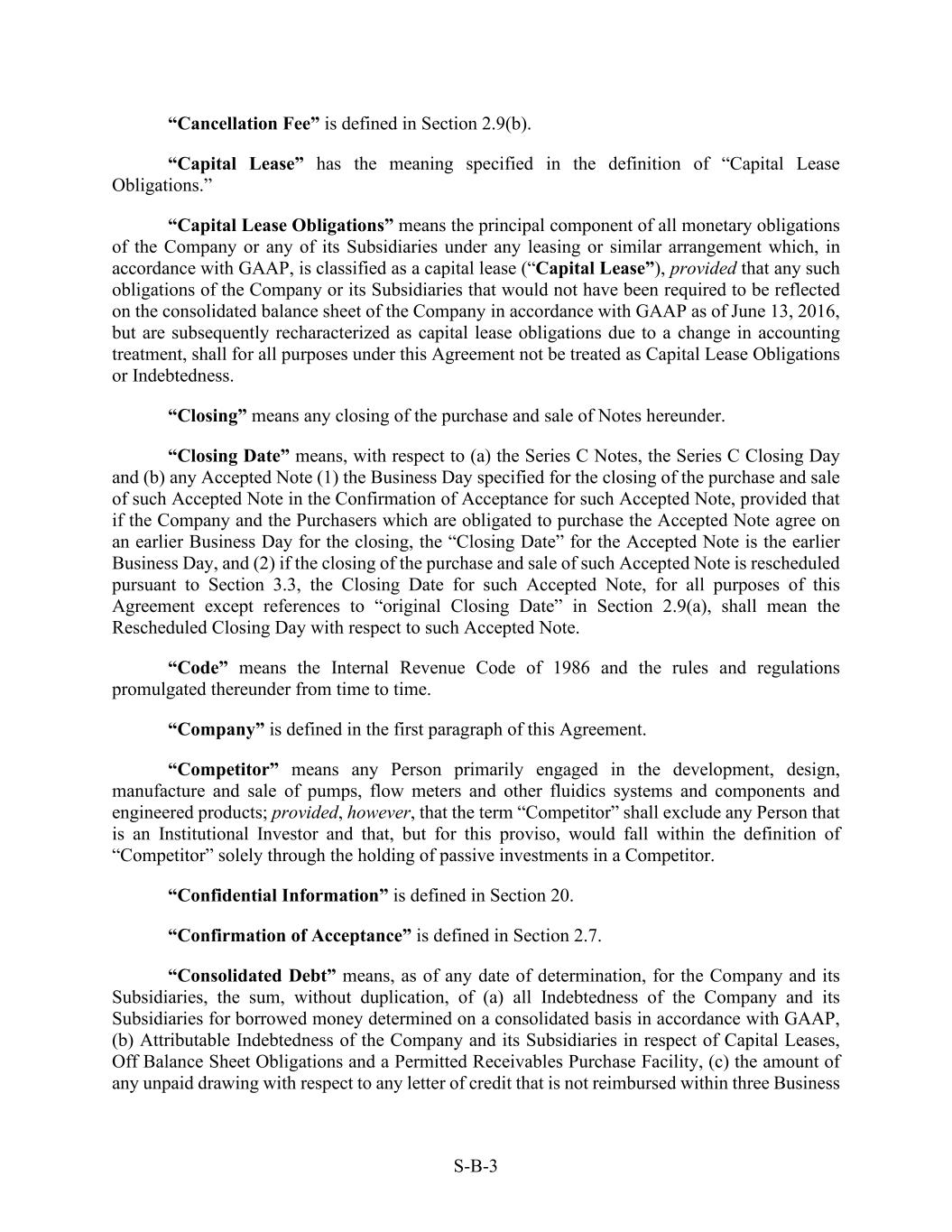 S-B-3 “Cancellation Fee” is defined in Section 2.9(b). “Capital Lease” has the meaning specified in the definition of “Capital Lease Obligations.” “Capital Lease Obligations” means the principal component of all monetary obligations of the Company or any of its Subsidiaries under any leasing or similar arrangement which, in accordance with GAAP, is classified as a capital lease (“Capital Lease”), provided that any such obligations of the Company or its Subsidiaries that would not have been required to be reflected on the consolidated balance sheet of the Company in accordance with GAAP as of June 13, 2016, but are subsequently recharacterized as capital lease obligations due to a change in accounting treatment, shall for all purposes under this Agreement not be treated as Capital Lease Obligations or Indebtedness. “Closing” means any closing of the purchase and sale of Notes hereunder. “Closing Date” means, with respect to (a) the Series C Notes, the Series C Closing Day and (b) any Accepted Note (1) the Business Day specified for the closing of the purchase and sale of such Accepted Note in the Confirmation of Acceptance for such Accepted Note, provided that if the Company and the Purchasers which are obligated to purchase the Accepted Note agree on an earlier Business Day for the closing, the “Closing Date” for the Accepted Note is the earlier Business Day, and (2) if the closing of the purchase and sale of such Accepted Note is rescheduled pursuant to Section 3.3, the Closing Date for such Accepted Note, for all purposes of this Agreement except references to “original Closing Date” in Section 2.9(a), shall mean the Rescheduled Closing Day with respect to such Accepted Note. “Code” means the Internal Revenue Code of 1986 and the rules and regulations promulgated thereunder from time to time. “Company” is defined in the first paragraph of this Agreement. “Competitor” means any Person primarily engaged in the development, design, manufacture and sale of pumps, flow meters and other fluidics systems and components and engineered products; provided, however, that the term “Competitor” shall exclude any Person that is an Institutional Investor and that, but for this proviso, would fall within the definition of “Competitor” solely through the holding of passive investments in a Competitor. “Confidential Information” is defined in Section 20. “Confirmation of Acceptance” is defined in Section 2.7. “Consolidated Debt” means, as of any date of determination, for the Company and its Subsidiaries, the sum, without duplication, of (a) all Indebtedness of the Company and its Subsidiaries for borrowed money determined on a consolidated basis in accordance with GAAP, (b) Attributable Indebtedness of the Company and its Subsidiaries in respect of Capital Leases, Off Balance Sheet Obligations and a Permitted Receivables Purchase Facility, (c) the amount of any unpaid drawing with respect to any letter of credit that is not reimbursed within three Business