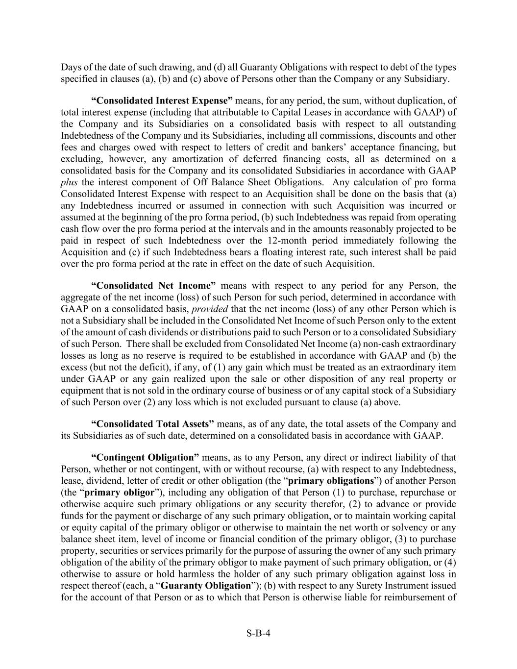 S-B-4 Days of the date of such drawing, and (d) all Guaranty Obligations with respect to debt of the types specified in clauses (a), (b) and (c) above of Persons other than the Company or any Subsidiary. “Consolidated Interest Expense” means, for any period, the sum, without duplication, of total interest expense (including that attributable to Capital Leases in accordance with GAAP) of the Company and its Subsidiaries on a consolidated basis with respect to all outstanding Indebtedness of the Company and its Subsidiaries, including all commissions, discounts and other fees and charges owed with respect to letters of credit and bankers’ acceptance financing, but excluding, however, any amortization of deferred financing costs, all as determined on a consolidated basis for the Company and its consolidated Subsidiaries in accordance with GAAP plus the interest component of Off Balance Sheet Obligations. Any calculation of pro forma Consolidated Interest Expense with respect to an Acquisition shall be done on the basis that (a) any Indebtedness incurred or assumed in connection with such Acquisition was incurred or assumed at the beginning of the pro forma period, (b) such Indebtedness was repaid from operating cash flow over the pro forma period at the intervals and in the amounts reasonably projected to be paid in respect of such Indebtedness over the 12-month period immediately following the Acquisition and (c) if such Indebtedness bears a floating interest rate, such interest shall be paid over the pro forma period at the rate in effect on the date of such Acquisition. “Consolidated Net Income” means with respect to any period for any Person, the aggregate of the net income (loss) of such Person for such period, determined in accordance with GAAP on a consolidated basis, provided that the net income (loss) of any other Person which is not a Subsidiary shall be included in the Consolidated Net Income of such Person only to the extent of the amount of cash dividends or distributions paid to such Person or to a consolidated Subsidiary of such Person. There shall be excluded from Consolidated Net Income (a) non-cash extraordinary losses as long as no reserve is required to be established in accordance with GAAP and (b) the excess (but not the deficit), if any, of (1) any gain which must be treated as an extraordinary item under GAAP or any gain realized upon the sale or other disposition of any real property or equipment that is not sold in the ordinary course of business or of any capital stock of a Subsidiary of such Person over (2) any loss which is not excluded pursuant to clause (a) above. “Consolidated Total Assets” means, as of any date, the total assets of the Company and its Subsidiaries as of such date, determined on a consolidated basis in accordance with GAAP. “Contingent Obligation” means, as to any Person, any direct or indirect liability of that Person, whether or not contingent, with or without recourse, (a) with respect to any Indebtedness, lease, dividend, letter of credit or other obligation (the “primary obligations”) of another Person (the “primary obligor”), including any obligation of that Person (1) to purchase, repurchase or otherwise acquire such primary obligations or any security therefor, (2) to advance or provide funds for the payment or discharge of any such primary obligation, or to maintain working capital or equity capital of the primary obligor or otherwise to maintain the net worth or solvency or any balance sheet item, level of income or financial condition of the primary obligor, (3) to purchase property, securities or services primarily for the purpose of assuring the owner of any such primary obligation of the ability of the primary obligor to make payment of such primary obligation, or (4) otherwise to assure or hold harmless the holder of any such primary obligation against loss in respect thereof (each, a “Guaranty Obligation”); (b) with respect to any Surety Instrument issued for the account of that Person or as to which that Person is otherwise liable for reimbursement of