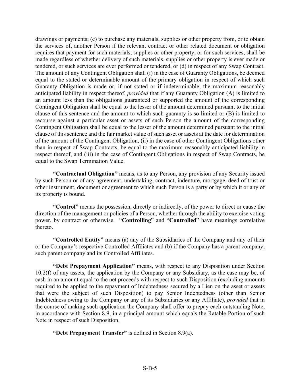S-B-5 drawings or payments; (c) to purchase any materials, supplies or other property from, or to obtain the services of, another Person if the relevant contract or other related document or obligation requires that payment for such materials, supplies or other property, or for such services, shall be made regardless of whether delivery of such materials, supplies or other property is ever made or tendered, or such services are ever performed or tendered, or (d) in respect of any Swap Contract. The amount of any Contingent Obligation shall (i) in the case of Guaranty Obligations, be deemed equal to the stated or determinable amount of the primary obligation in respect of which such Guaranty Obligation is made or, if not stated or if indeterminable, the maximum reasonably anticipated liability in respect thereof, provided that if any Guaranty Obligation (A) is limited to an amount less than the obligations guaranteed or supported the amount of the corresponding Contingent Obligation shall be equal to the lesser of the amount determined pursuant to the initial clause of this sentence and the amount to which such guaranty is so limited or (B) is limited to recourse against a particular asset or assets of such Person the amount of the corresponding Contingent Obligation shall be equal to the lesser of the amount determined pursuant to the initial clause of this sentence and the fair market value of such asset or assets at the date for determination of the amount of the Contingent Obligation, (ii) in the case of other Contingent Obligations other than in respect of Swap Contracts, be equal to the maximum reasonably anticipated liability in respect thereof, and (iii) in the case of Contingent Obligations in respect of Swap Contracts, be equal to the Swap Termination Value. “Contractual Obligation” means, as to any Person, any provision of any Security issued by such Person or of any agreement, undertaking, contract, indenture, mortgage, deed of trust or other instrument, document or agreement to which such Person is a party or by which it or any of its property is bound. “Control” means the possession, directly or indirectly, of the power to direct or cause the direction of the management or policies of a Person, whether through the ability to exercise voting power, by contract or otherwise. “Controlling” and “Controlled” have meanings correlative thereto. “Controlled Entity” means (a) any of the Subsidiaries of the Company and any of their or the Company’s respective Controlled Affiliates and (b) if the Company has a parent company, such parent company and its Controlled Affiliates. “Debt Prepayment Application” means, with respect to any Disposition under Section 10.2(f) of any assets, the application by the Company or any Subsidiary, as the case may be, of cash in an amount equal to the net proceeds with respect to such Disposition (excluding amounts required to be applied to the repayment of Indebtedness secured by a Lien on the asset or assets that were the subject of such Disposition) to pay Senior Indebtedness (other than Senior Indebtedness owing to the Company or any of its Subsidiaries or any Affiliate), provided that in the course of making such application the Company shall offer to prepay each outstanding Note, in accordance with Section 8.9, in a principal amount which equals the Ratable Portion of such Note in respect of such Disposition. “Debt Prepayment Transfer” is defined in Section 8.9(a).