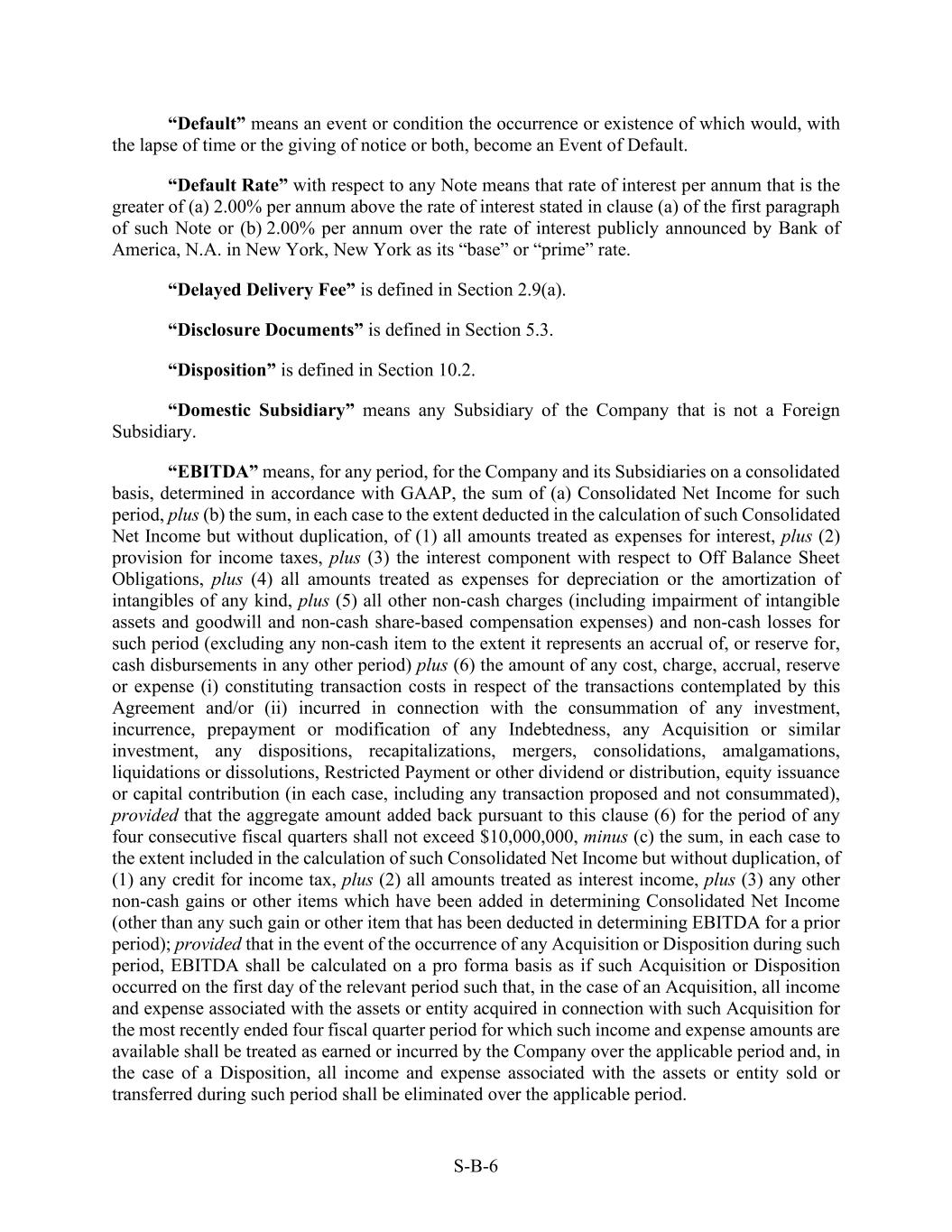 S-B-6 “Default” means an event or condition the occurrence or existence of which would, with the lapse of time or the giving of notice or both, become an Event of Default. “Default Rate” with respect to any Note means that rate of interest per annum that is the greater of (a) 2.00% per annum above the rate of interest stated in clause (a) of the first paragraph of such Note or (b) 2.00% per annum over the rate of interest publicly announced by Bank of America, N.A. in New York, New York as its “base” or “prime” rate. “Delayed Delivery Fee” is defined in Section 2.9(a). “Disclosure Documents” is defined in Section 5.3. “Disposition” is defined in Section 10.2. “Domestic Subsidiary” means any Subsidiary of the Company that is not a Foreign Subsidiary. “EBITDA” means, for any period, for the Company and its Subsidiaries on a consolidated basis, determined in accordance with GAAP, the sum of (a) Consolidated Net Income for such period, plus (b) the sum, in each case to the extent deducted in the calculation of such Consolidated Net Income but without duplication, of (1) all amounts treated as expenses for interest, plus (2) provision for income taxes, plus (3) the interest component with respect to Off Balance Sheet Obligations, plus (4) all amounts treated as expenses for depreciation or the amortization of intangibles of any kind, plus (5) all other non-cash charges (including impairment of intangible assets and goodwill and non-cash share-based compensation expenses) and non-cash losses for such period (excluding any non-cash item to the extent it represents an accrual of, or reserve for, cash disbursements in any other period) plus (6) the amount of any cost, charge, accrual, reserve or expense (i) constituting transaction costs in respect of the transactions contemplated by this Agreement and/or (ii) incurred in connection with the consummation of any investment, incurrence, prepayment or modification of any Indebtedness, any Acquisition or similar investment, any dispositions, recapitalizations, mergers, consolidations, amalgamations, liquidations or dissolutions, Restricted Payment or other dividend or distribution, equity issuance or capital contribution (in each case, including any transaction proposed and not consummated), provided that the aggregate amount added back pursuant to this clause (6) for the period of any four consecutive fiscal quarters shall not exceed $10,000,000, minus (c) the sum, in each case to the extent included in the calculation of such Consolidated Net Income but without duplication, of (1) any credit for income tax, plus (2) all amounts treated as interest income, plus (3) any other non-cash gains or other items which have been added in determining Consolidated Net Income (other than any such gain or other item that has been deducted in determining EBITDA for a prior period); provided that in the event of the occurrence of any Acquisition or Disposition during such period, EBITDA shall be calculated on a pro forma basis as if such Acquisition or Disposition occurred on the first day of the relevant period such that, in the case of an Acquisition, all income and expense associated with the assets or entity acquired in connection with such Acquisition for the most recently ended four fiscal quarter period for which such income and expense amounts are available shall be treated as earned or incurred by the Company over the applicable period and, in the case of a Disposition, all income and expense associated with the assets or entity sold or transferred during such period shall be eliminated over the applicable period.