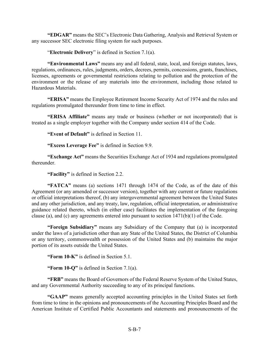 S-B-7 “EDGAR” means the SEC’s Electronic Data Gathering, Analysis and Retrieval System or any successor SEC electronic filing system for such purposes. “Electronic Delivery” is defined in Section 7.1(a). “Environmental Laws” means any and all federal, state, local, and foreign statutes, laws, regulations, ordinances, rules, judgments, orders, decrees, permits, concessions, grants, franchises, licenses, agreements or governmental restrictions relating to pollution and the protection of the environment or the release of any materials into the environment, including those related to Hazardous Materials. “ERISA” means the Employee Retirement Income Security Act of 1974 and the rules and regulations promulgated thereunder from time to time in effect. “ERISA Affiliate” means any trade or business (whether or not incorporated) that is treated as a single employer together with the Company under section 414 of the Code. “Event of Default” is defined in Section 11. “Excess Leverage Fee” is defined in Section 9.9. “Exchange Act” means the Securities Exchange Act of 1934 and regulations promulgated thereunder. “Facility” is defined in Section 2.2. “FATCA” means (a) sections 1471 through 1474 of the Code, as of the date of this Agreement (or any amended or successor version), together with any current or future regulations or official interpretations thereof, (b) any intergovernmental agreement between the United States and any other jurisdiction, and any treaty, law, regulation, official interpretation, or administrative guidance related thereto, which (in either case) facilitates the implementation of the foregoing clause (a), and (c) any agreements entered into pursuant to section 1471(b)(1) of the Code. “Foreign Subsidiary” means any Subsidiary of the Company that (a) is incorporated under the laws of a jurisdiction other than any State of the United States, the District of Columbia or any territory, commonwealth or possession of the United States and (b) maintains the major portion of its assets outside the United States. “Form 10-K” is defined in Section 5.1. “Form 10-Q” is defined in Section 7.1(a). “FRB” means the Board of Governors of the Federal Reserve System of the United States, and any Governmental Authority succeeding to any of its principal functions. “GAAP” means generally accepted accounting principles in the United States set forth from time to time in the opinions and pronouncements of the Accounting Principles Board and the American Institute of Certified Public Accountants and statements and pronouncements of the